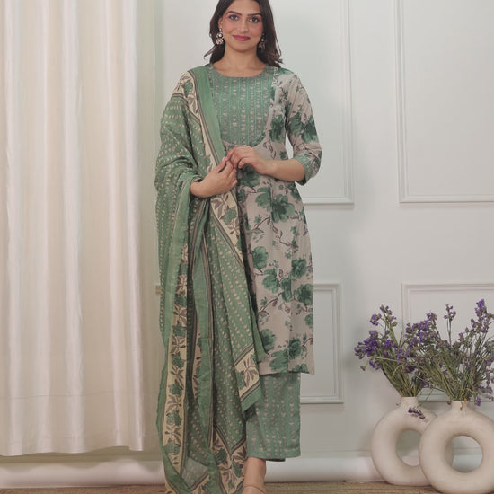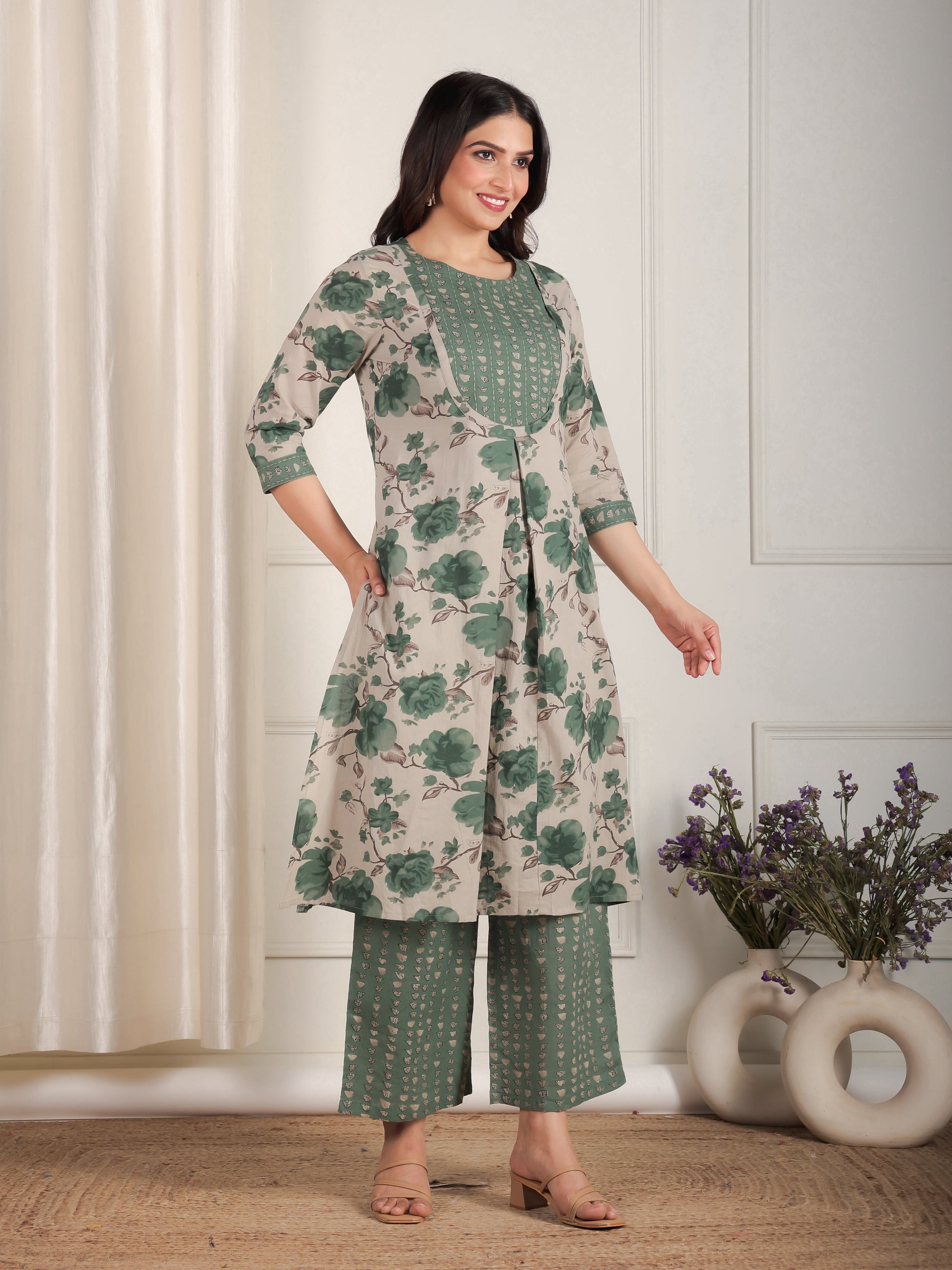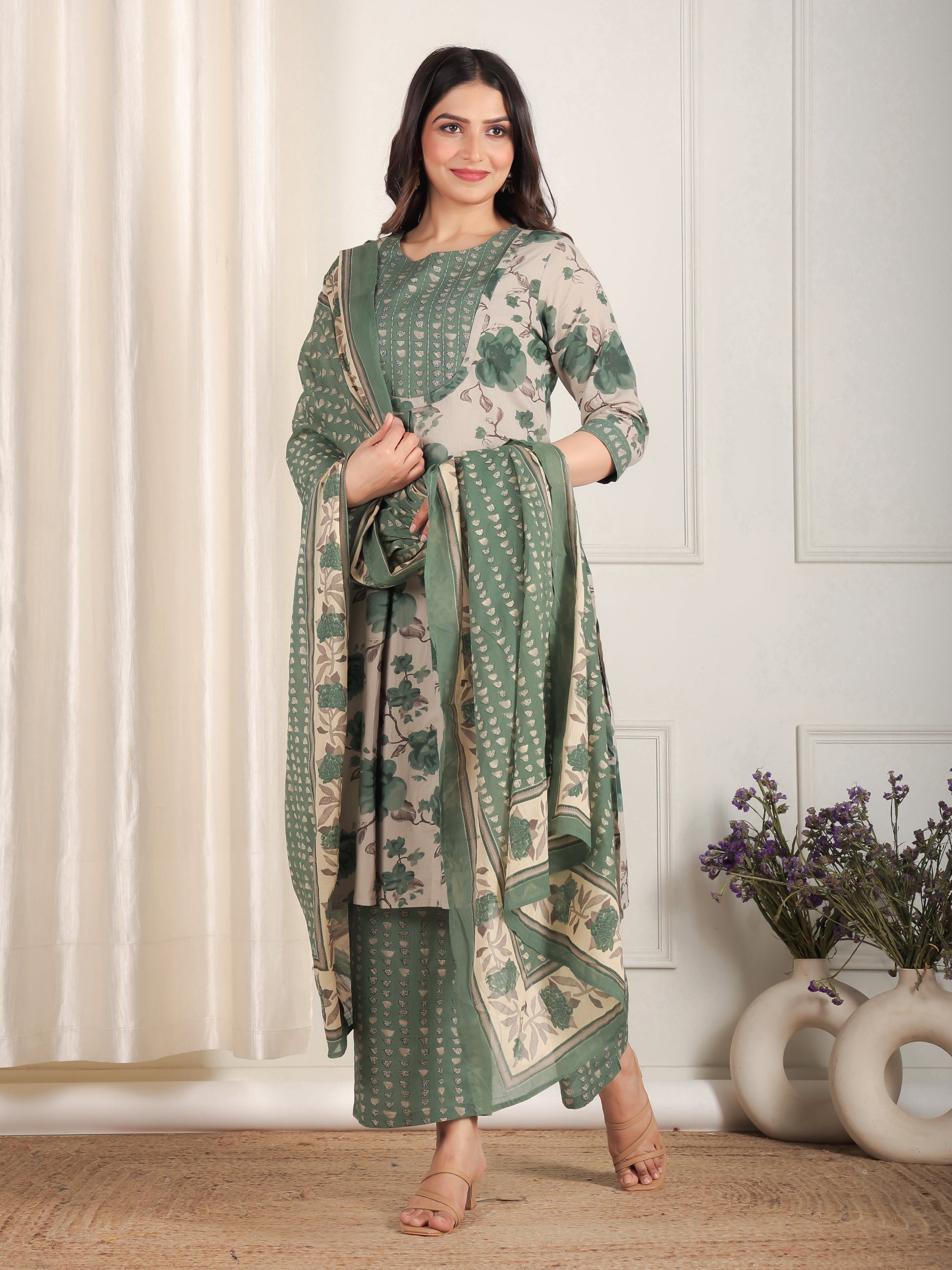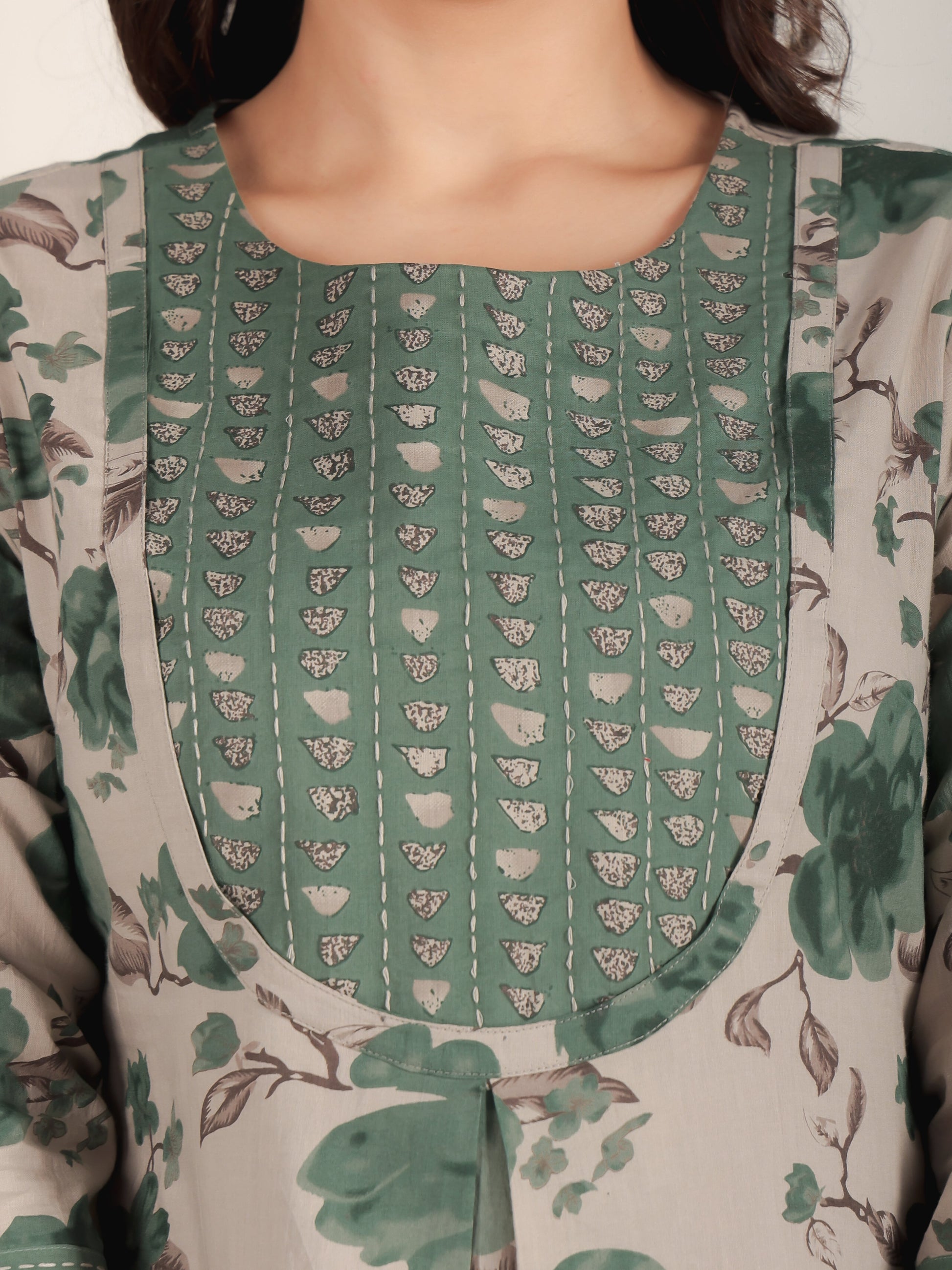 This Grey A-line kurta in soft Soft Cotton is a timeless pick for festive and casual wear. Designed with a Round neckline and 3/4 Sleeve sleeves, its graceful Calf Length cut flatters all body types. The delicate Floral detailing adds a touch of sophistication. Pair it with statement earrings and juttis for a polished look. Maintain its pristine look by following proper care instructions.