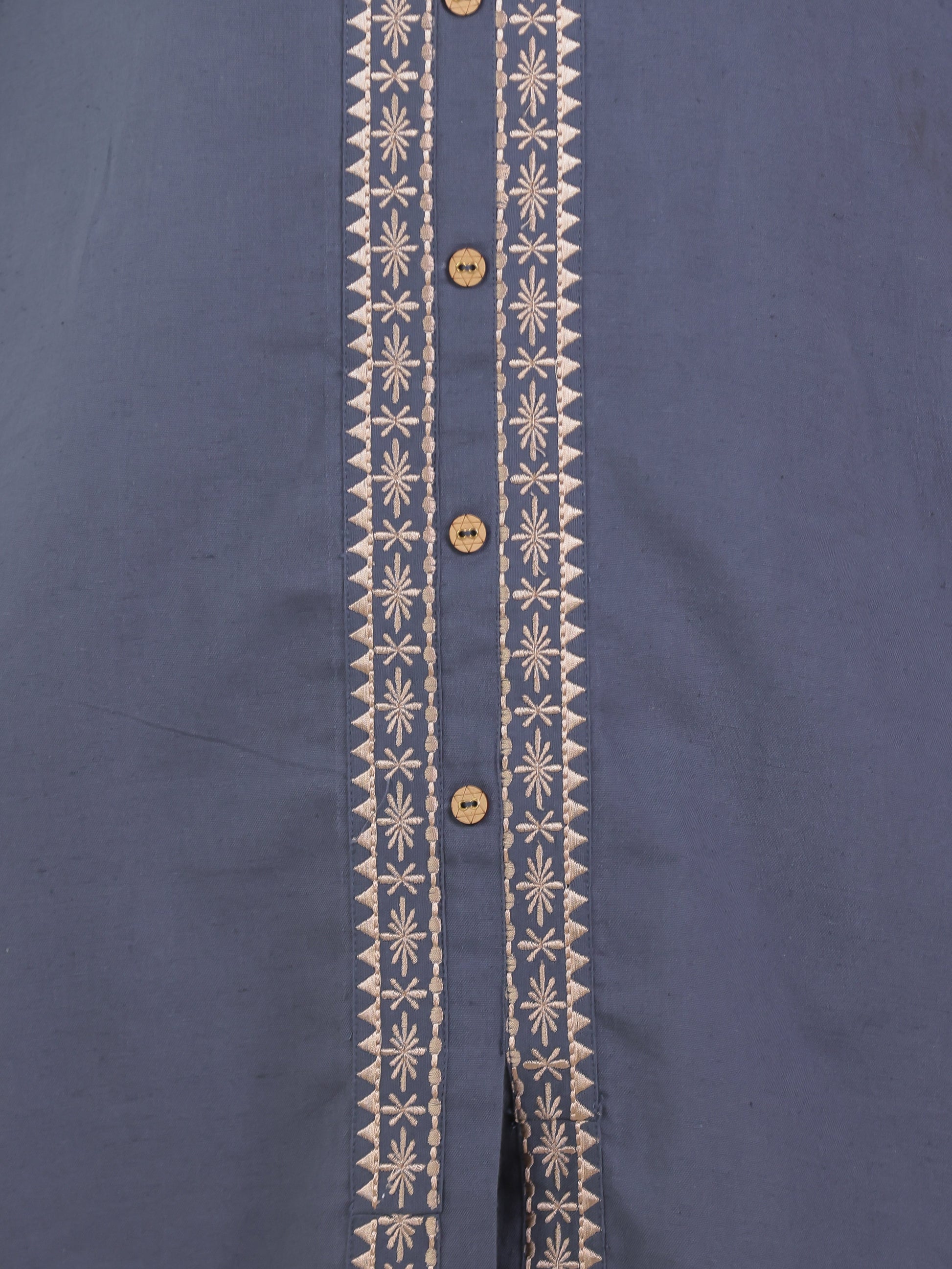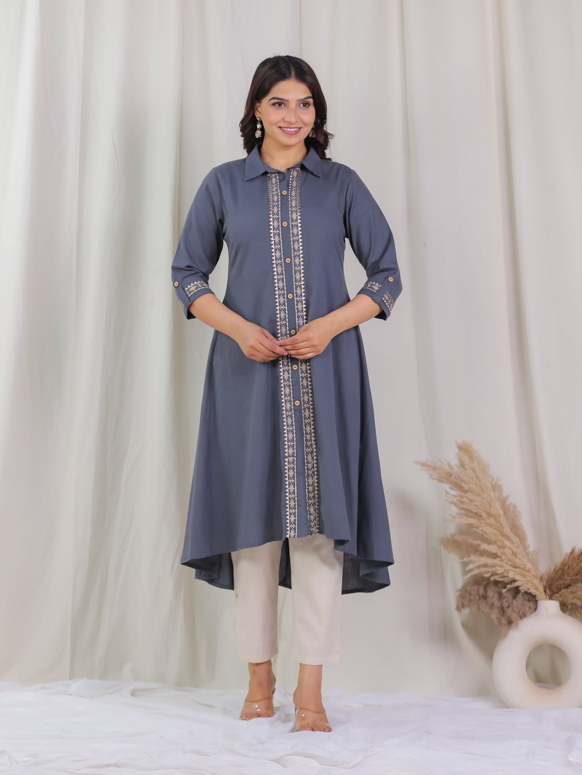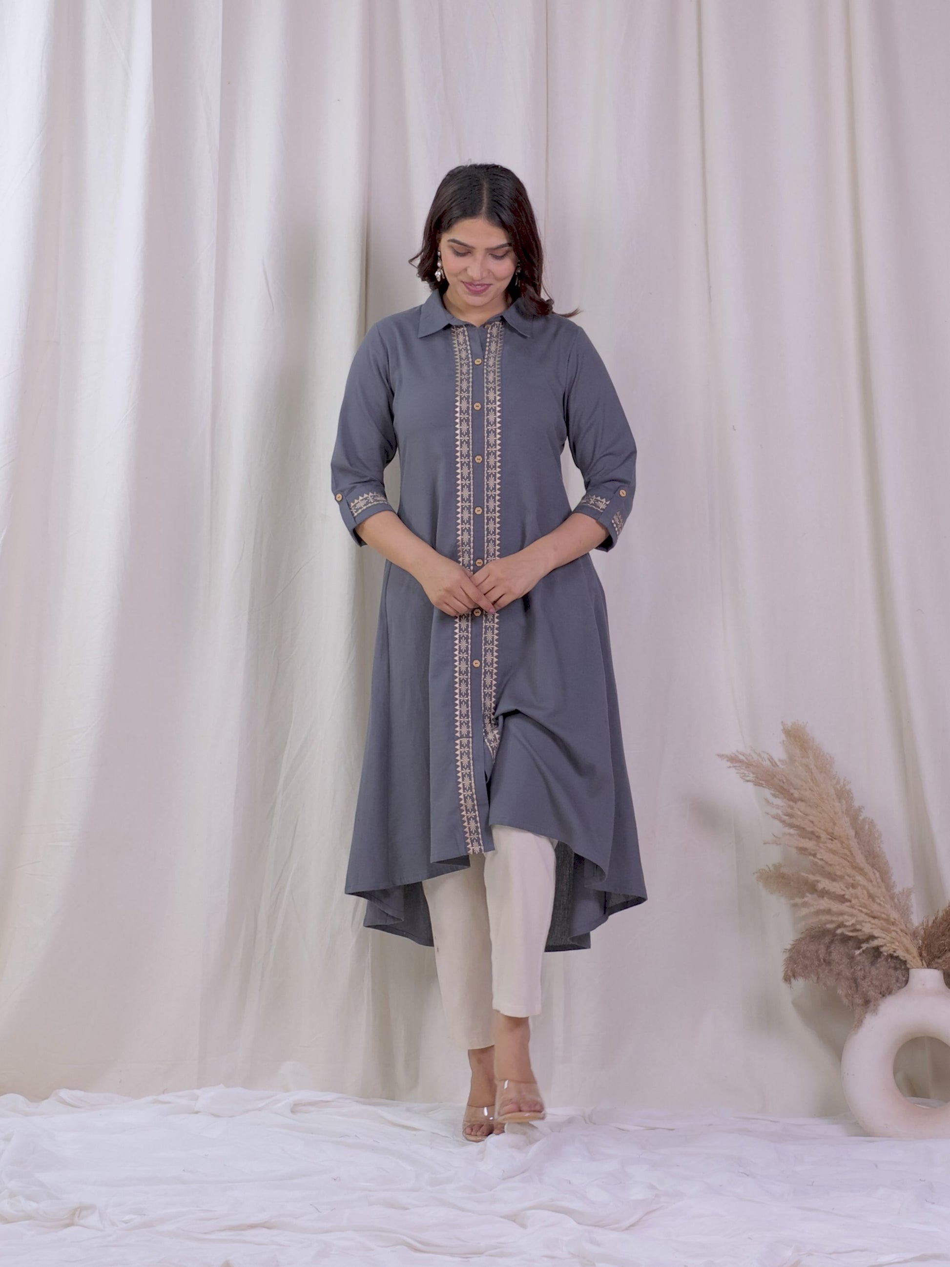 Embroidered Linen Cotton Solid Flared Grey Kurta