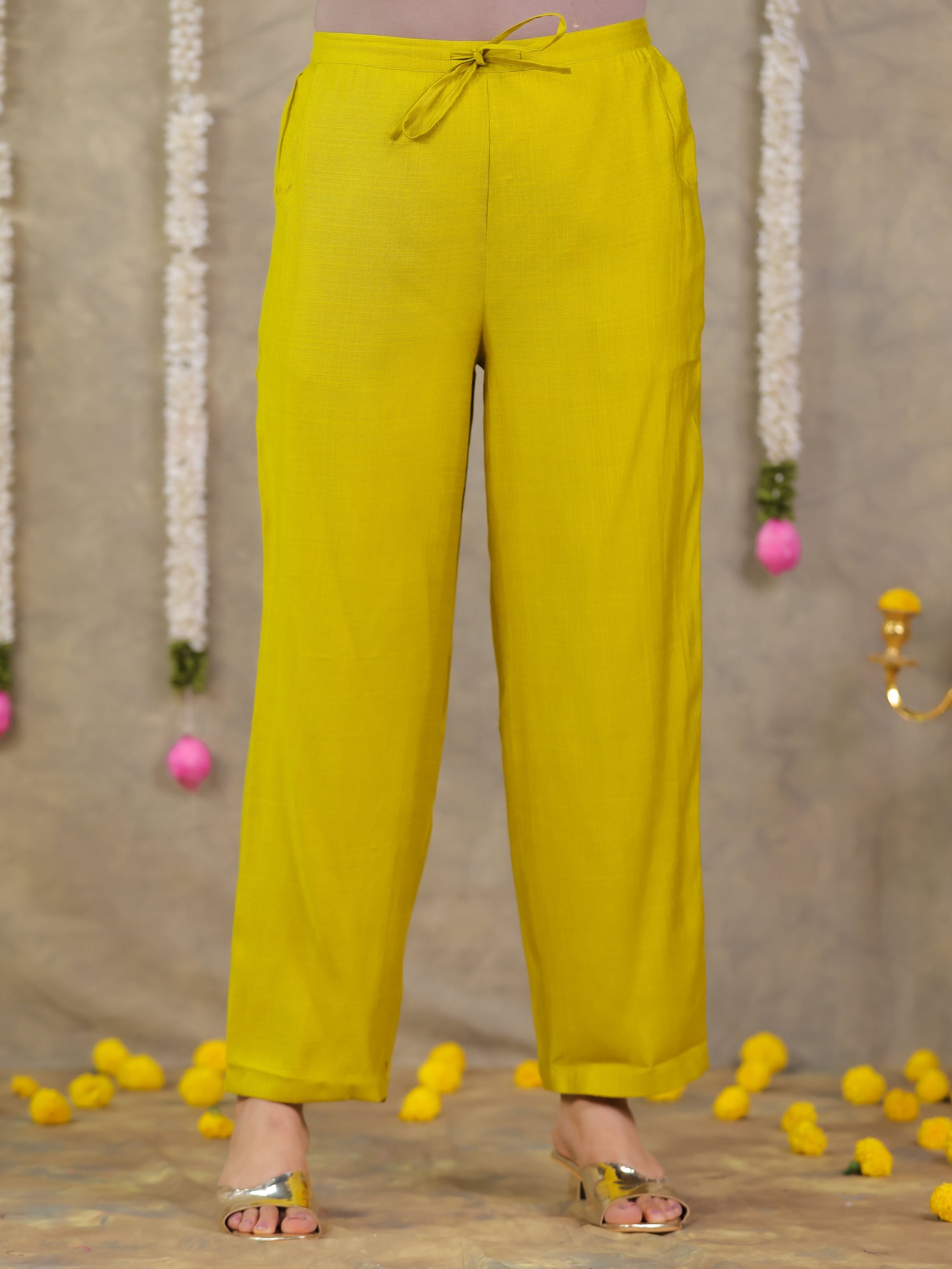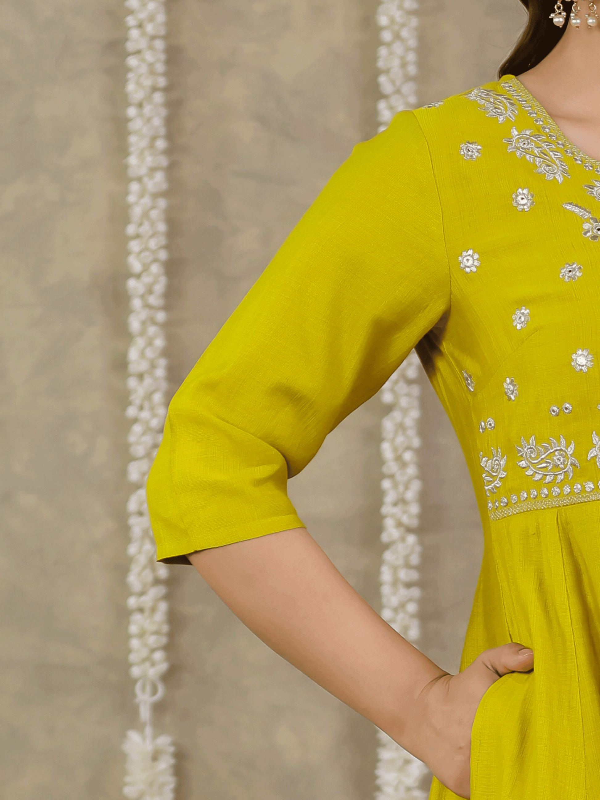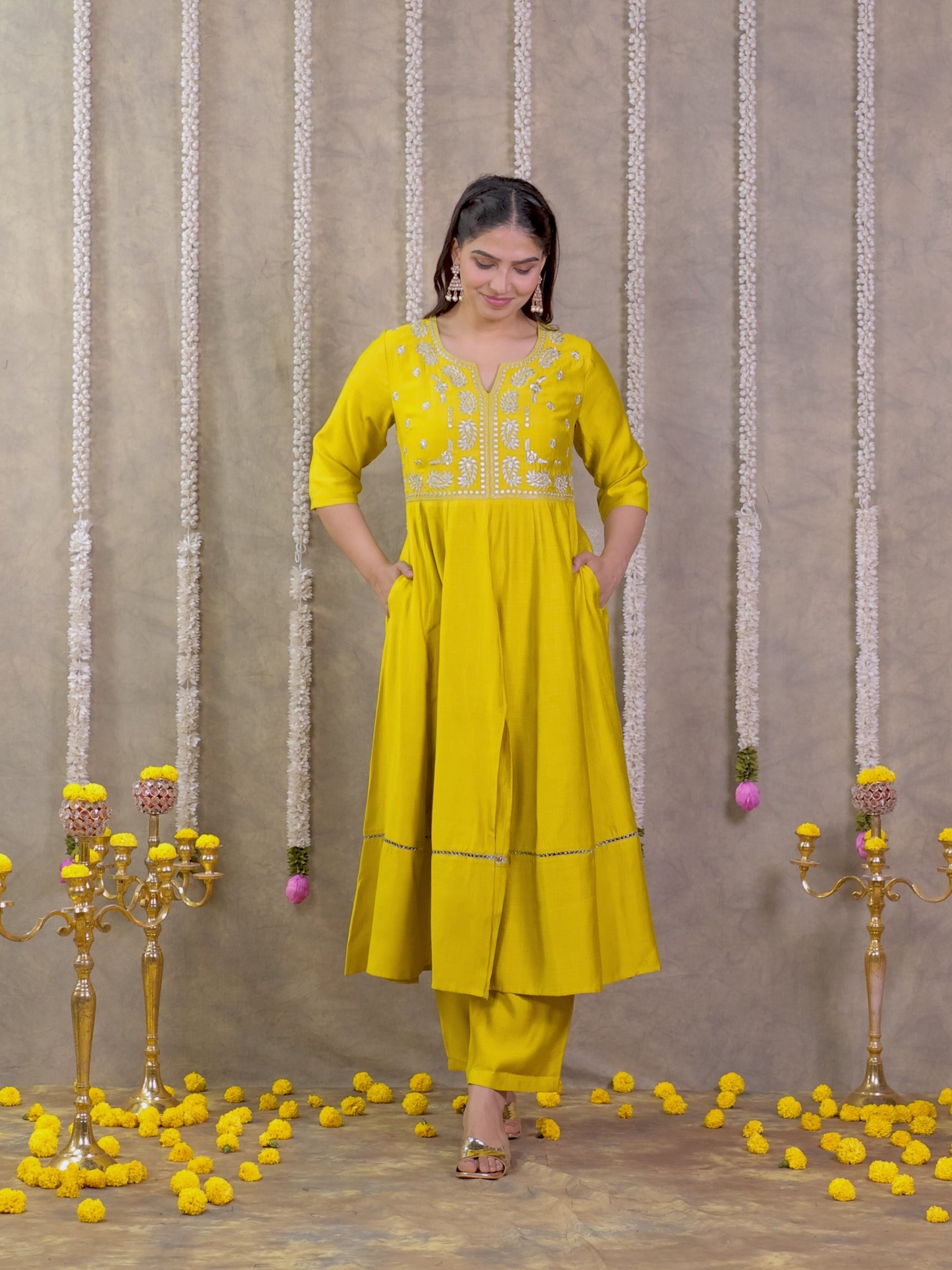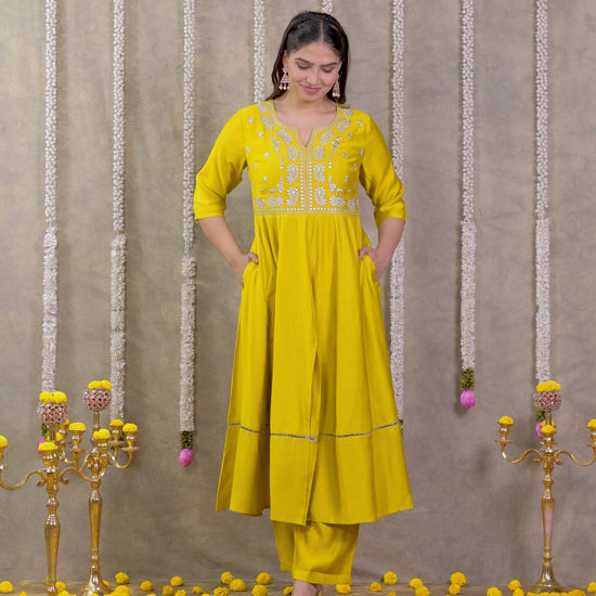 Embroidered Vertigan Solid Anarkali Lemon Yellow Kurta