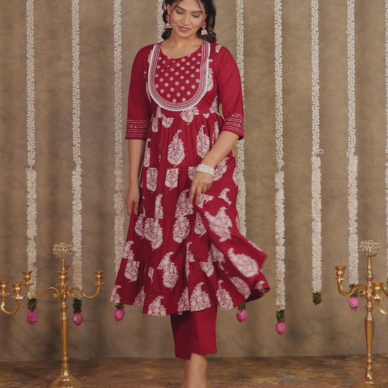 Embroidered Soft Cotton Block Print Anarkali Maroon Kurta