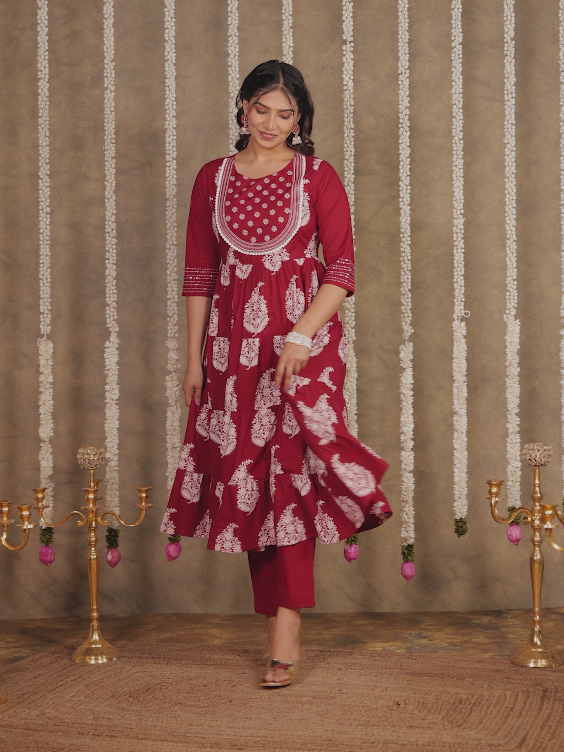 This Maroon Soft Cotton kurta with a Anarkali flare is designed for comfort and style. Featuring a Round neckline, 3/4 Sleeve sleeves, and a graceful Ankle Length hemline, it’s perfect for festive wear or semi-formal gatherings. The Block Print highlights add depth and texture, making it a standout piece. Accessorise with a contrasting dupatta and keep it pristine by following proper care instructions.