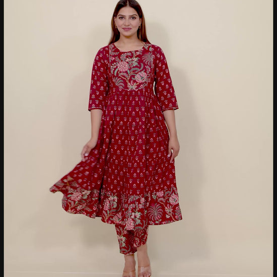 Embroidered Soft Cotton Block Print Anarkali Maroon Kurta