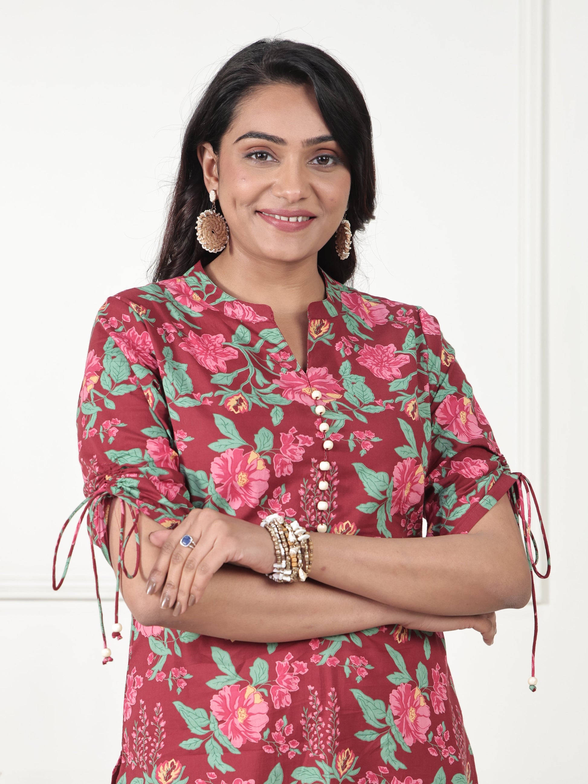 This Maroon Straight kurta in soft Soft Cotton is a timeless pick for festive and casual wear. Designed with a Mandarin Collar neckline and 3/4 Sleeve sleeves, its graceful Calf Length cut flatters all body types. The delicate Floral detailing adds a touch of sophistication. Pair it with statement earrings and juttis for a polished look. Maintain its pristine look by following proper care instructions.