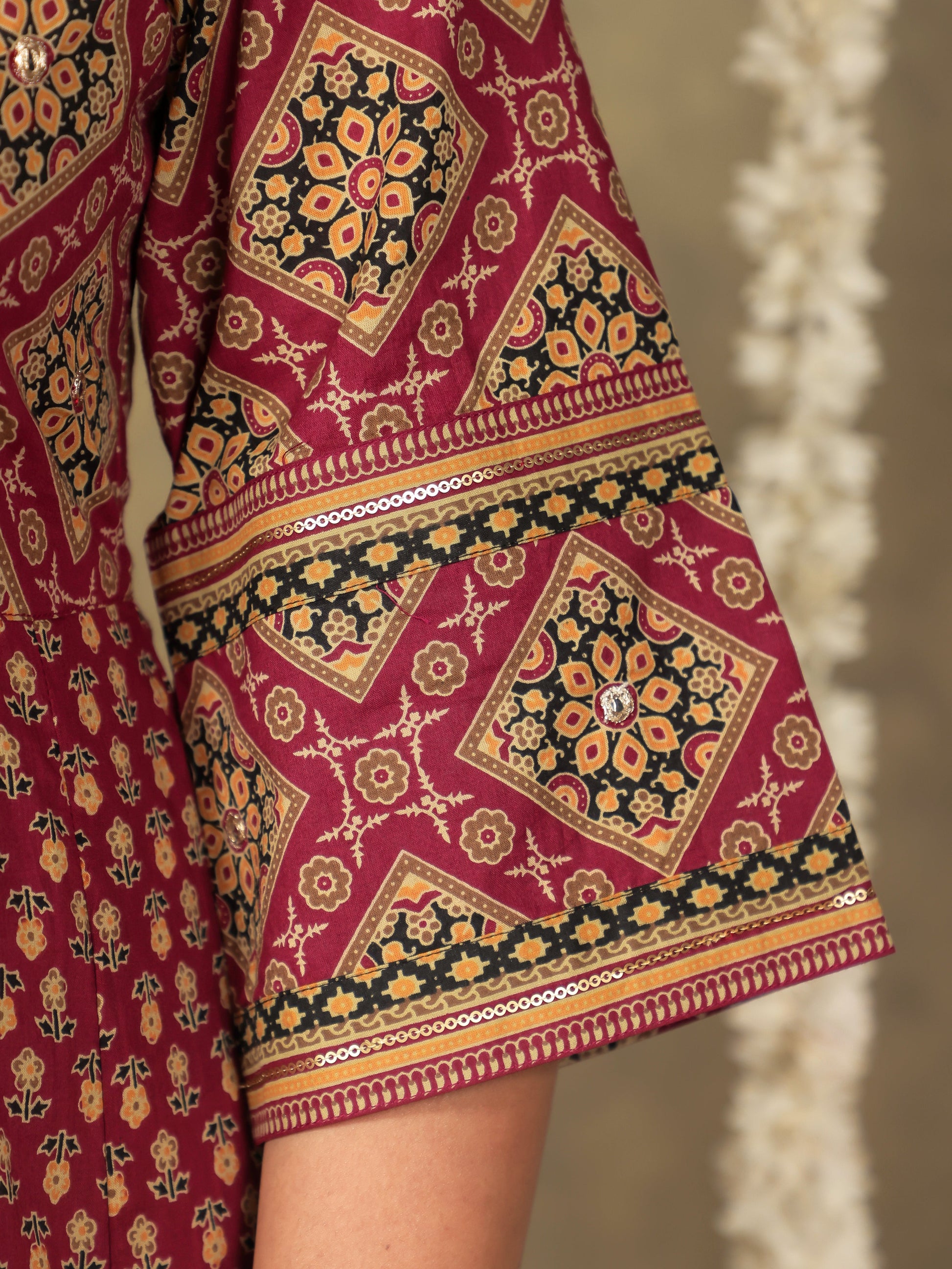 Elevate your ethnic wardrobe with this Soft Cotton kurta in a stunning Maroon hue. Featuring an elegant Flared fit and striking Floral accents, it’s perfect for festive celebrations or family gatherings. The V neckline and 3/4 Sleeve provide all-day comfort. Team with gold-toned accessories for an effortlessly chic vibe. Maintain its charm by following proper care instructions.