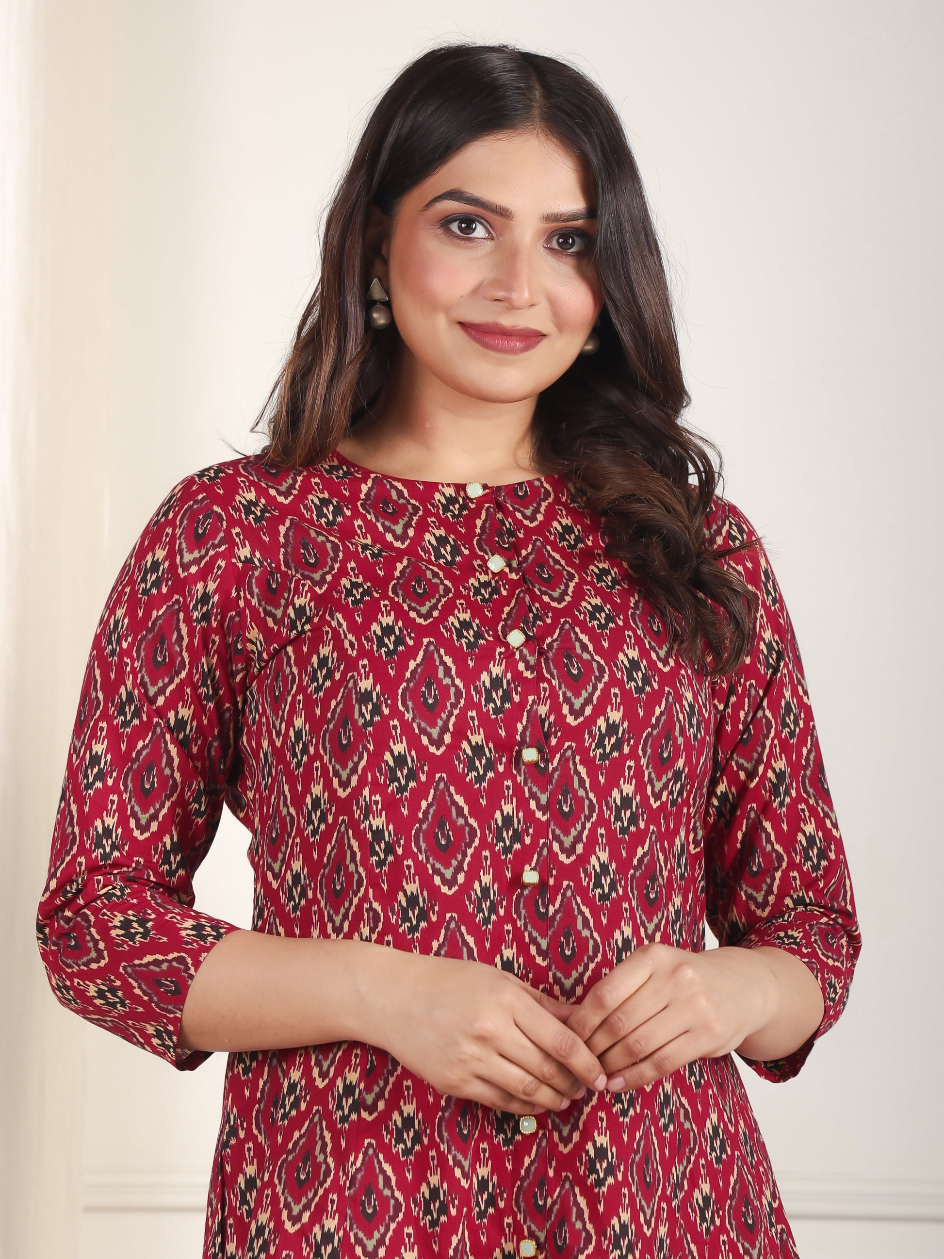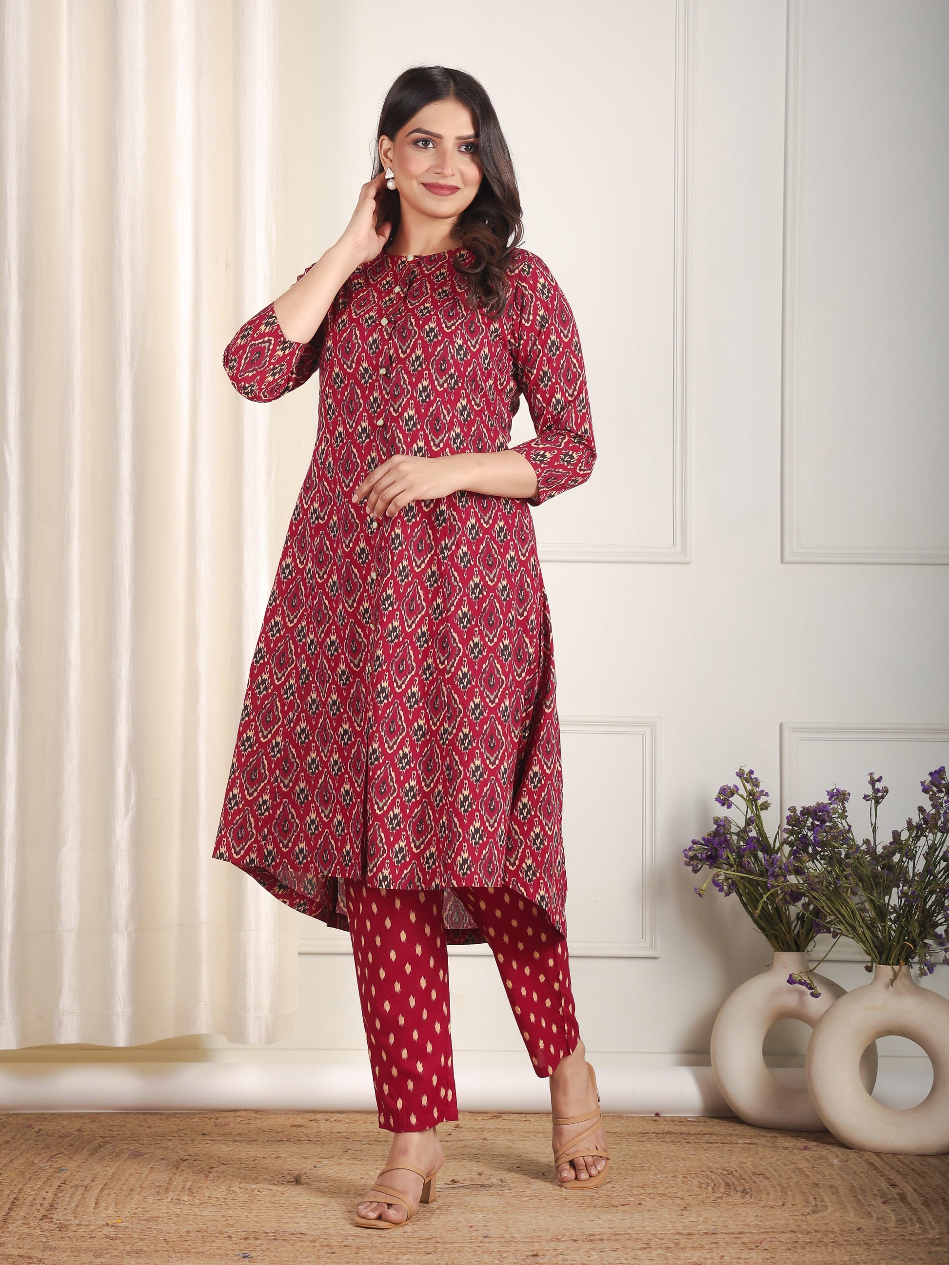 This Maroon Soft Cotton kurta with a High Low flare is designed for comfort and style. Featuring a Collared neckline, 3/4 Sleeve sleeves, and a graceful Calf Length hemline, it’s perfect for festive wear or semi-formal gatherings. The Ikat highlights add depth and texture, making it a standout piece. Accessorise with a contrasting dupatta and keep it pristine by following proper care instructions.