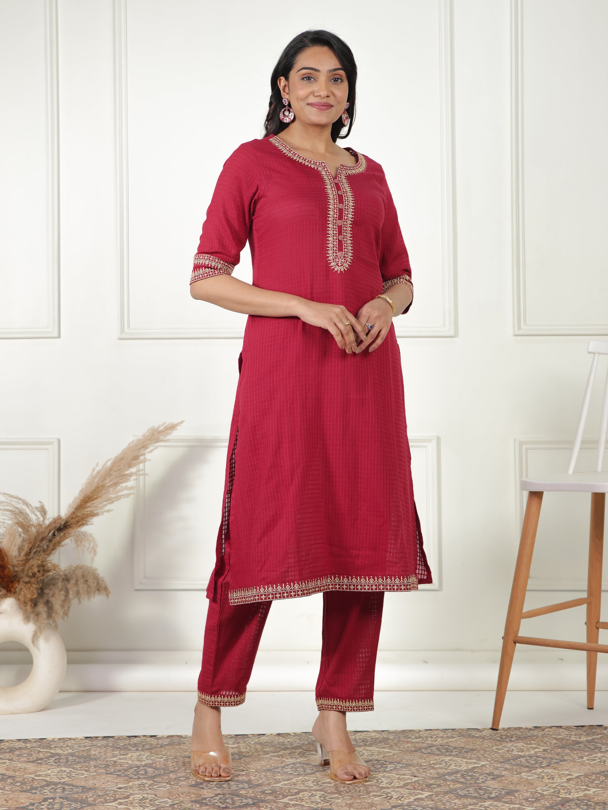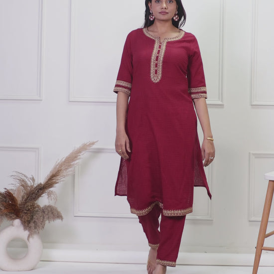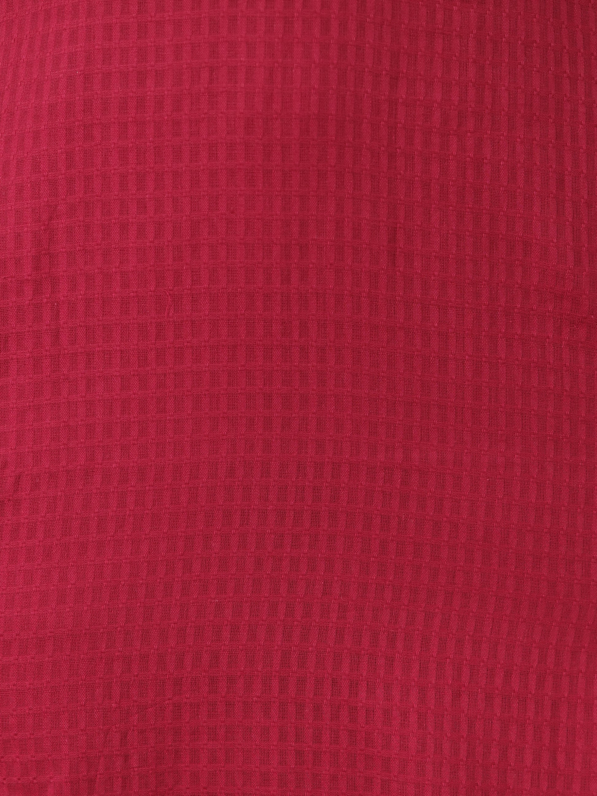 This Maroon A-line kurta in soft Cotton Dobby is a timeless pick for festive and casual wear. Designed with a Round neckline and 3/4 Sleeve sleeves, its graceful Calf Length cut flatters all body types. The delicate Solid detailing adds a touch of sophistication. Pair it with statement earrings and juttis for a polished look. Maintain its pristine look by following proper care instructions.