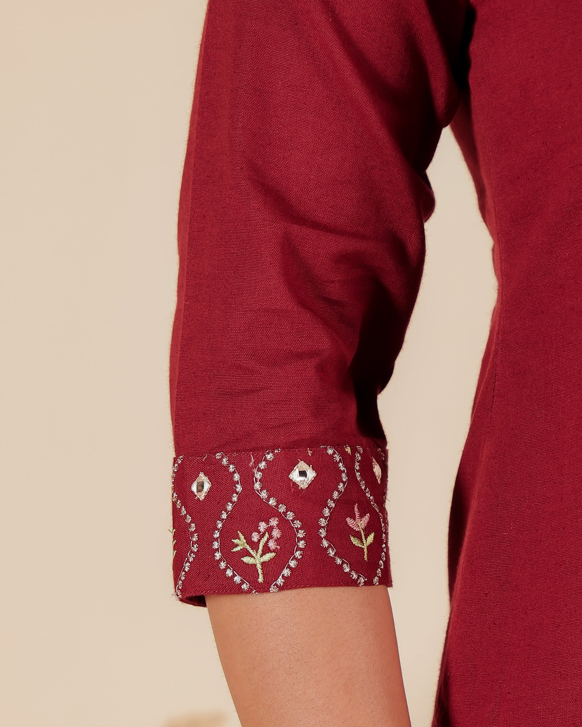 Crafted from breathable Natural Cotton, this Straight kurta in Maroon blends traditional design with everyday comfort. The Solid finish adds artisanal charm, while the Calf Length silhouette ensures effortless elegance. Style with palazzos or leggings for versatile looks, from workdays to weekend outings. Designed for easy care, this kurta stays beautiful with simple care instructions.
