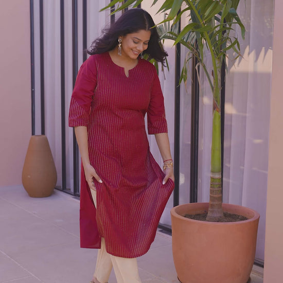 Crafted from breathable Natural Cotton, this Straight kurta in Maroon blends traditional design with everyday comfort. The Solid finish adds artisanal charm, while the Calf Length silhouette ensures effortless elegance. Style with palazzos or leggings for versatile looks, from workdays to weekend outings. Designed for easy care, this kurta stays beautiful with simple care instructions.