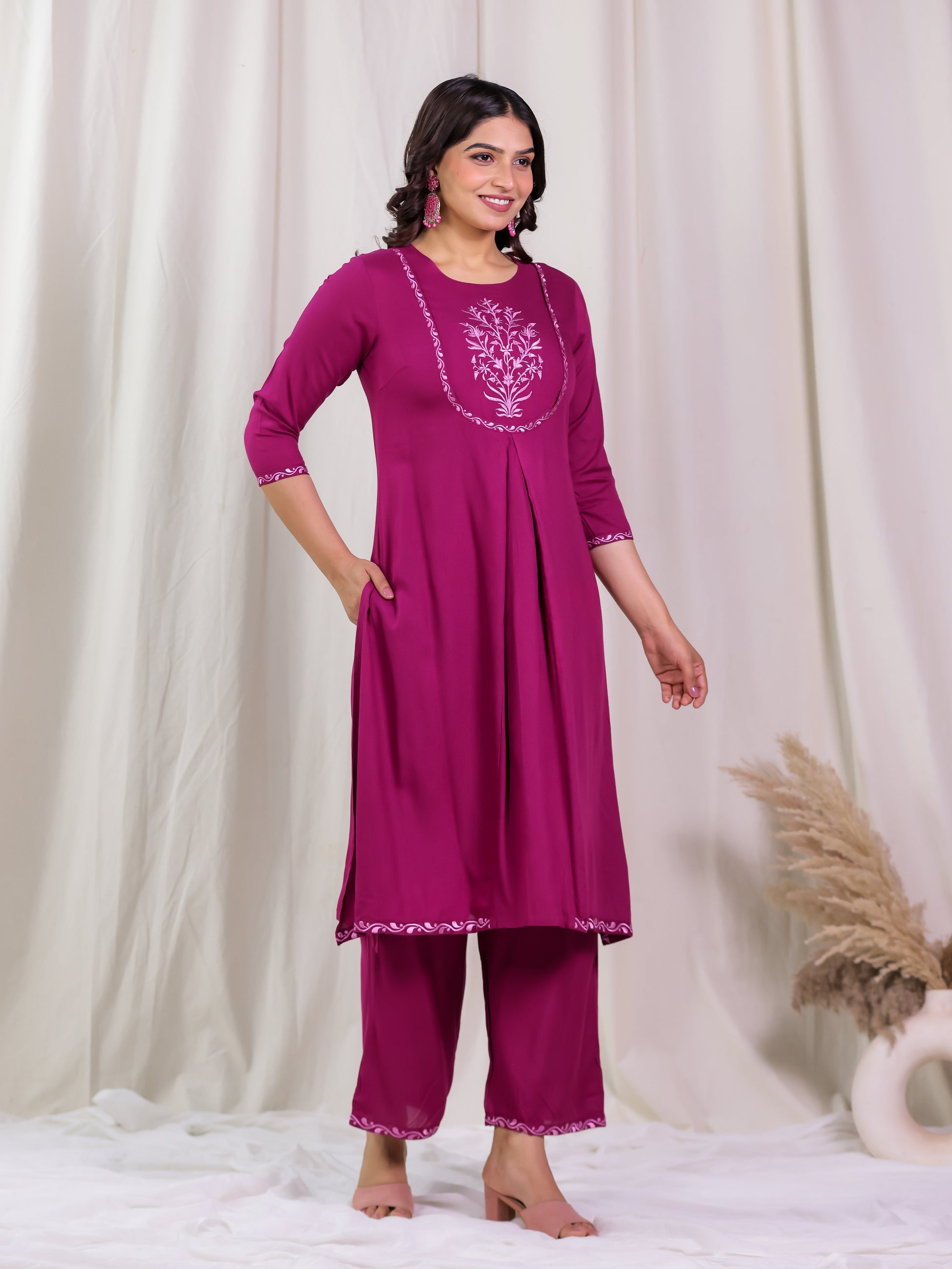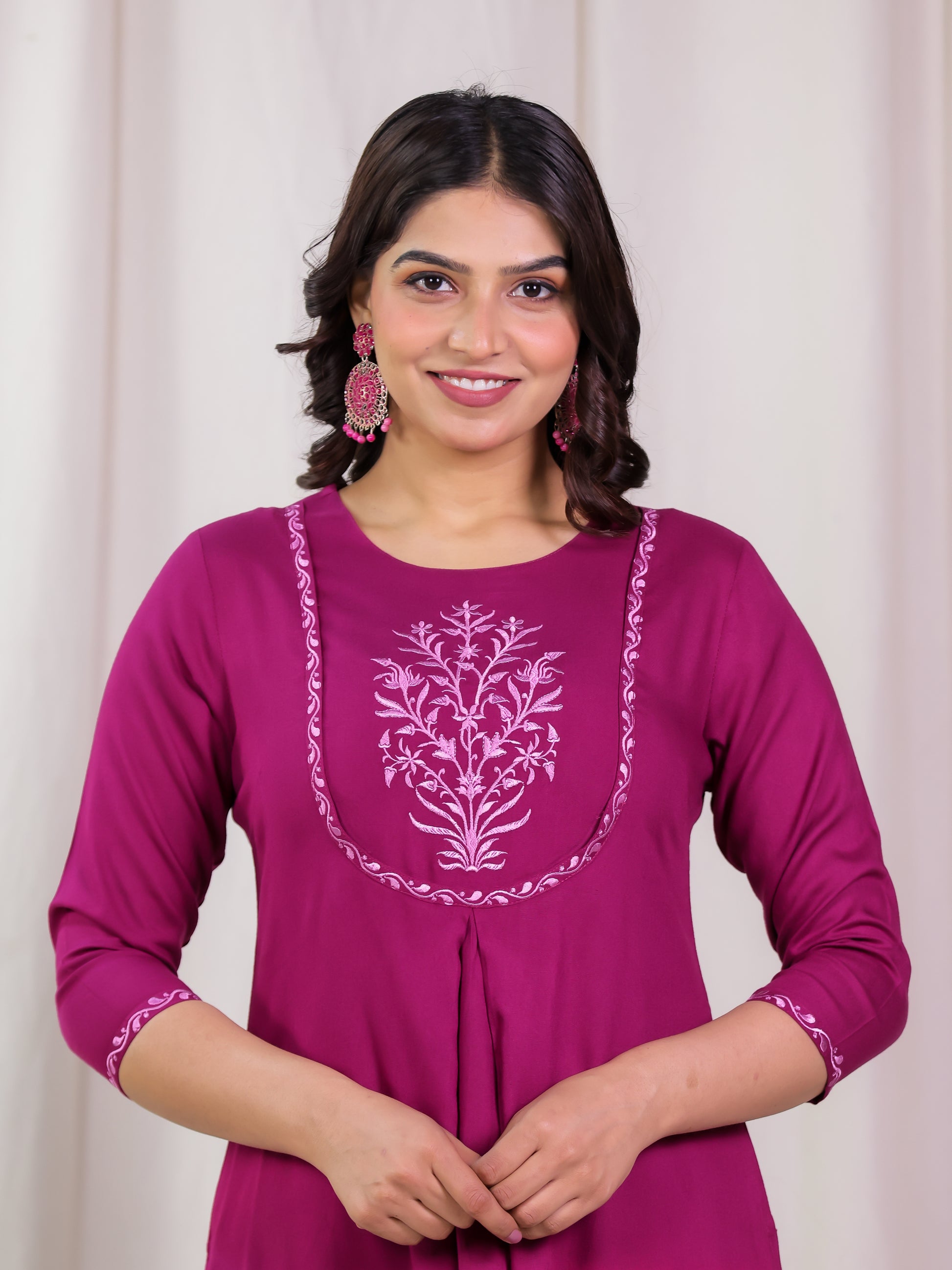 This Wine Viscose kurta with a A-line flare is designed for comfort and style. Featuring a Round neckline, 3/4 Sleeve sleeves, and a graceful Calf Length hemline, it’s perfect for festive wear or semi-formal gatherings. The Solid highlights add depth and texture, making it a standout piece. Accessorise with a contrasting dupatta and keep it pristine by following proper care instructions.
