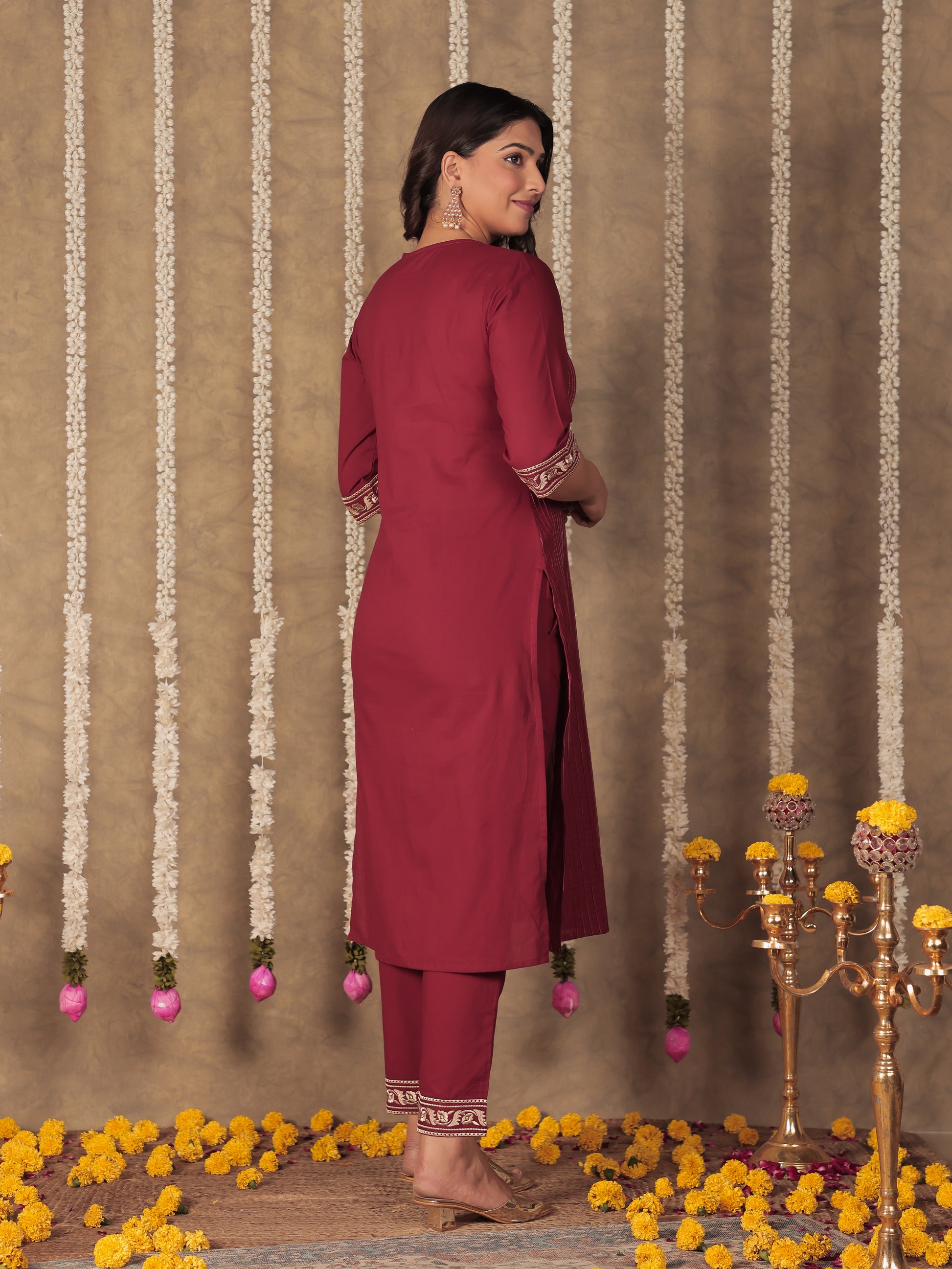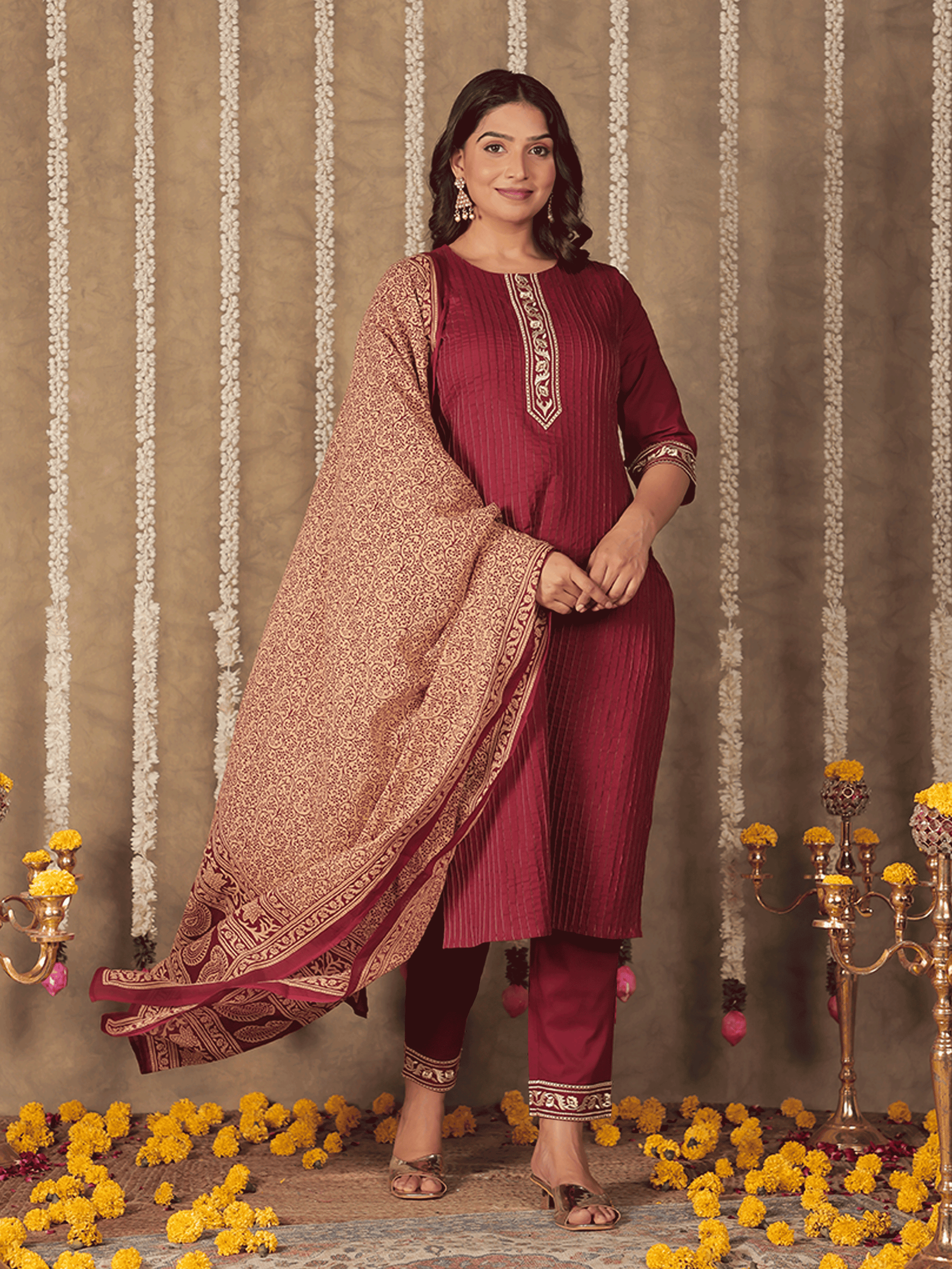 This Maroon Soft Cotton kurta with a Straight flare is designed for comfort and style. Featuring a Keyhole neckline, 3/4 Sleeve sleeves, and a graceful Calf Length hemline, it’s perfect for festive wear or semi-formal gatherings. The Solid highlights add depth and texture, making it a standout piece. Accessorise with a contrasting dupatta and keep it pristine by following proper care instructions.