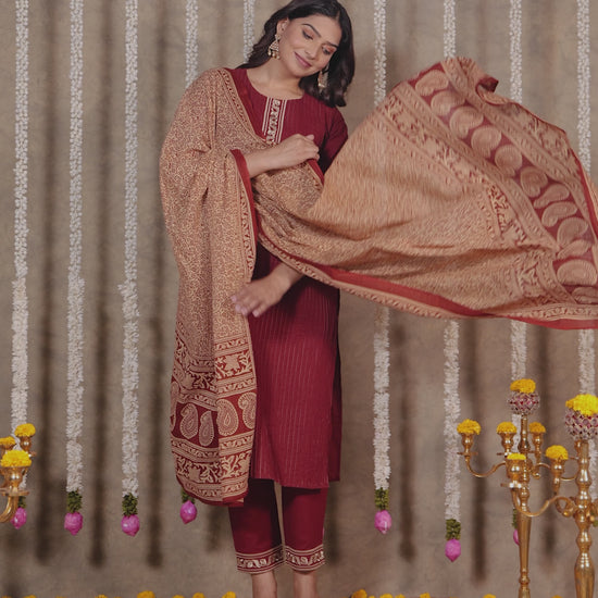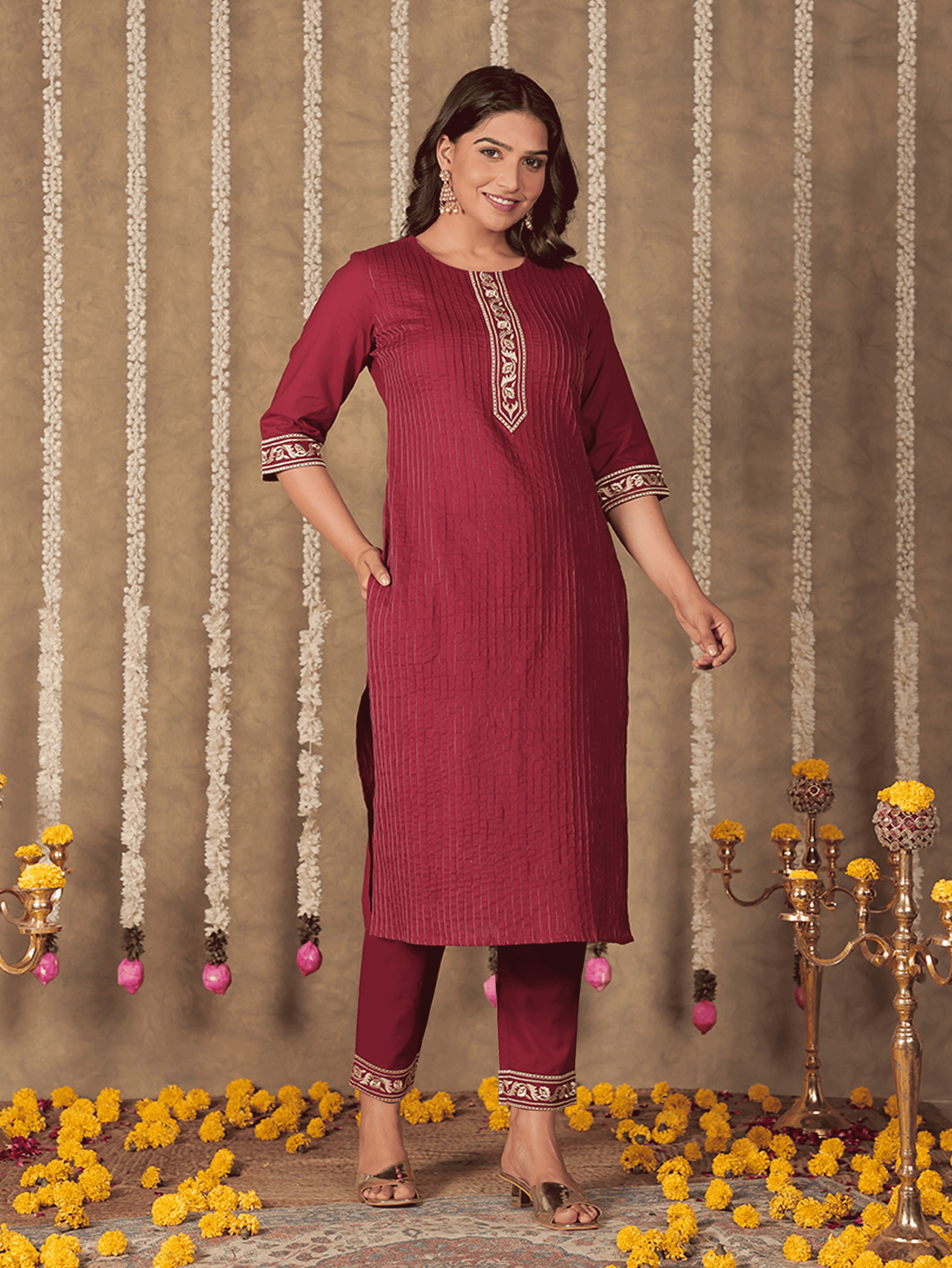 Showcase timeless elegance in this maroon straight kurta made from premium soft cotton. The elegant keyhole neck creates visual interest while maintaining modesty. The elaborate embroidered work tells a story through traditional techniques. The straight cut kurta design provides a sleek profile that elongates your frame beautifully. The calf length paired with 3/4 sleeve creates a proportioned silhouette. Perfect for everyday elegance or casual settings, with simple dry clean only requirements.