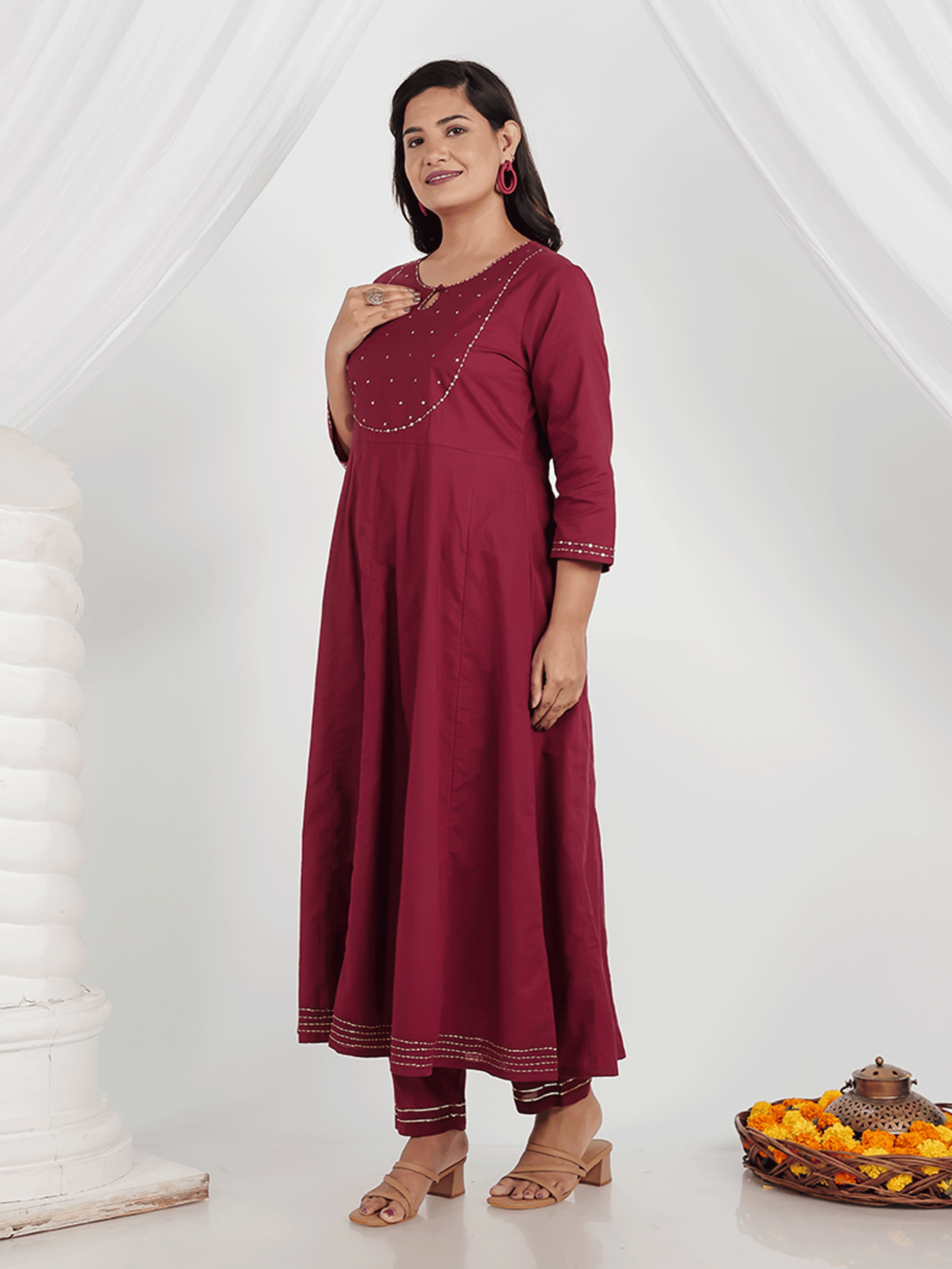 Embroidered Soft Cotton Solid Anarkali Maroon Kurta