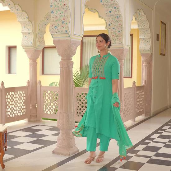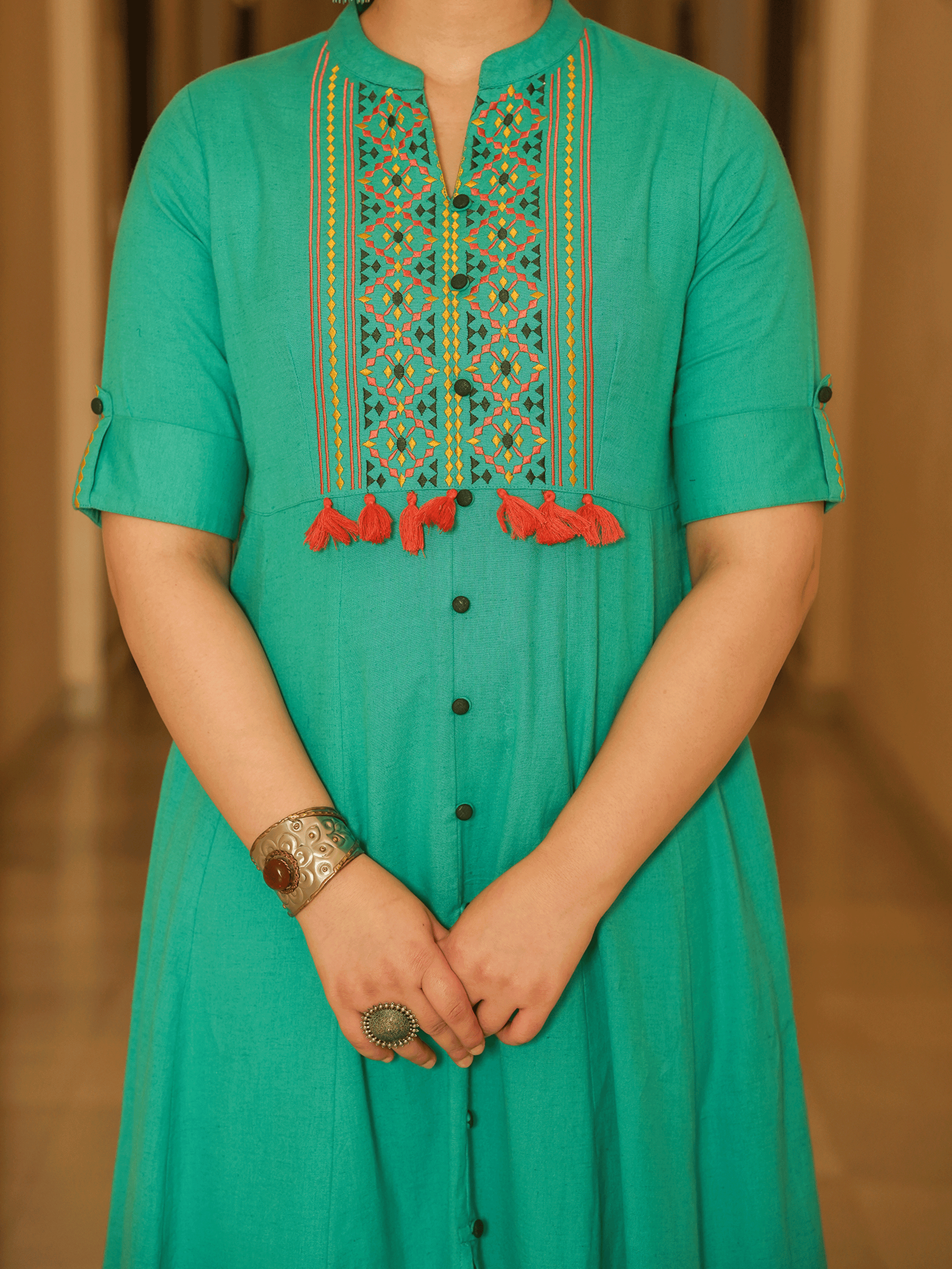 Embroidered Linen Cotton Solid High Low Mint Green Kurta
