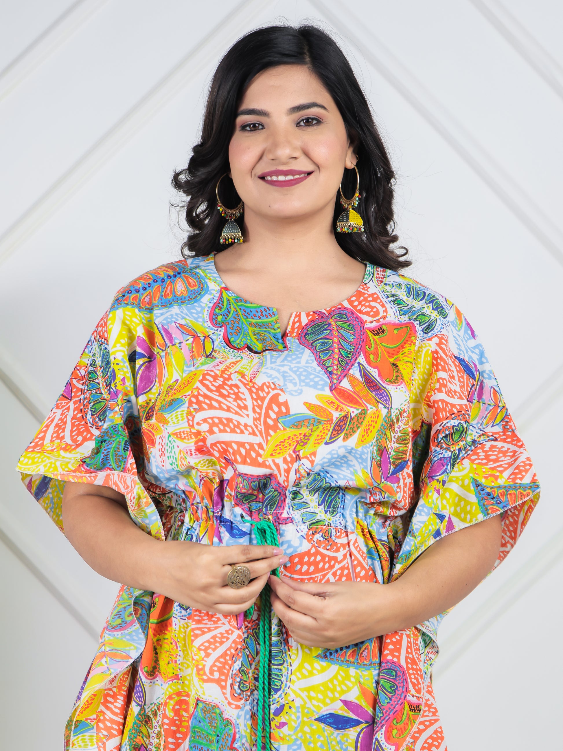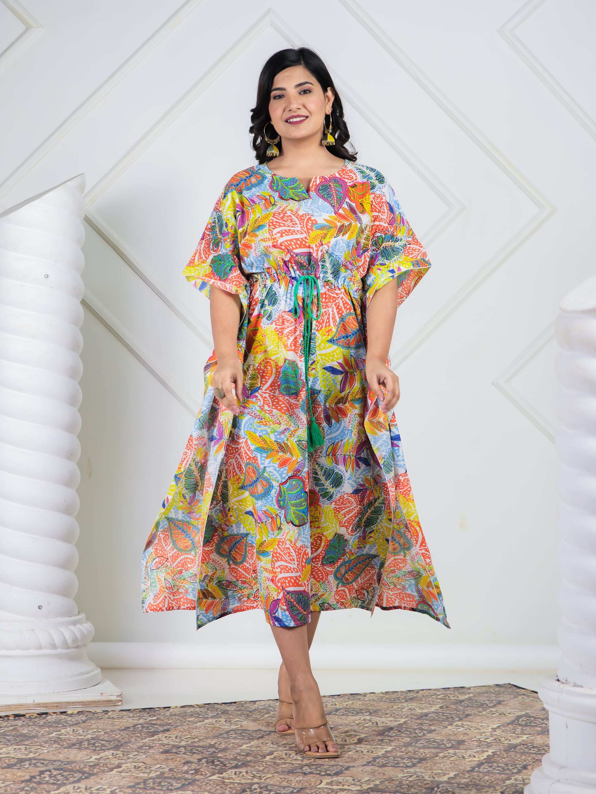This Multicolor Kaftan kurta in soft Soft Cotton is a timeless pick for festive and casual wear. Designed with a Round neckline and sleeves, its graceful cut flatters all body types. The delicate Foliage detailing adds a touch of sophistication. Pair it with statement earrings and juttis for a polished look. Maintain its pristine look by following proper care instructions.