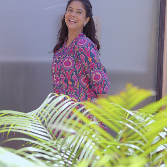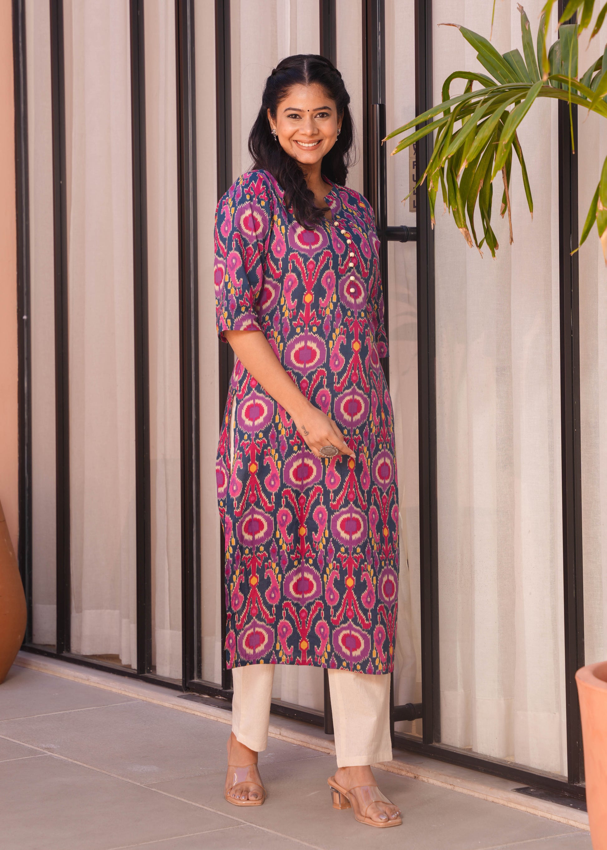 Elevate your ethnic wardrobe with this Soft Cotton kurta in a stunning Multicolor hue. Featuring an elegant Straight fit and striking Ikat accents, it’s perfect for festive celebrations or family gatherings. The Mandarin Collar neckline and 3/4 Sleeve provide all-day comfort. Team with gold-toned accessories for an effortlessly chic vibe. Maintain its charm by following proper care instructions.