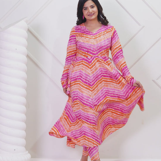 Embroidered Soft Cotton Leheriya Anarkali Multicolor Kurta