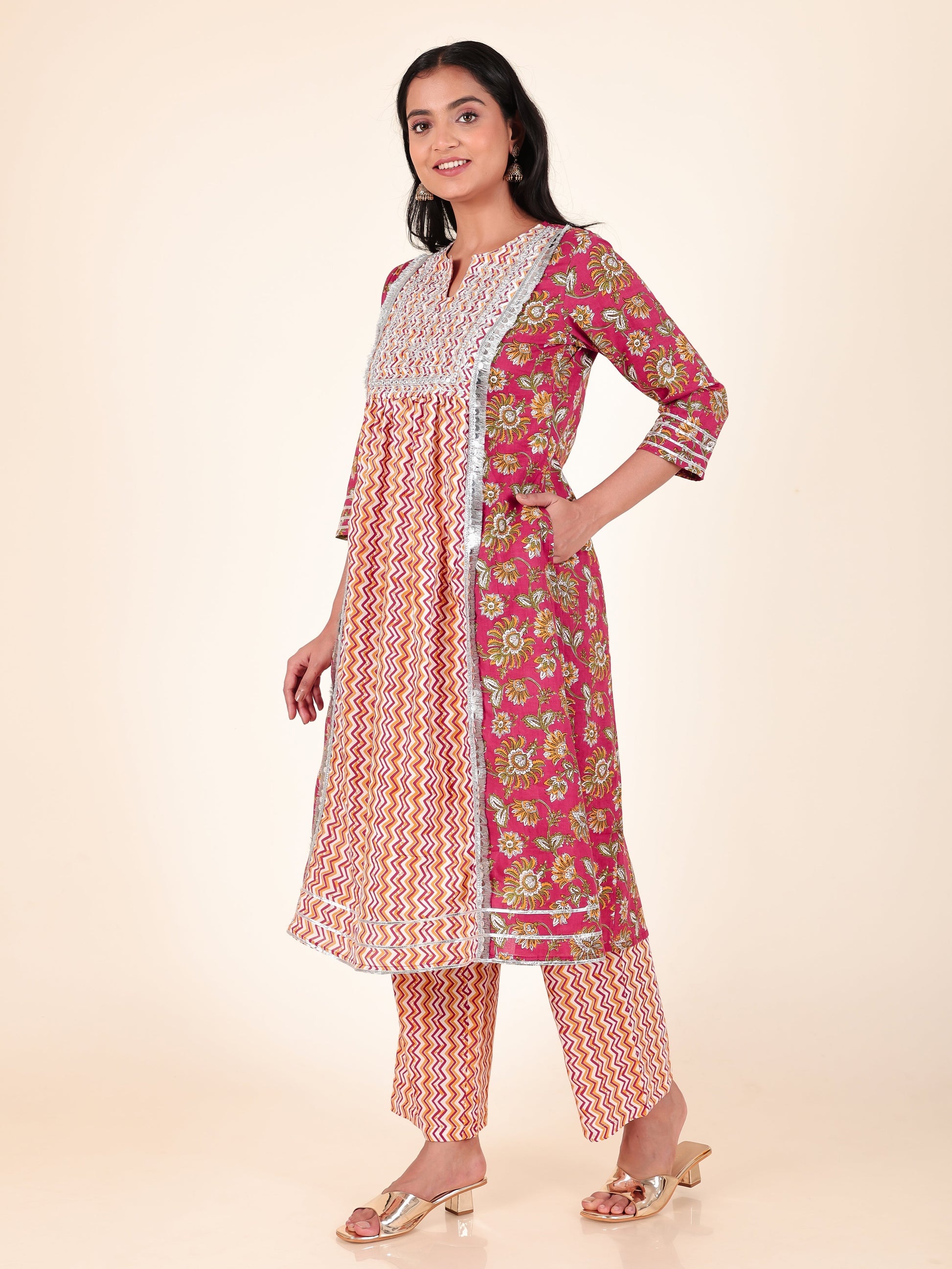 This Multicolor Panelled kurta in soft Soft Cotton is a timeless pick for festive and casual wear. Designed with a Round neckline and 3/4 Sleeve sleeves, its graceful Calf Length cut flatters all body types. The delicate Floral detailing adds a touch of sophistication. Pair it with statement earrings and juttis for a polished look. Maintain its pristine look by following proper care instructions.