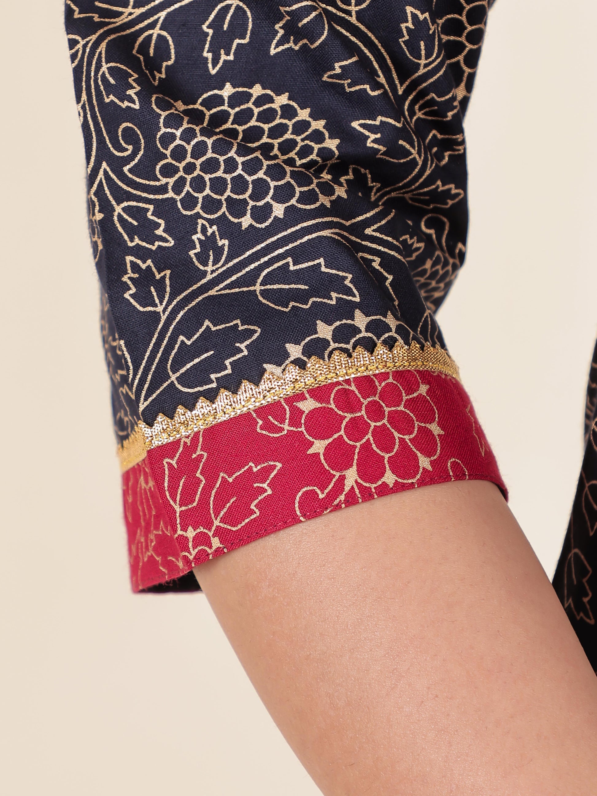 Crafted from breathable Viscose, this Straight kurta in Blue blends traditional design with everyday comfort. The Gold foil finish adds artisanal charm, while the Calf Length silhouette ensures effortless elegance. Style with palazzos or leggings for versatile looks, from workdays to weekend outings. Designed for easy care, this kurta stays beautiful with simple care instructions.