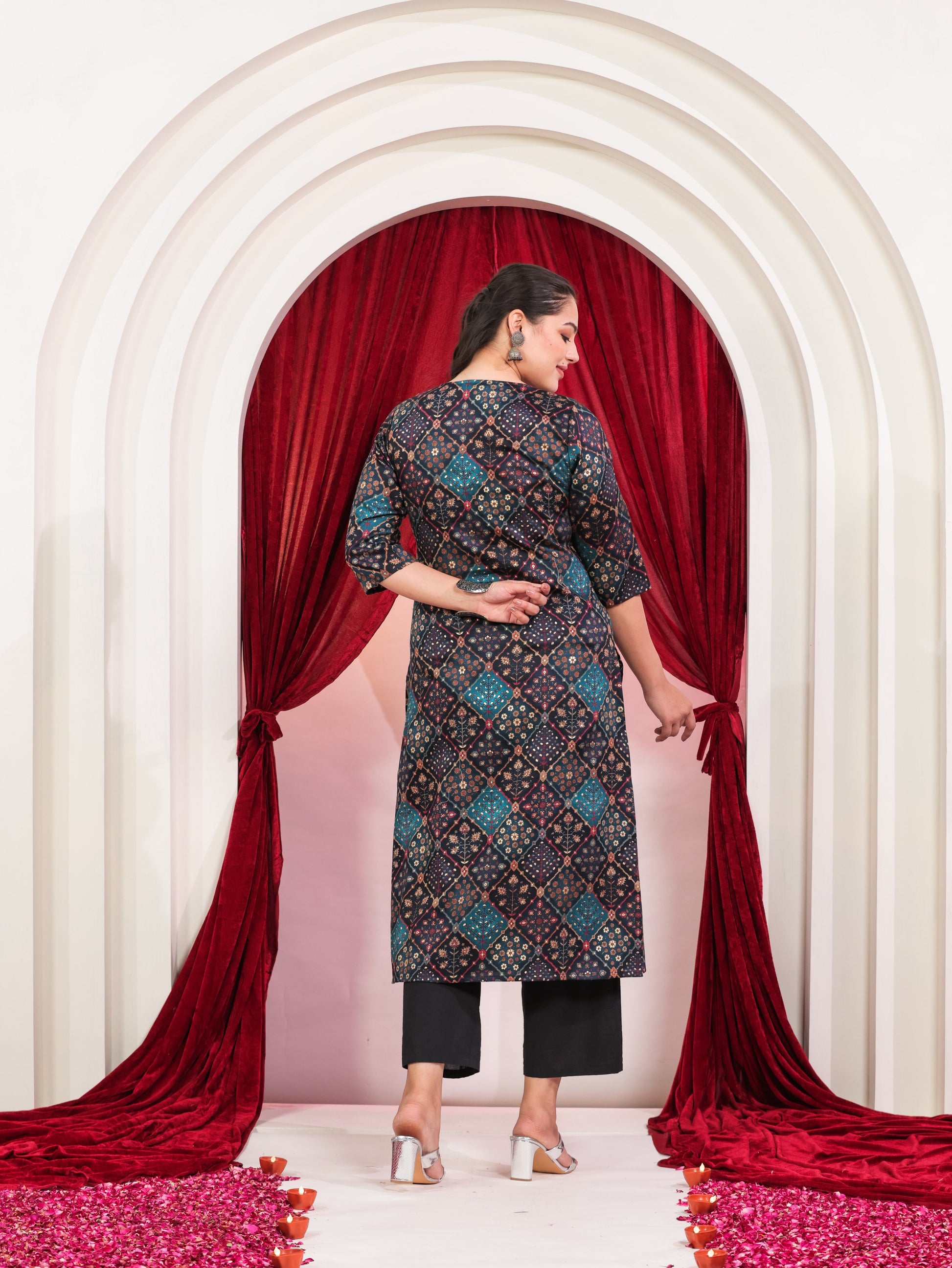 Elevate your ethnic wardrobe with this Muslin kurta in a stunning Navy Blue hue. Featuring an elegant Straight fit and striking Geometric accents, it’s perfect for festive celebrations or family gatherings. The Round neckline and 3/4 Sleeve provide all-day comfort. Team with gold-toned accessories for an effortlessly chic vibe. Maintain its charm by following proper care instructions.