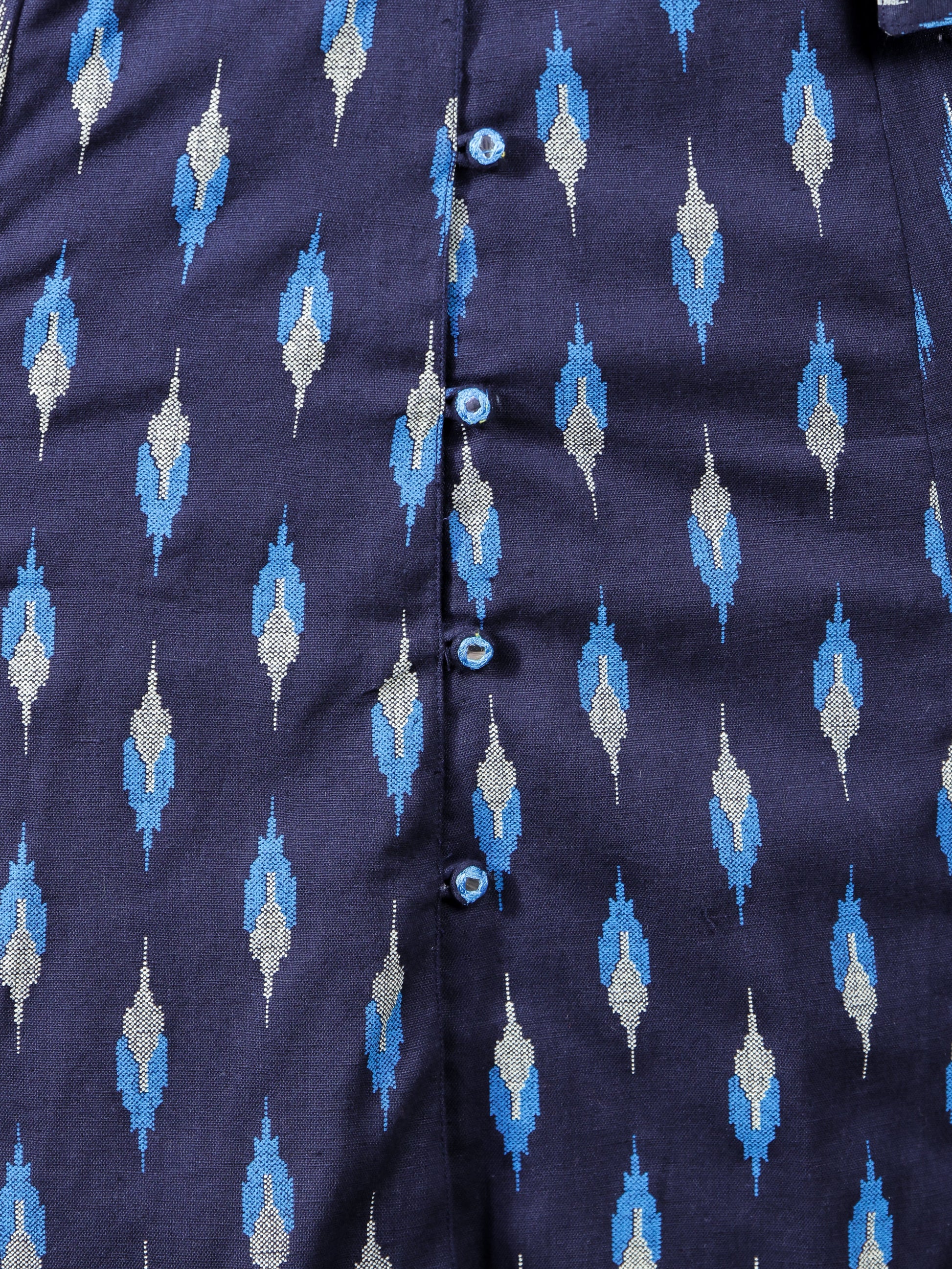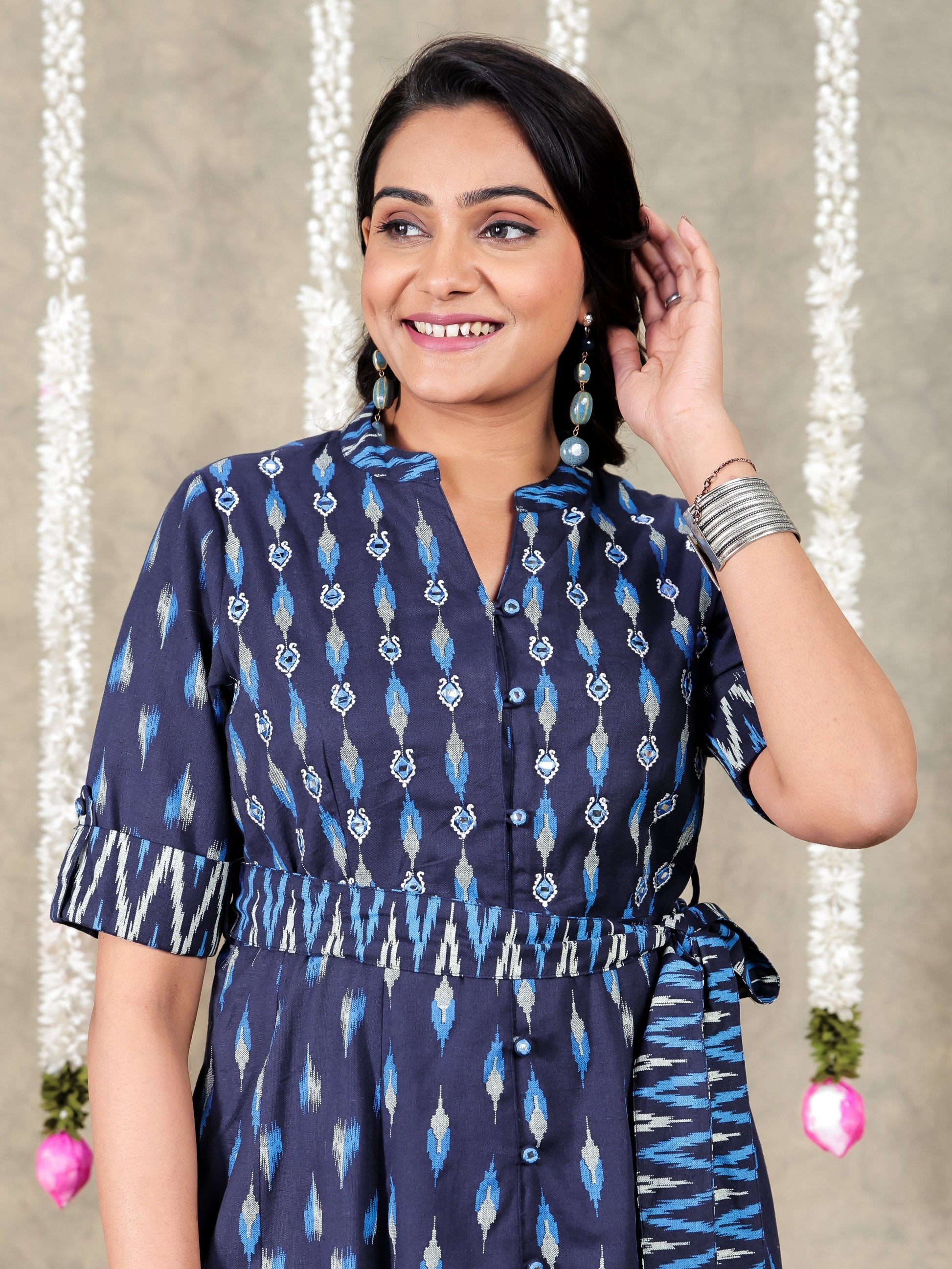 Embroidered Linen Cotton Ikat High Low Navy Blue Kurta