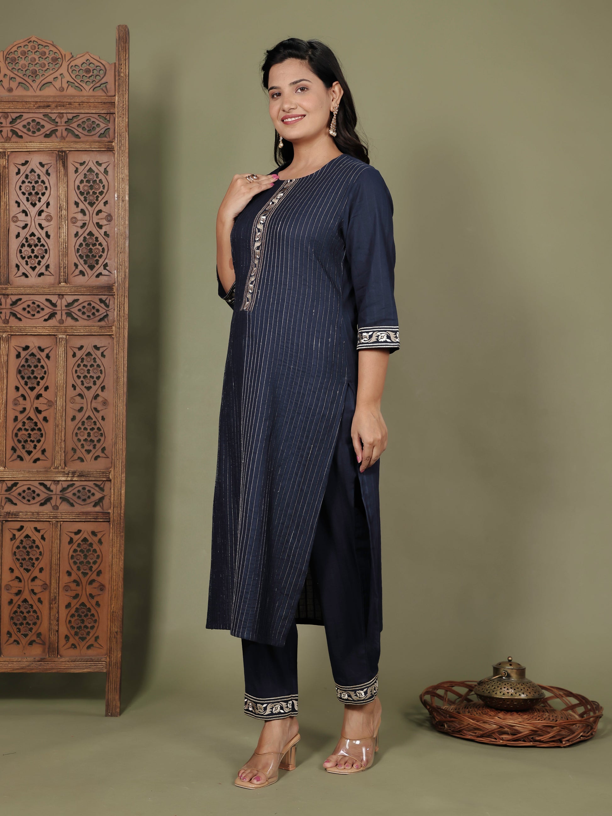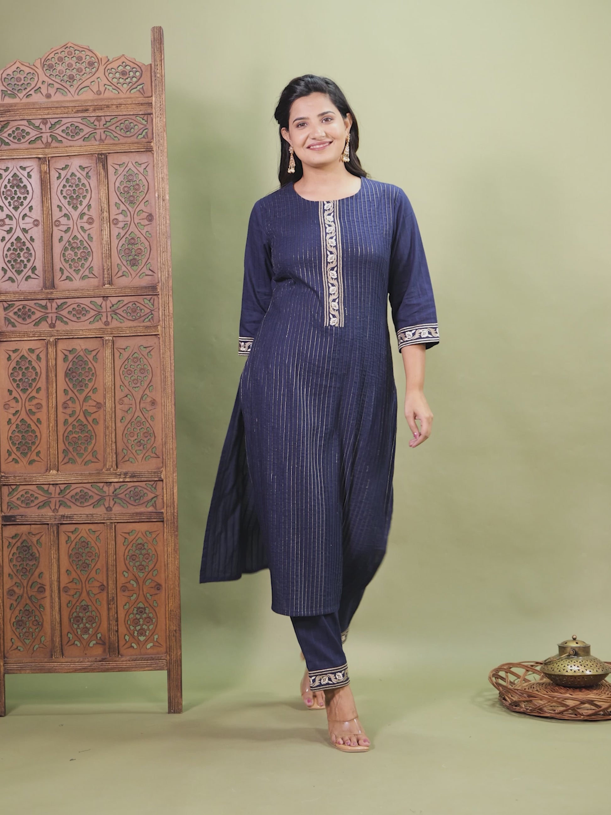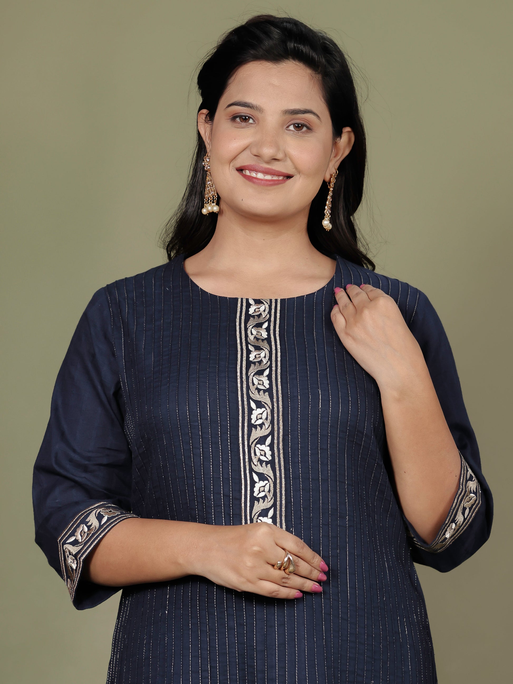 This Navy Blue Straight kurta in soft Cotton Dobby is a timeless pick for festive and casual wear. Designed with a Keyhole neckline and 3/4 Sleeve sleeves, its graceful Calf Length cut flatters all body types. The delicate Solid detailing adds a touch of sophistication. Pair it with statement earrings and juttis for a polished look. Maintain its pristine look by following proper care instructions.