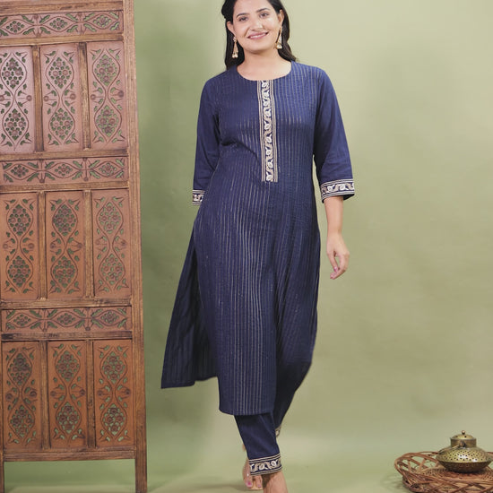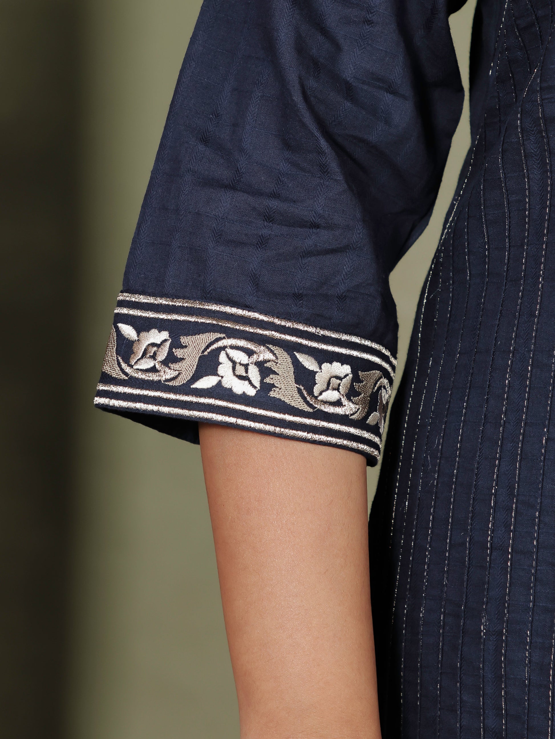 Embroidered Cotton Dobby Solid Straight Navy Blue Kurta