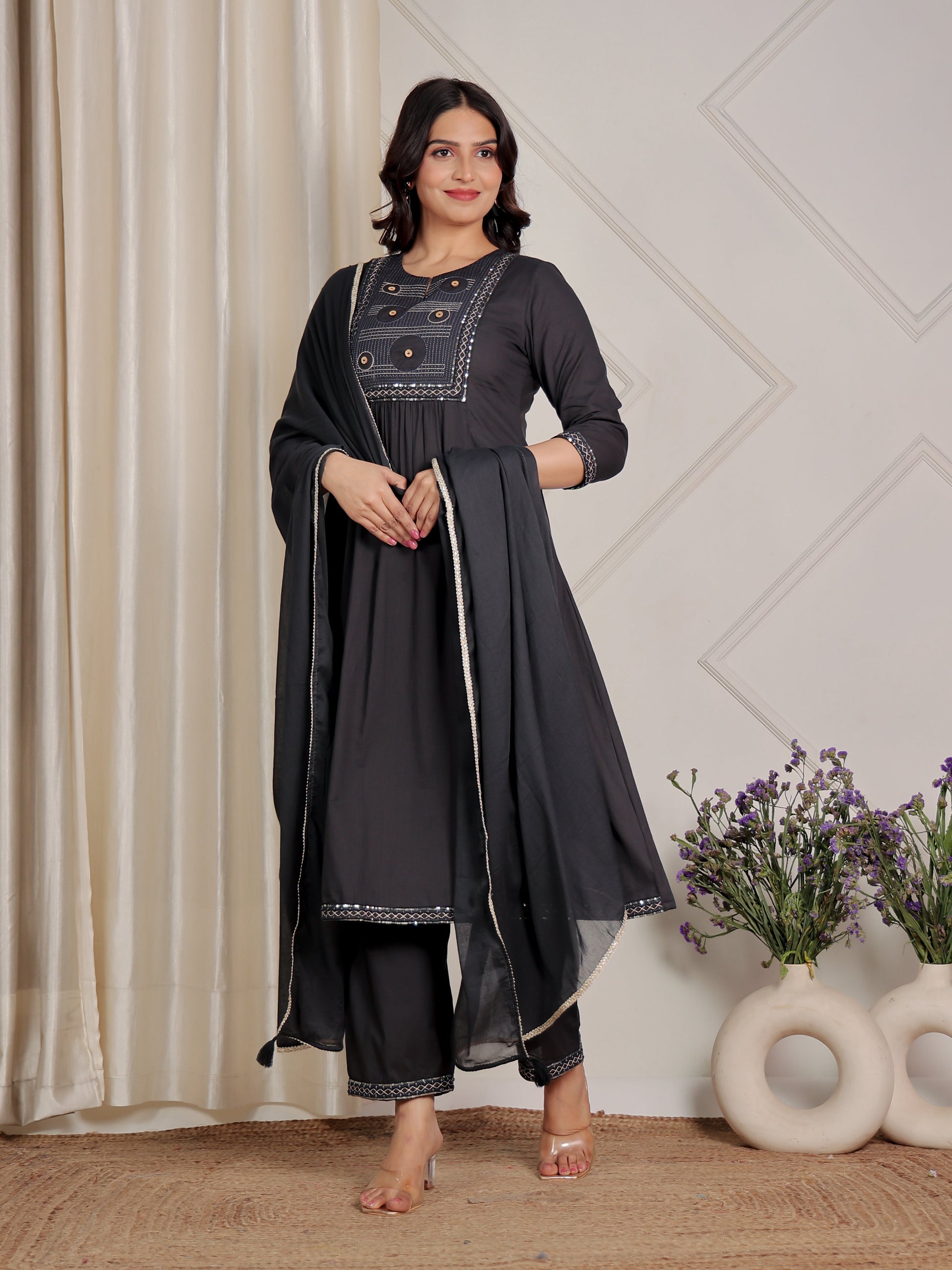 This Navy Blue Panelled kurta in soft Soft Cotton is a timeless pick for festive and casual wear. Designed with a Round neckline and 3/4 Sleeve sleeves, its graceful Calf Length cut flatters all body types. The delicate Solid detailing adds a touch of sophistication. Pair it with statement earrings and juttis for a polished look. Maintain its pristine look by following proper care instructions.