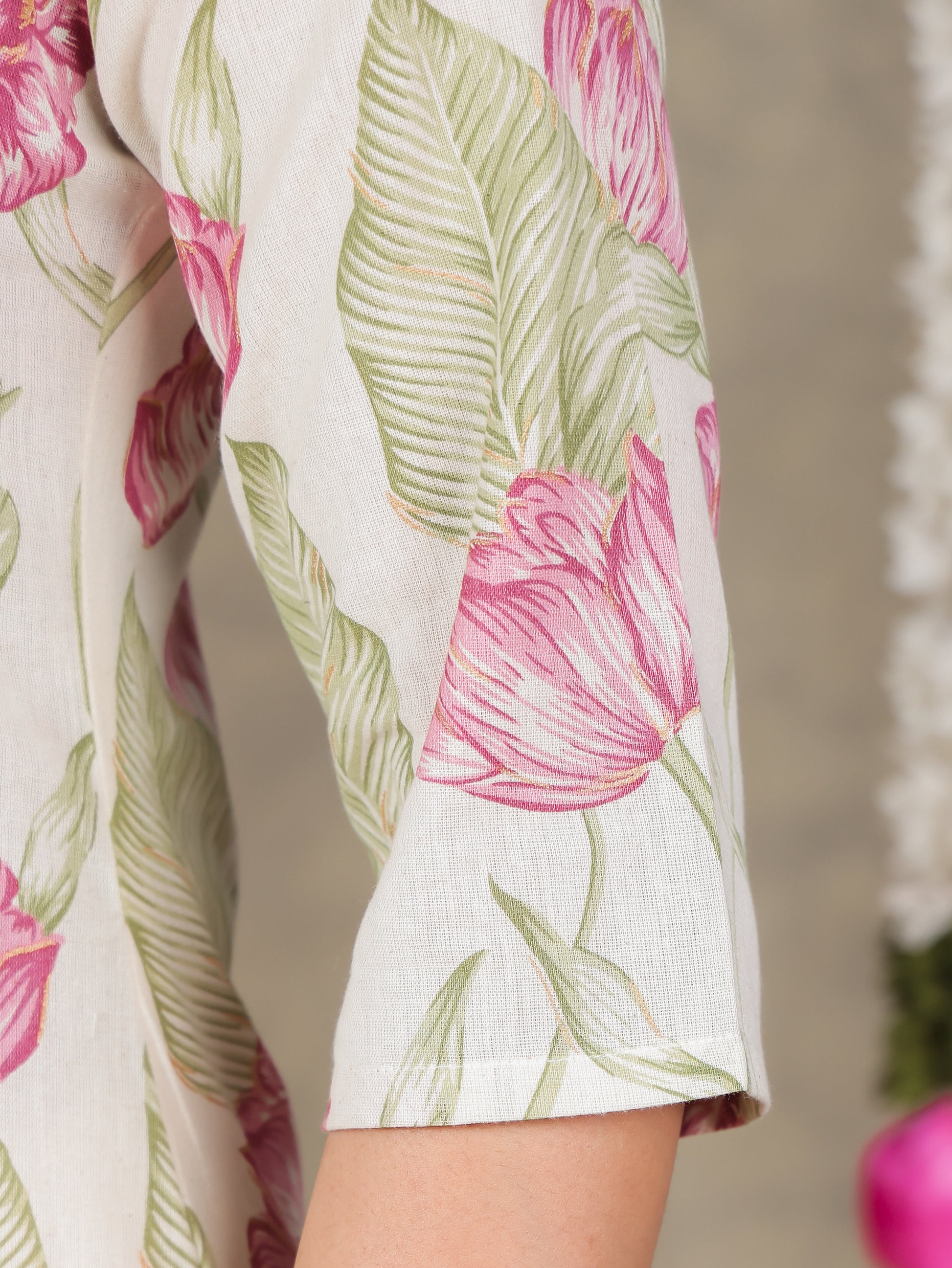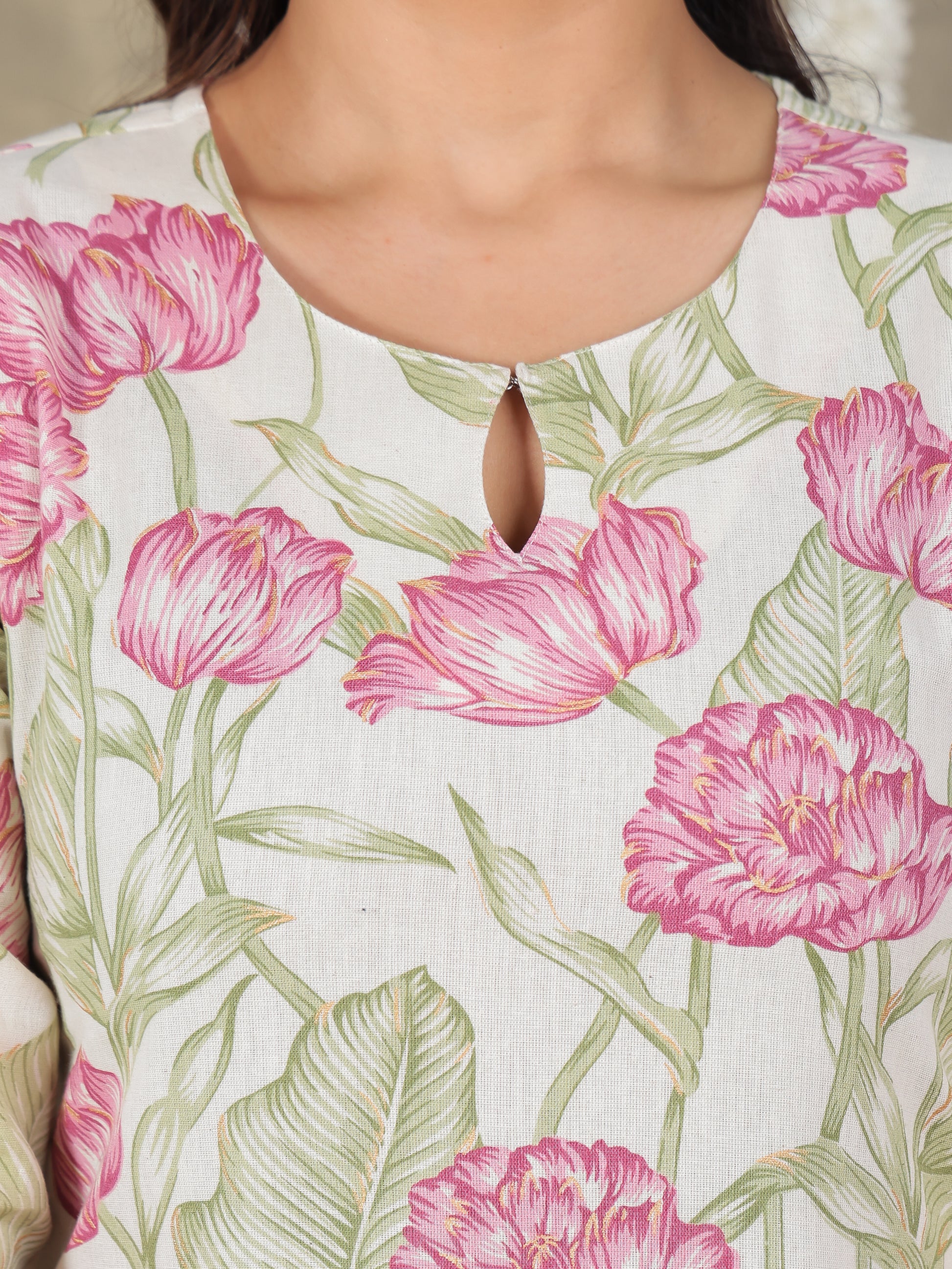 This Off White Straight kurta in soft Linen Cotton is a timeless pick for festive and casual wear. Designed with a Keyhole neckline and 3/4 Sleeve sleeves, its graceful Calf Length cut flatters all body types. The delicate Floral detailing adds a touch of sophistication. Pair it with statement earrings and juttis for a polished look. Maintain its pristine look by following proper care instructions.