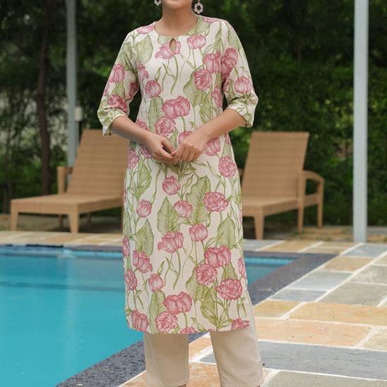 Linen Cotton Floral Straight Off White Kurta
