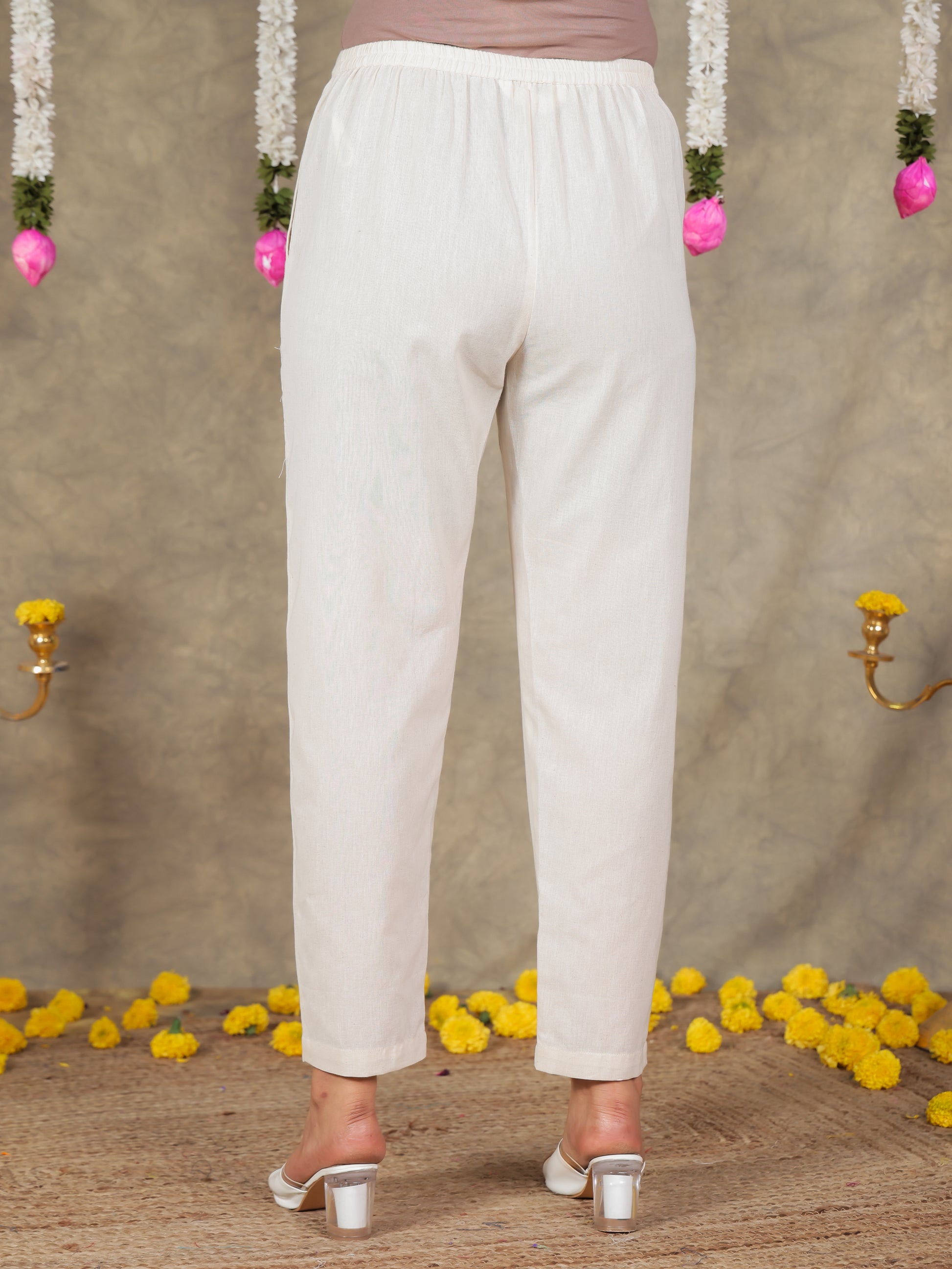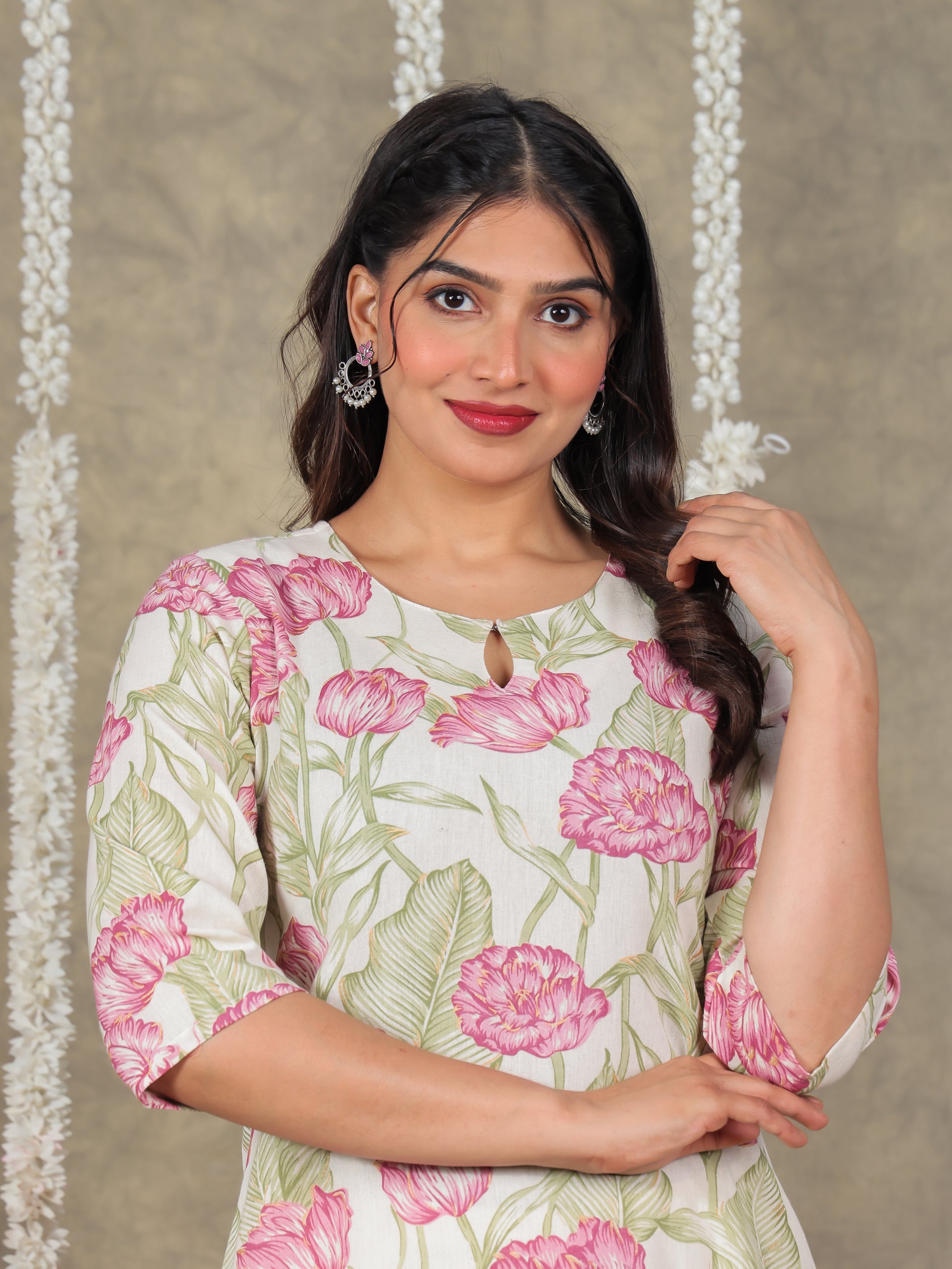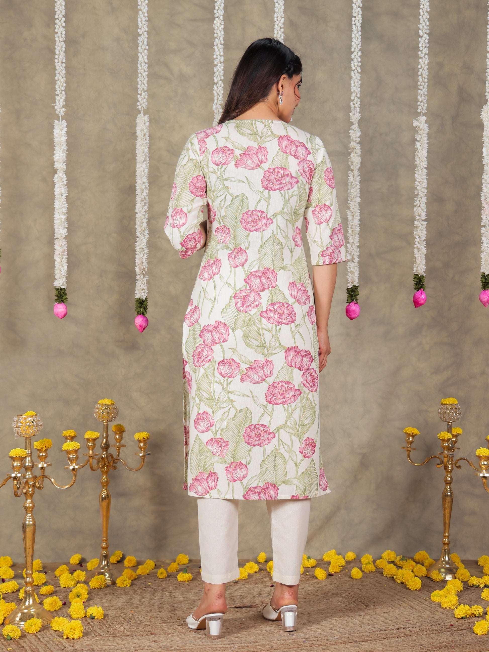 Elevate your ethnic wardrobe with this Linen Cotton kurta in a stunning Off White hue. Featuring an elegant Straight fit and striking Floral accents, it’s perfect for festive celebrations or family gatherings. The Keyhole neckline and 3/4 Sleeve provide all-day comfort. Team with gold-toned accessories for an effortlessly chic vibe. Maintain its charm by following proper care instructions.