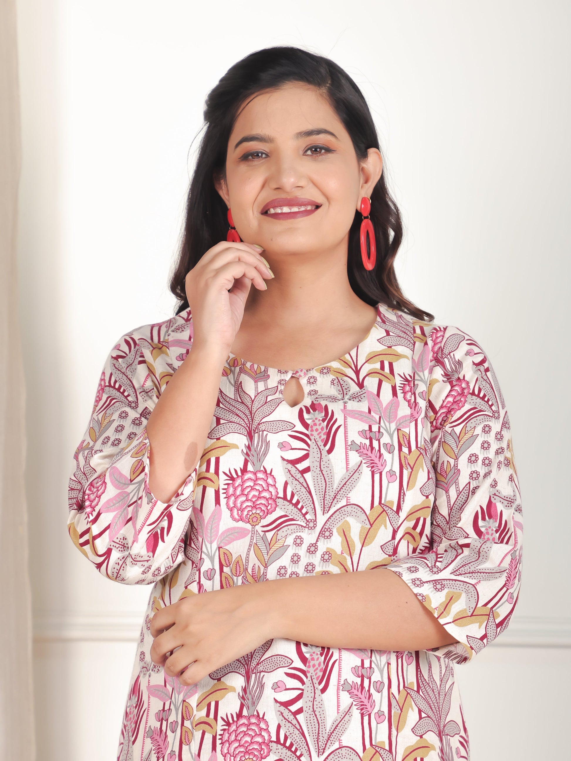 This Off White Linen Cotton kurta with a Panelled flare is designed for comfort and style. Featuring a Keyhole neckline, 3/4 Sleeve sleeves, and a graceful Calf Length hemline, it’s perfect for festive wear or semi-formal gatherings. The Floral highlights add depth and texture, making it a standout piece. Accessorise with a contrasting dupatta and keep it pristine by following proper care instructions.