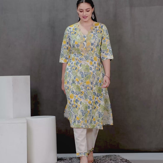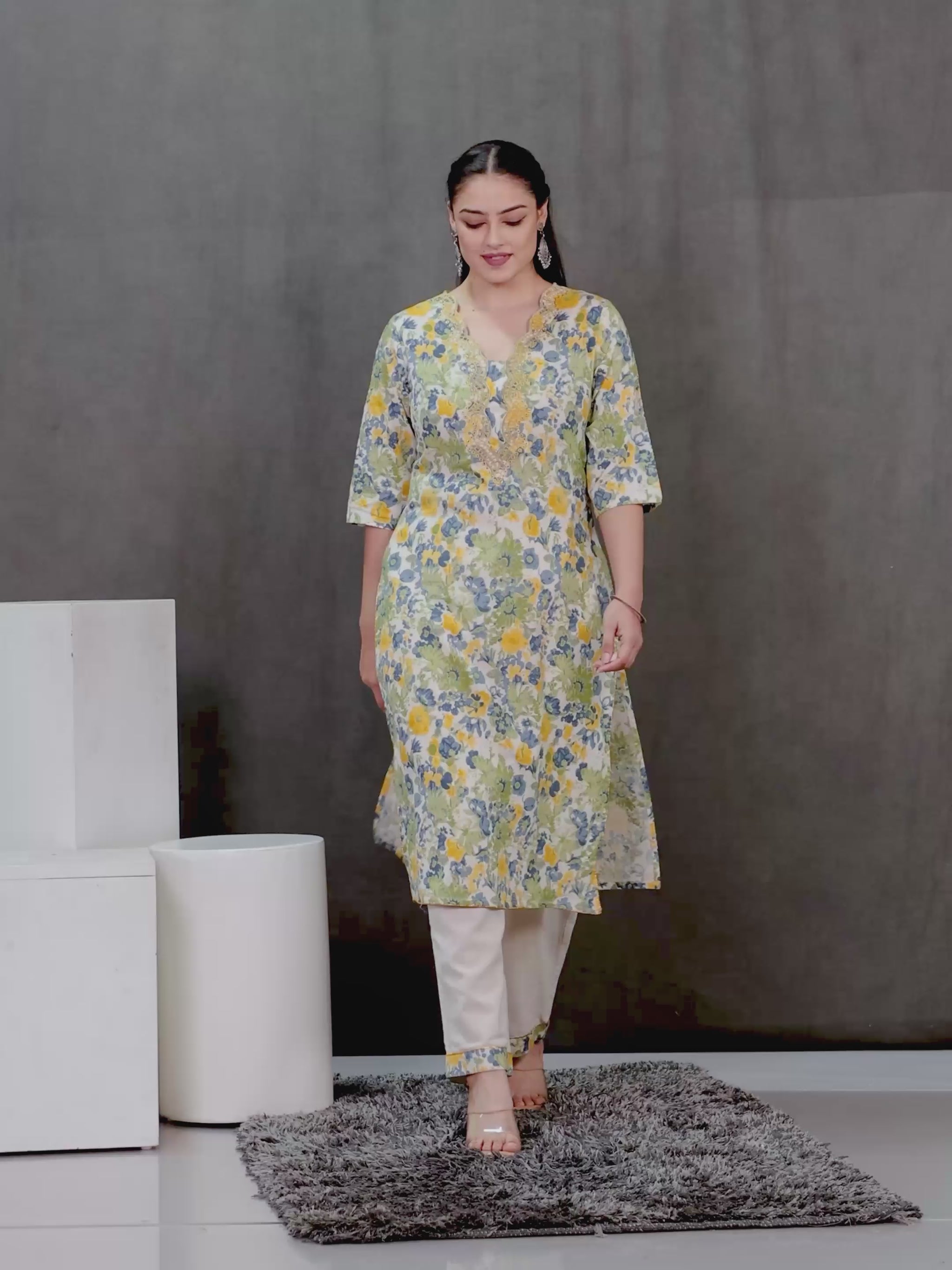Embroidered Linen Cotton Floral Straight Off-White Kurta