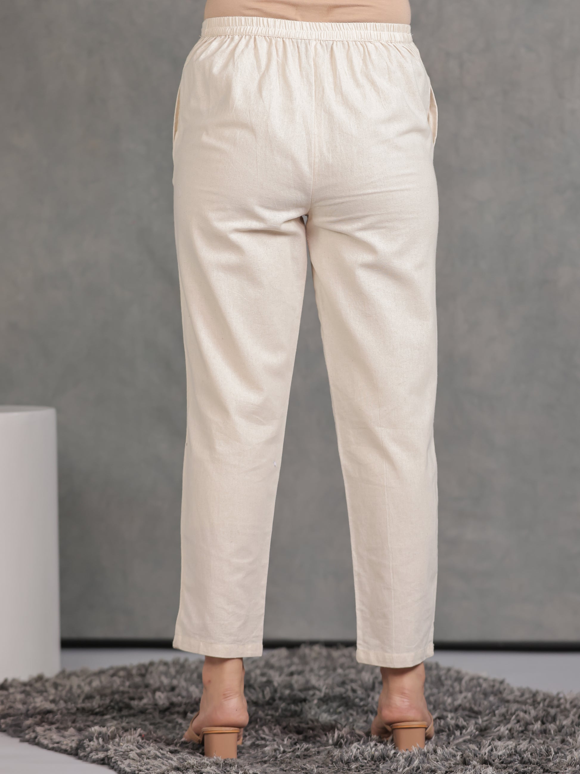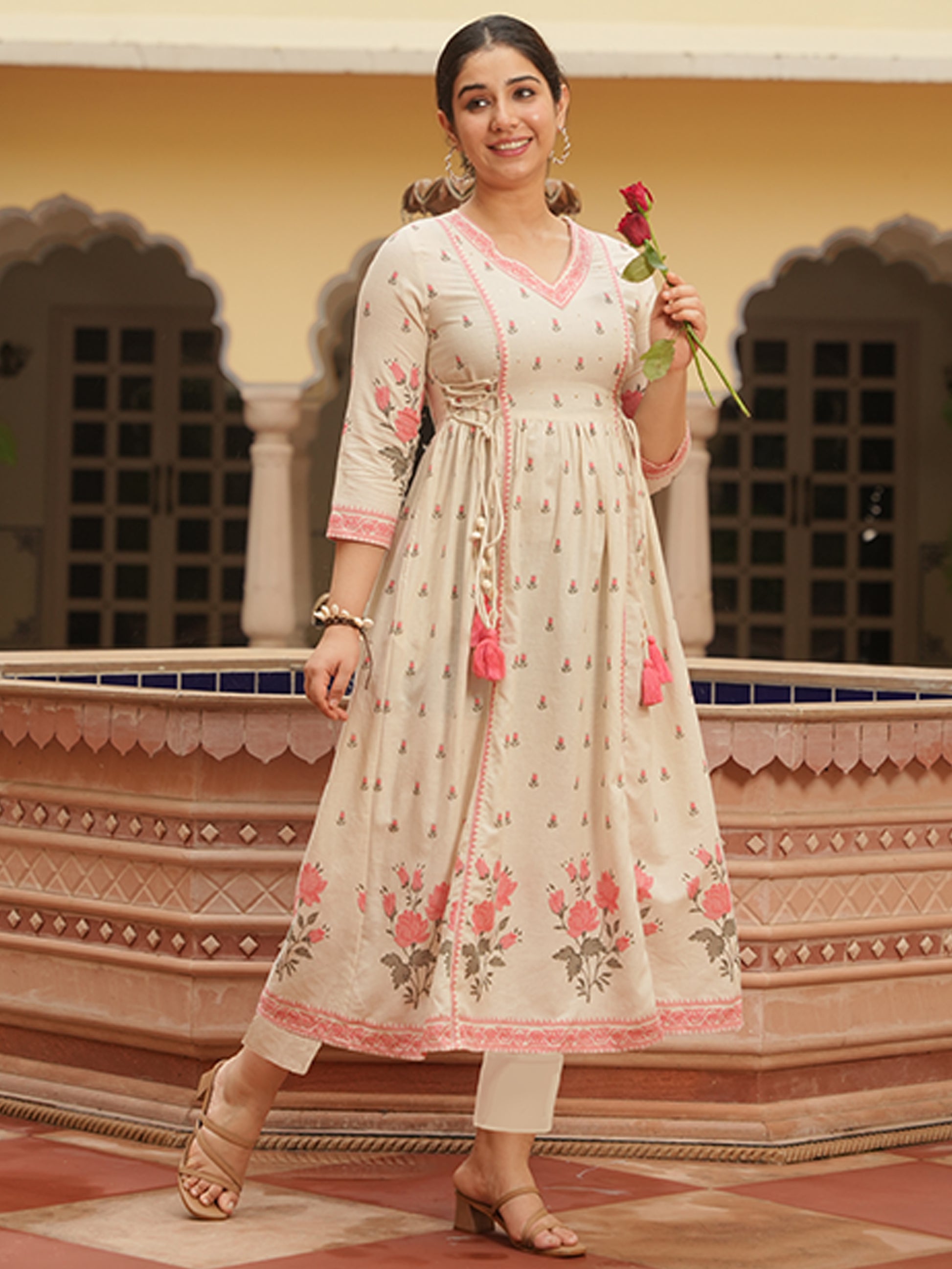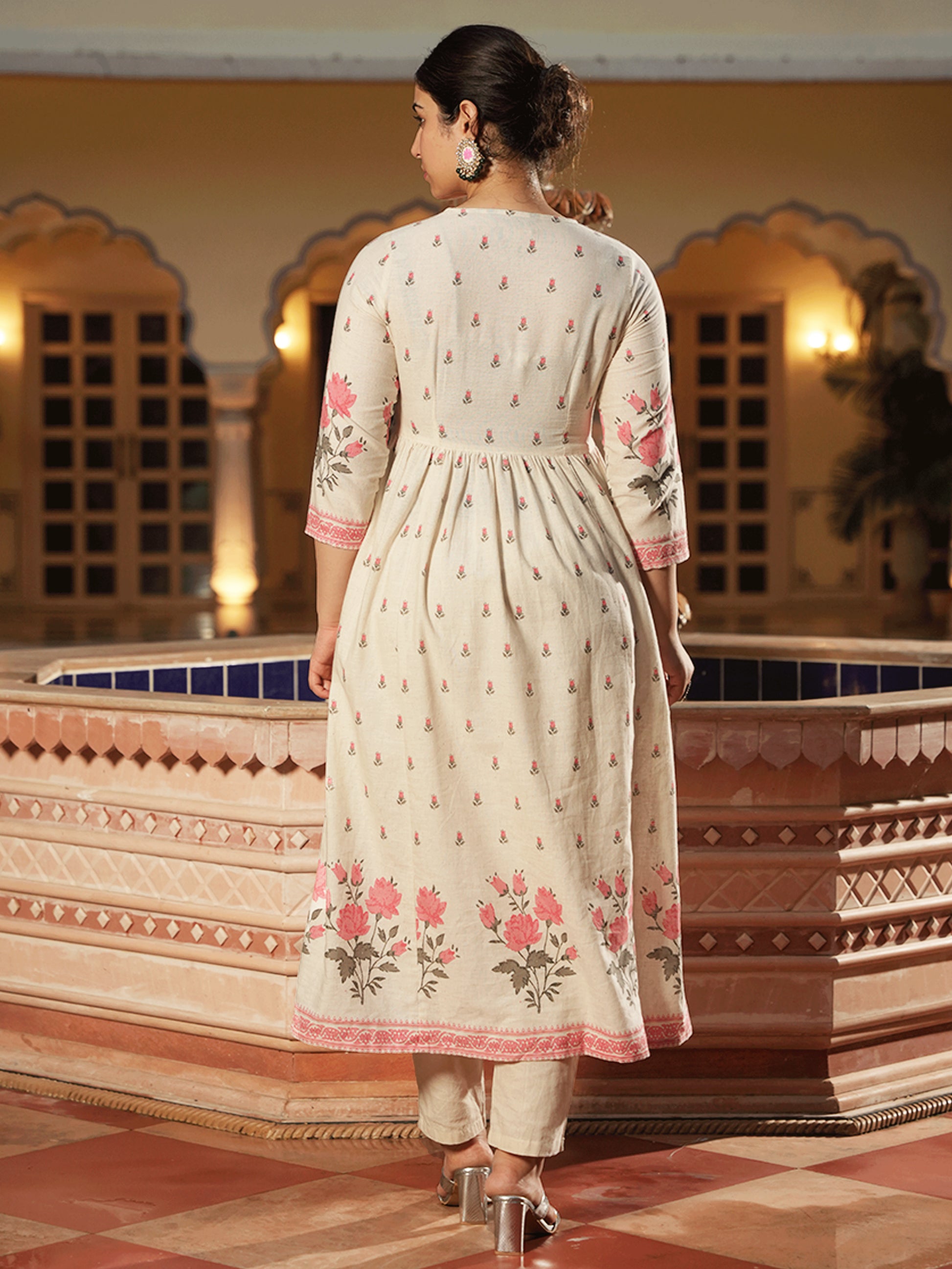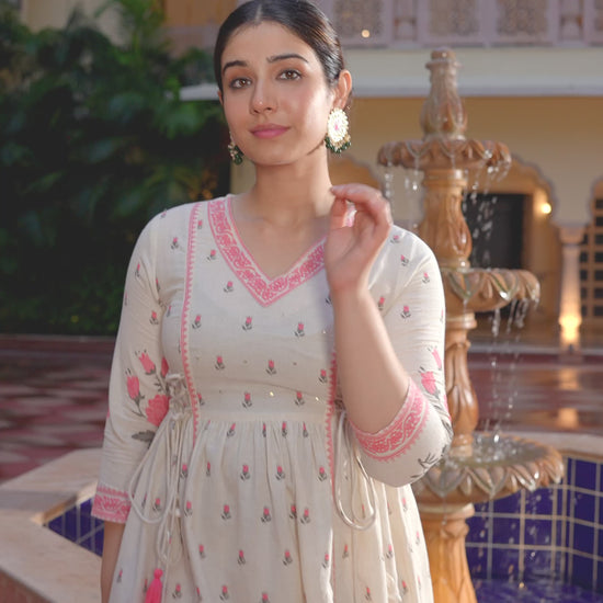 Embroidered Linen Cotton Floral Flared Off White Kurta