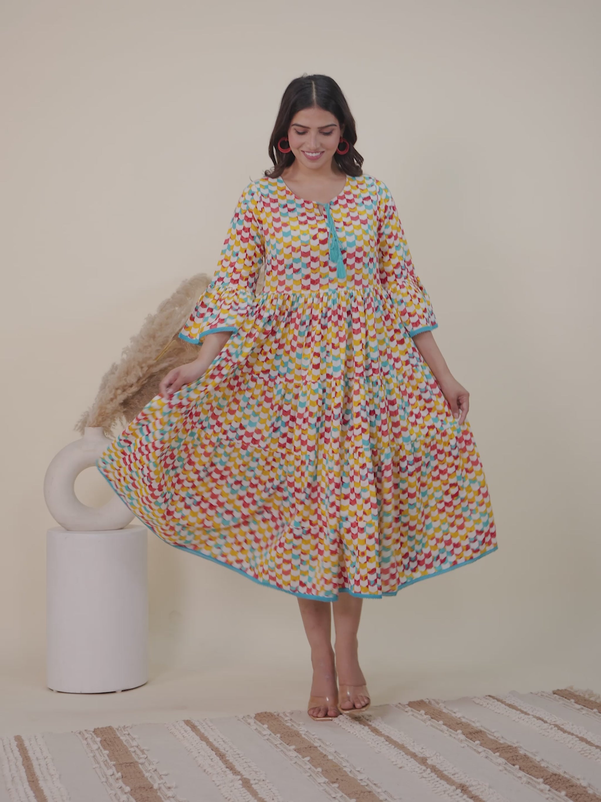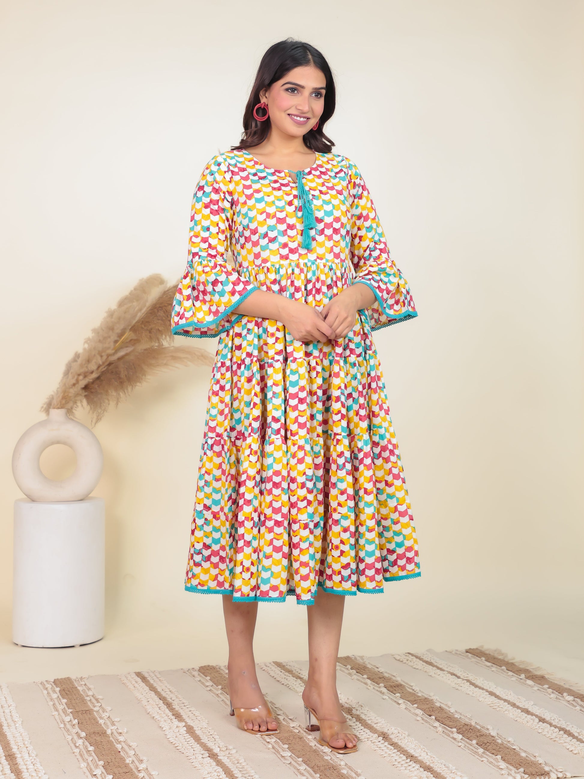 This Multicolor Tiered dress in Soft Cotton is perfect for effortless daily wear. The Geometric pattern and delicate work bring a modern yet artisanal touch. Lightweight and breathable, it’s ideal for warm days or casual outings. Pair with sandals or sneakers for a relaxed vibe. Easy to care for ensures hassle-free upkeep.
