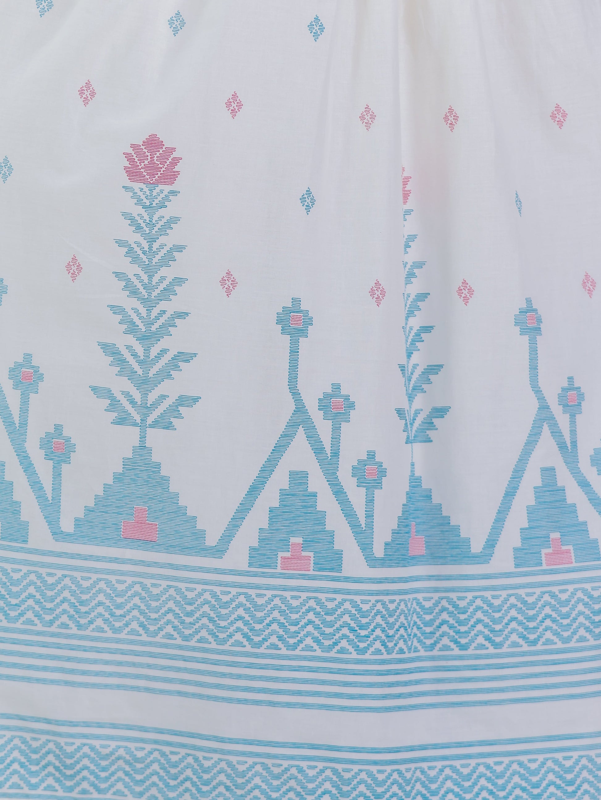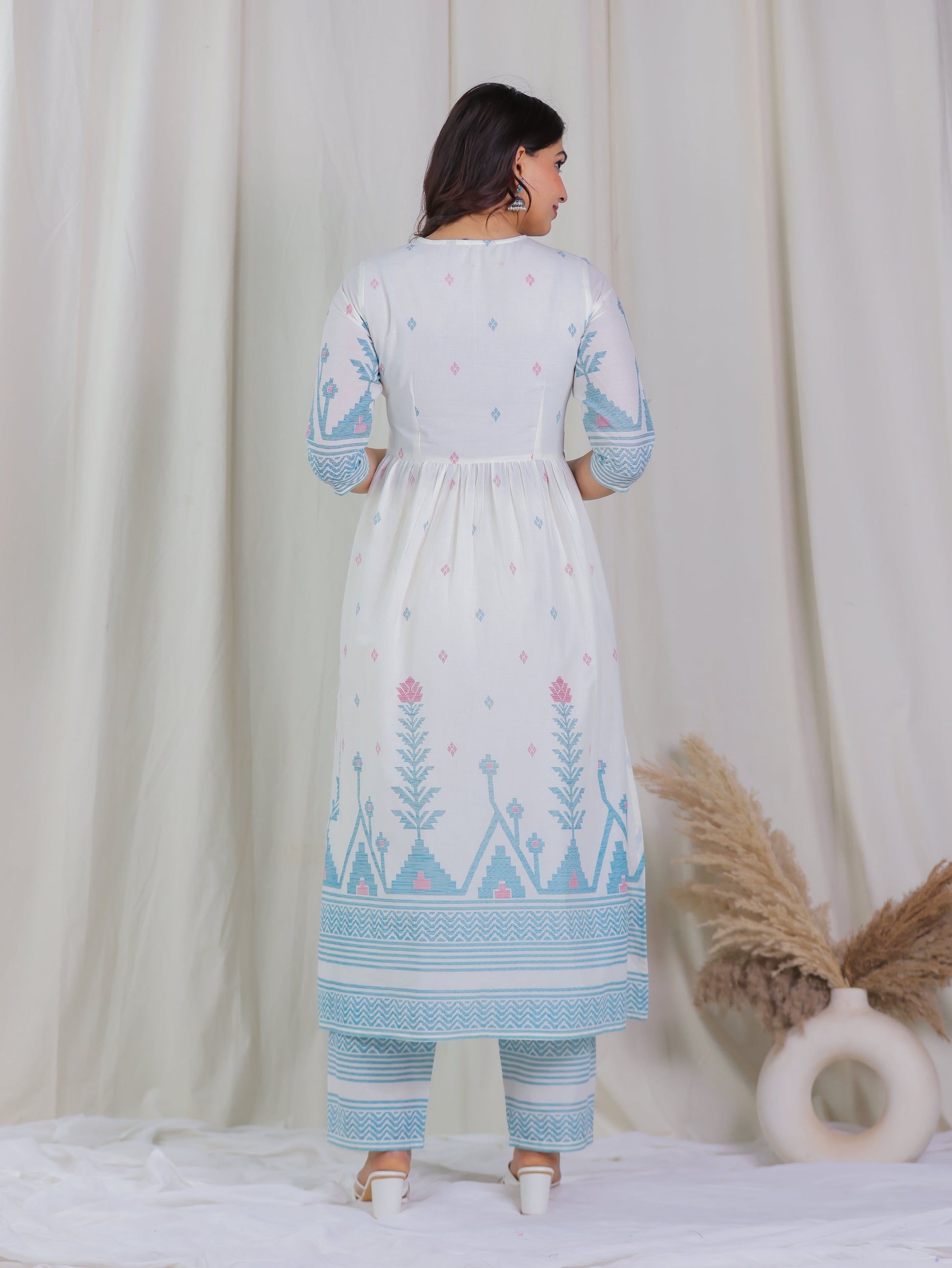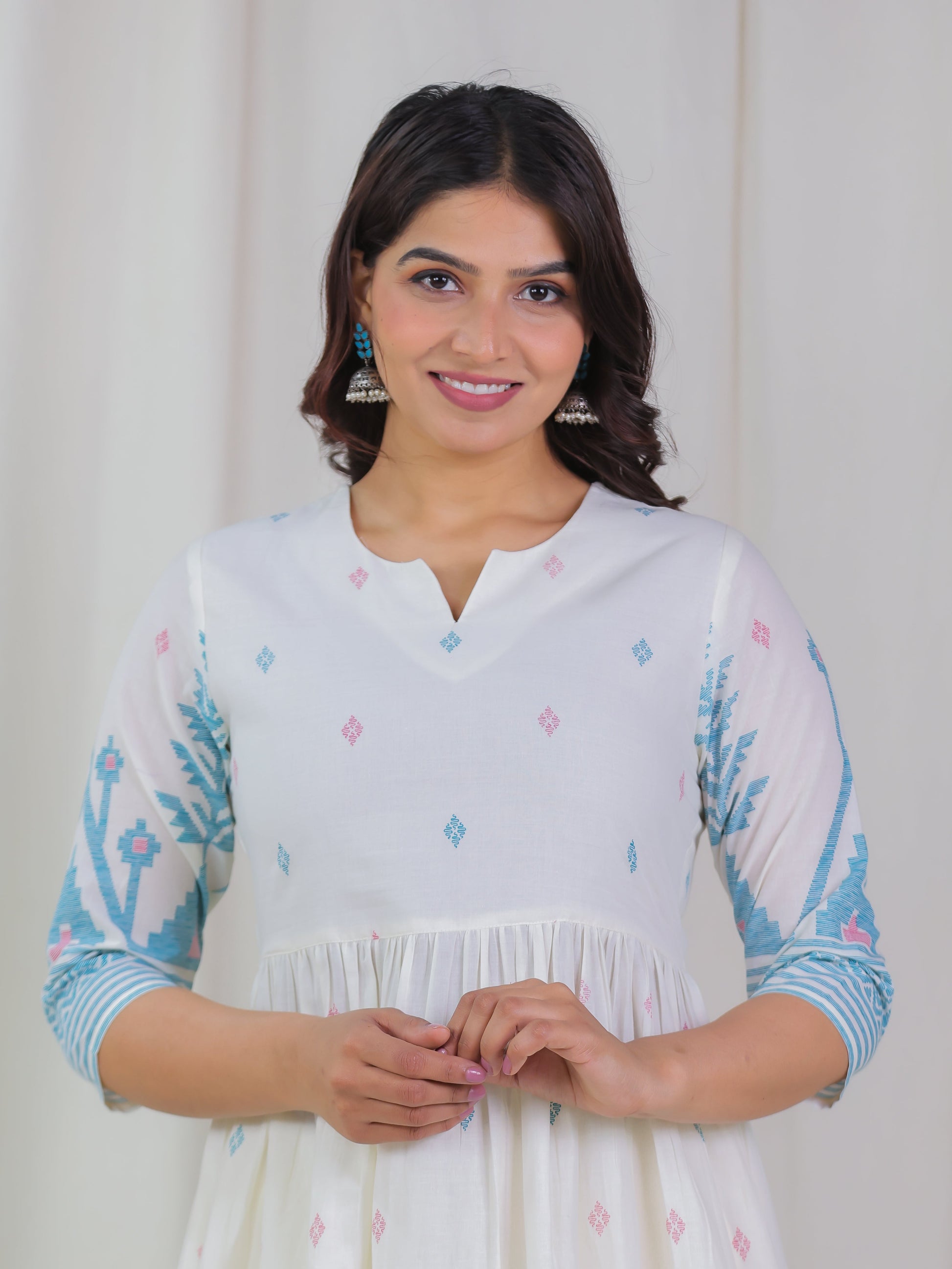 This Off White Gathered kurta in soft Soft Cotton is a timeless pick for festive and casual wear. Designed with a U neckline and 3/4 Sleeve sleeves, its graceful Calf Length cut flatters all body types. The delicate Geometric detailing adds a touch of sophistication. Pair it with statement earrings and juttis for a polished look. Maintain its pristine look by following proper care instructions.