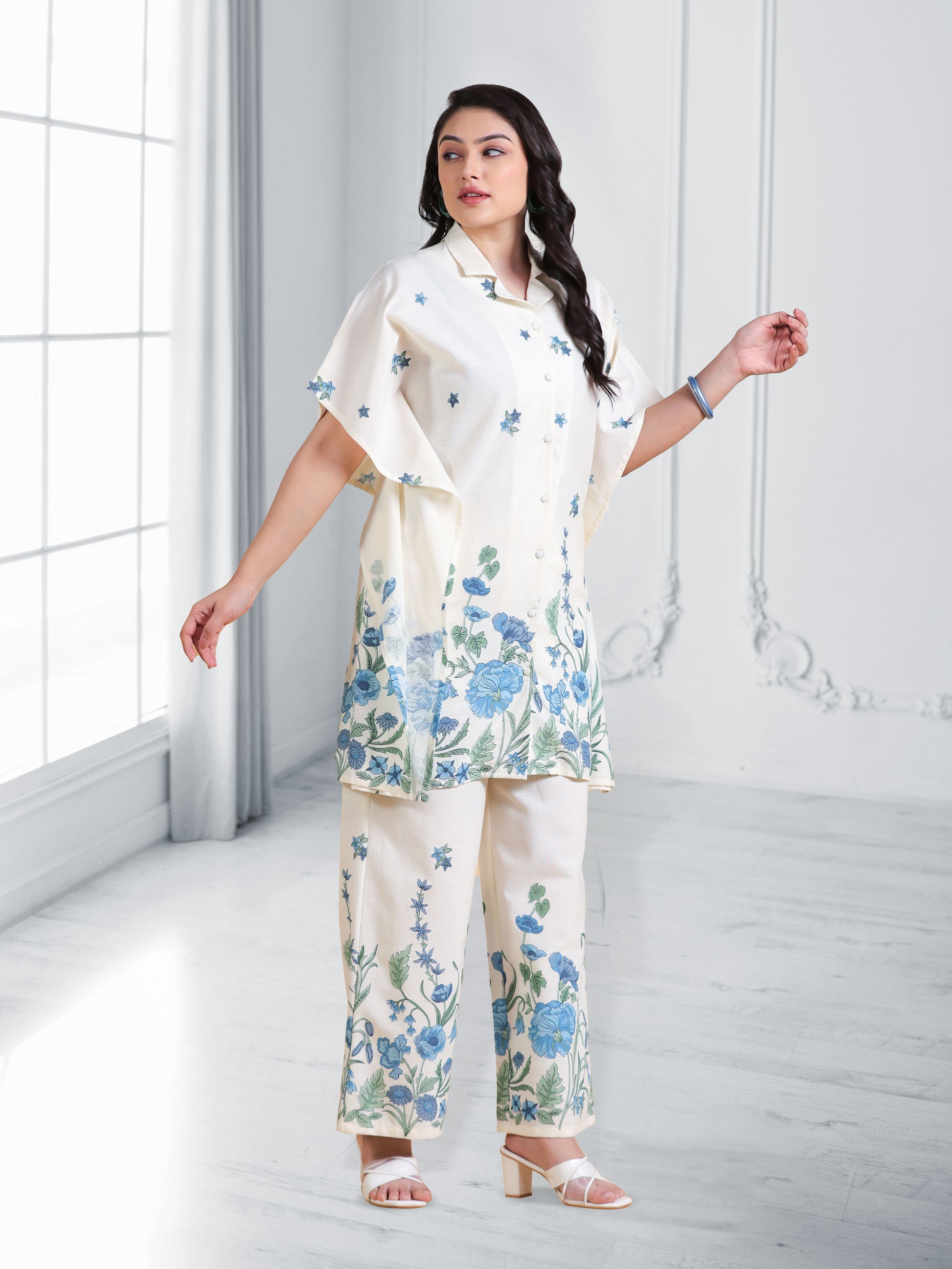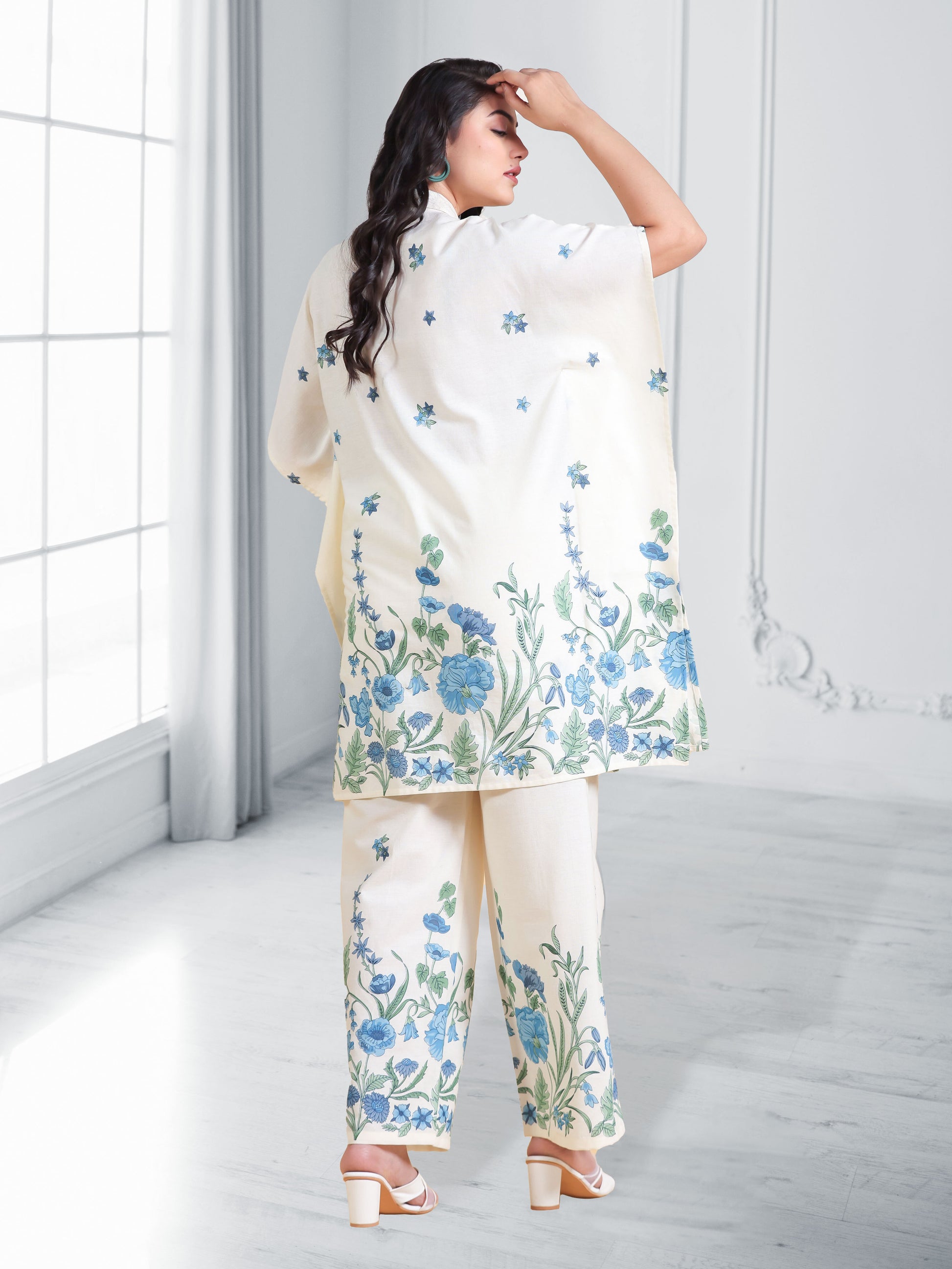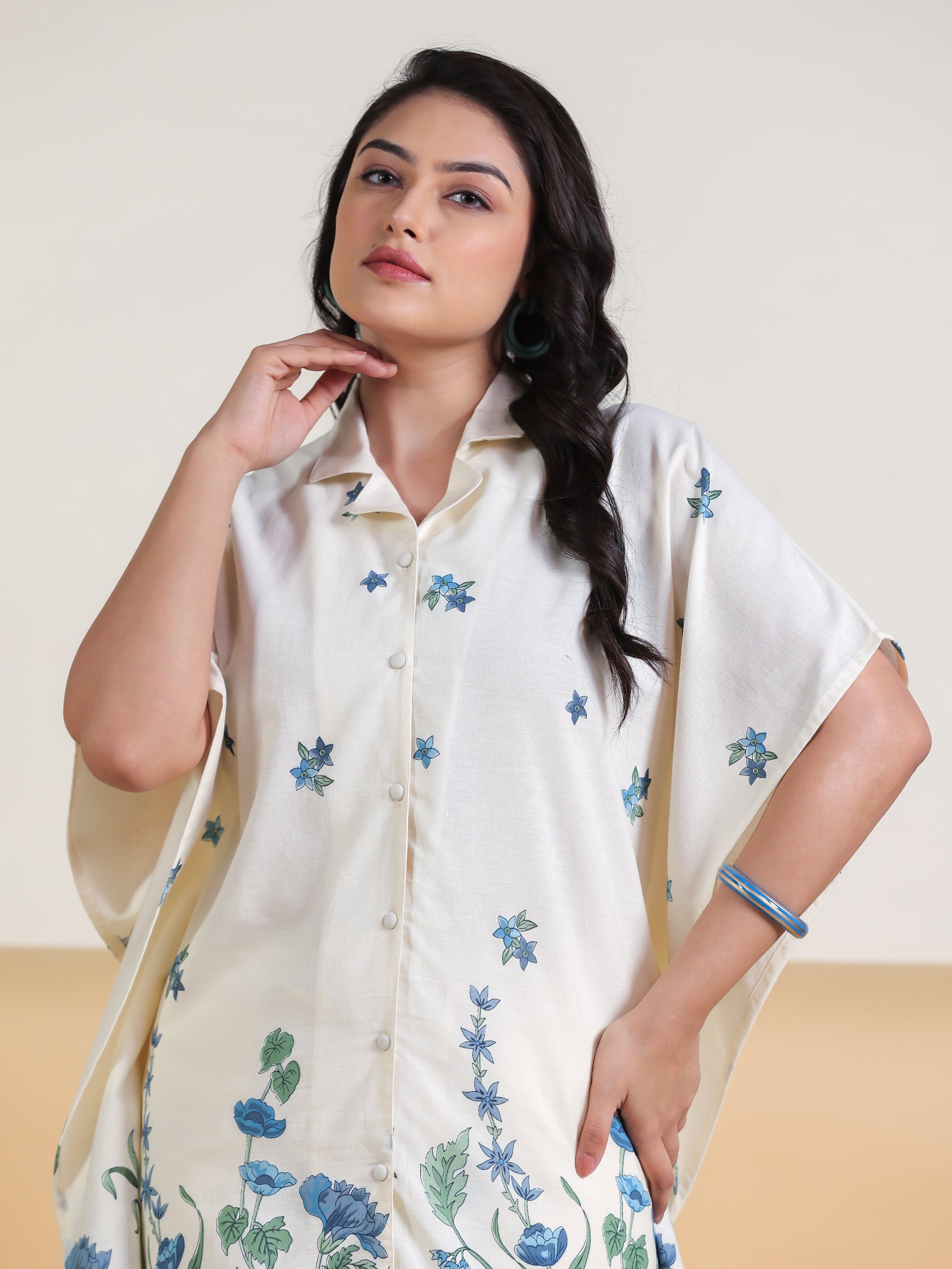 This Off White Kaftan kurta in soft Linen Cotton is a timeless pick for festive and casual wear. Designed with a Shirt Collar neckline and sleeves, its graceful cut flatters all body types. The delicate Placement Print detailing adds a touch of sophistication. Pair it with statement earrings and juttis for a polished look. Maintain its pristine look by following proper care instructions.