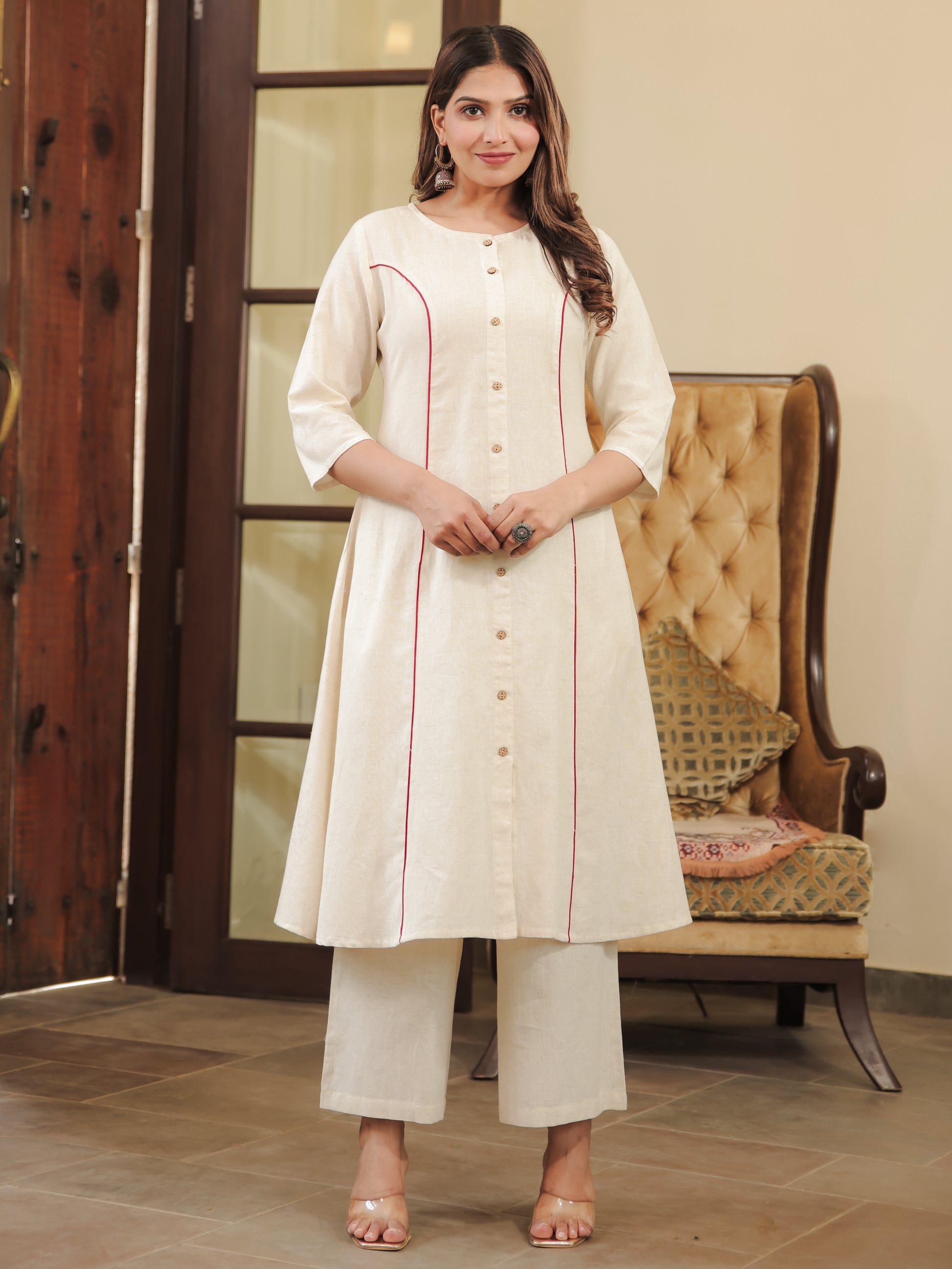 Linen Cotton Solid Flared Cream Kurta