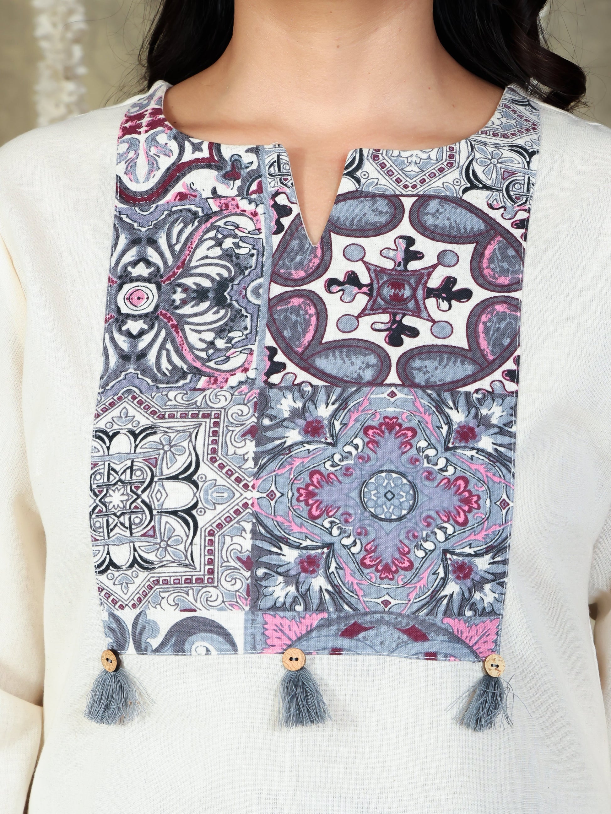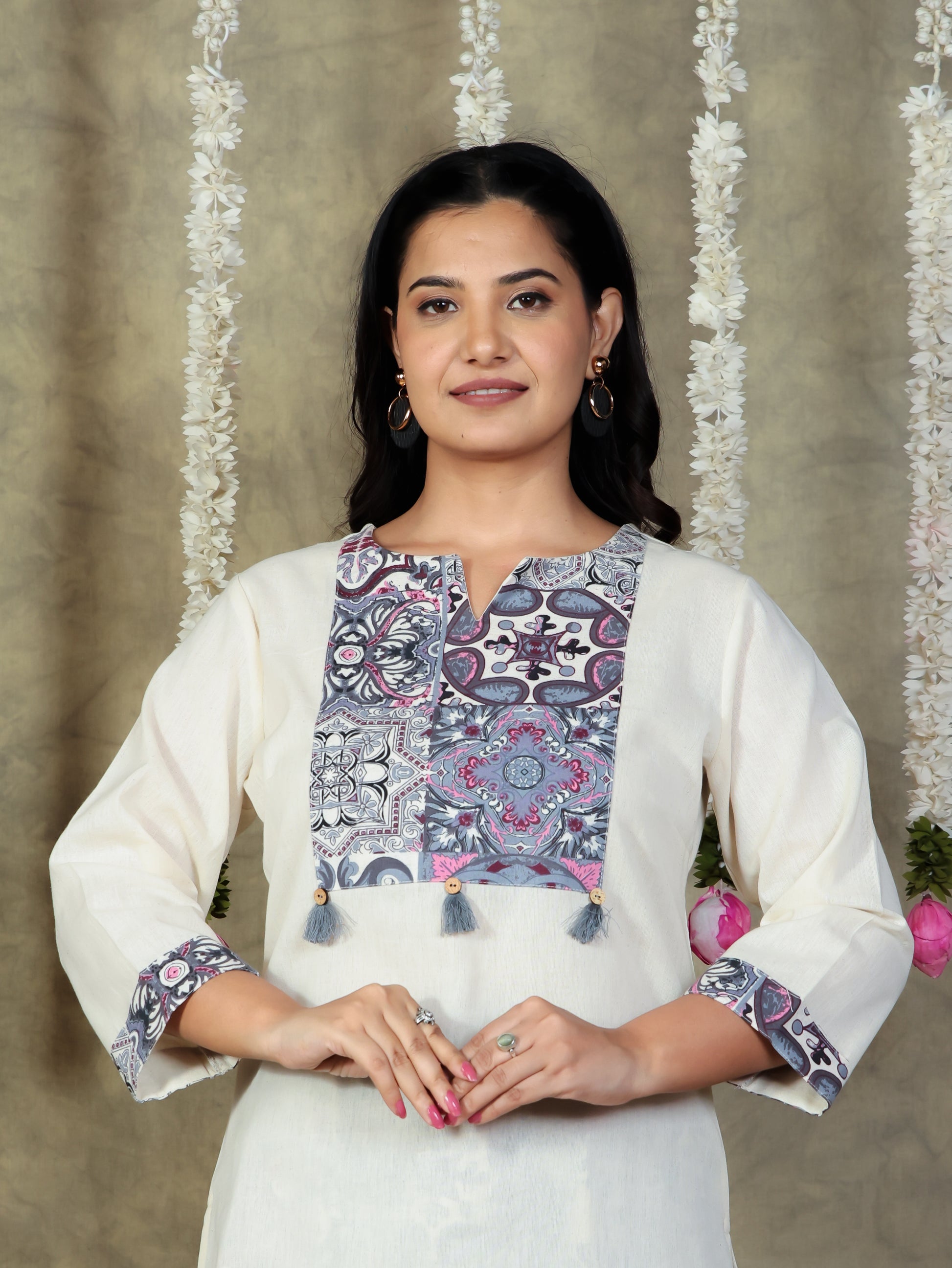 Elevate your ethnic wardrobe with this Linen Cotton kurta in a stunning Off White hue. Featuring an elegant Straight fit and striking Solid accents, it’s perfect for festive celebrations or family gatherings. The Round neckline and 3/4 Sleeve provide all-day comfort. Team with gold-toned accessories for an effortlessly chic vibe. Maintain its charm by following proper care instructions.