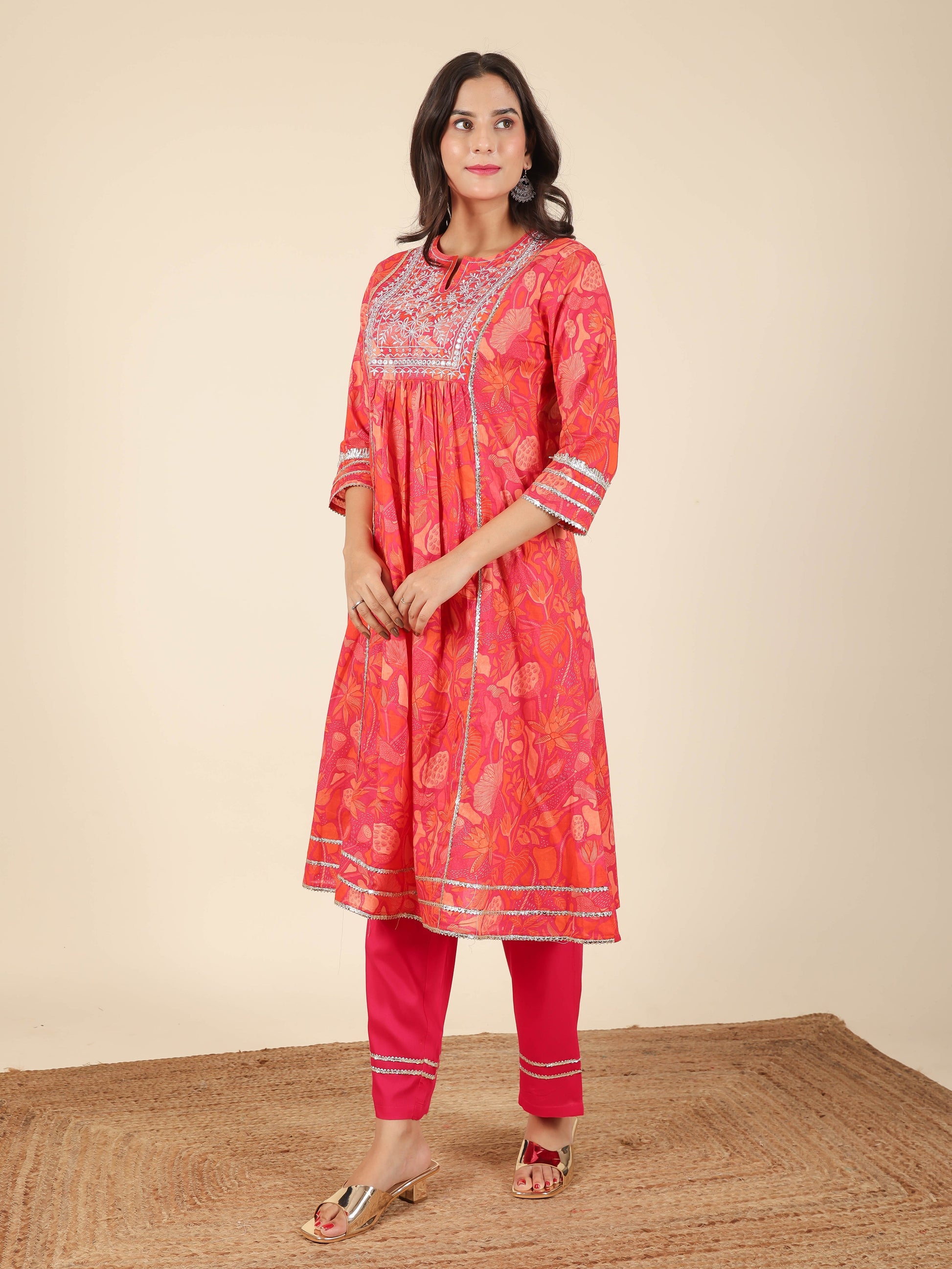This Orange Soft Cotton kurta with a Panelled flare is designed for comfort and style. Featuring a Round neckline, 3/4 Sleeve sleeves, and a graceful Calf Length hemline, it’s perfect for festive wear or semi-formal gatherings. The Floral highlights add depth and texture, making it a standout piece. Accessorise with a contrasting dupatta and keep it pristine by following proper care instructions.