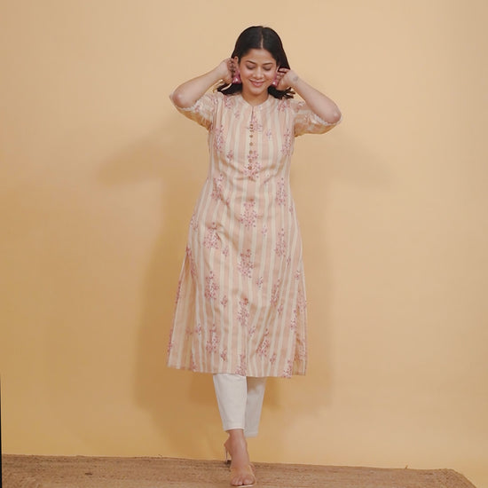 This Orange Straight kurta in soft Linen Cotton is a timeless pick for festive and casual wear. Designed with a Mandarin/Chinese neckline and 3/4 Sleeve sleeves, its graceful Calf Length cut flatters all body types. The delicate Floral detailing adds a touch of sophistication. Pair it with statement earrings and juttis for a polished look. Maintain its pristine look by following proper care instructions.
