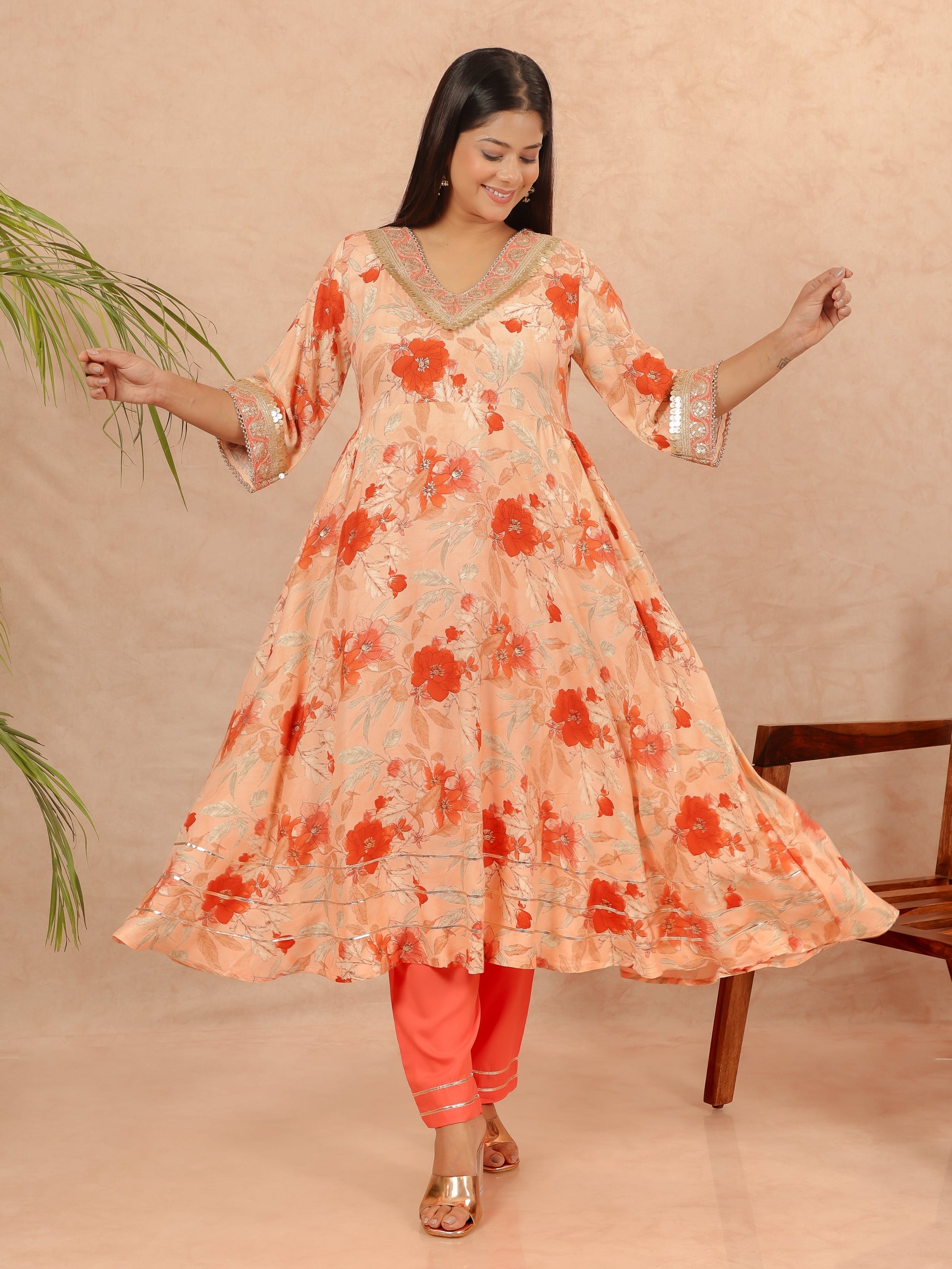 Muslin Floral Flared Orange Kurta