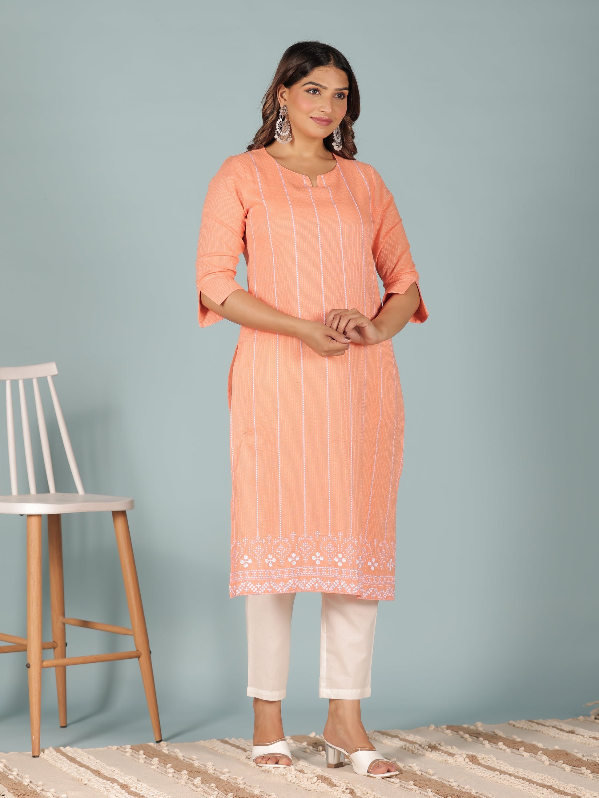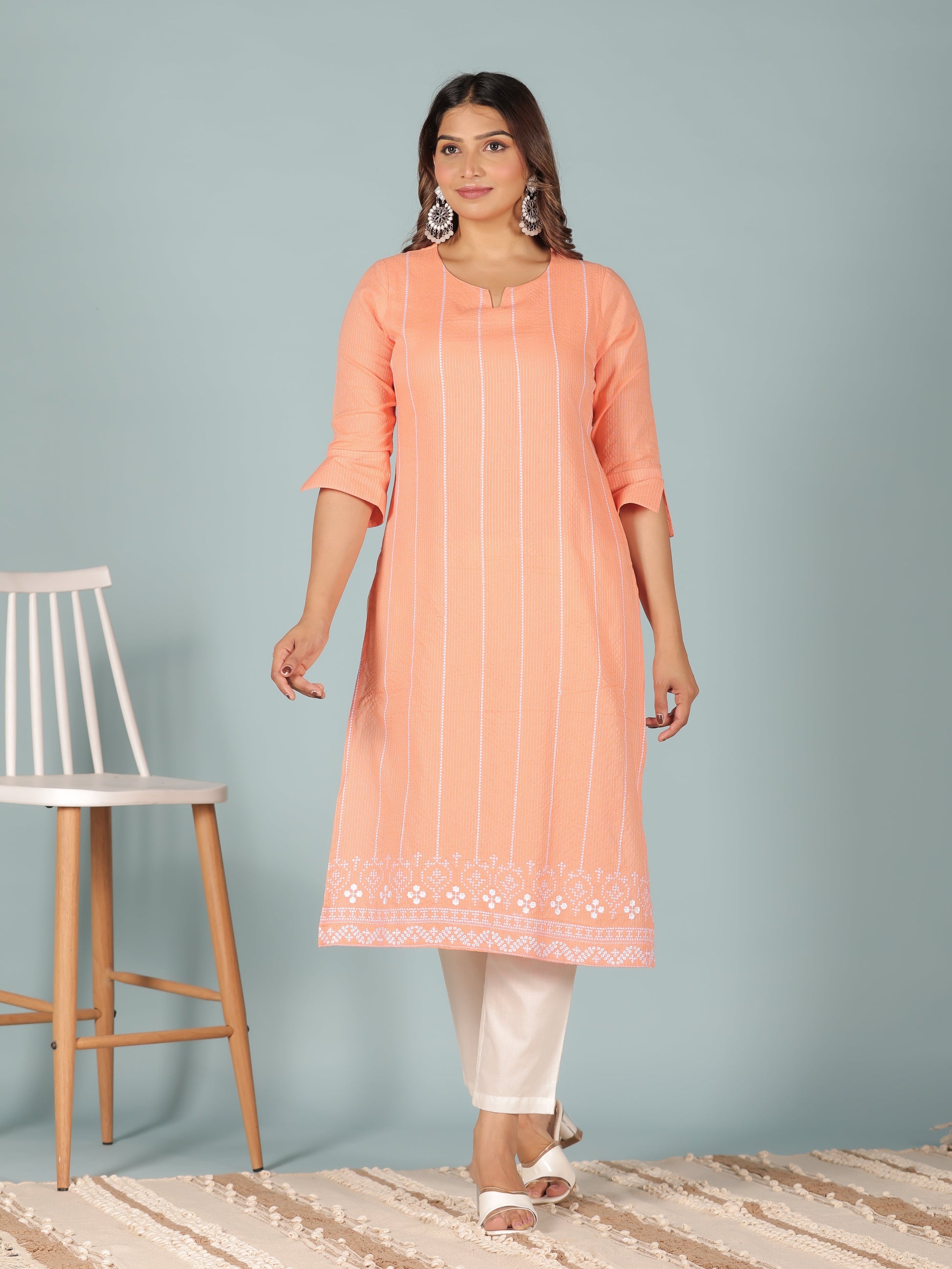 This Orange Kantha Cotton kurta with a Straight flare is designed for comfort and style. Featuring a Round neckline, 3/4 Sleeve sleeves, and a graceful Calf Length hemline, it’s perfect for festive wear or semi-formal gatherings. The Solid highlights add depth and texture, making it a standout piece. Accessorise with a contrasting dupatta and keep it pristine by following proper care instructions.
