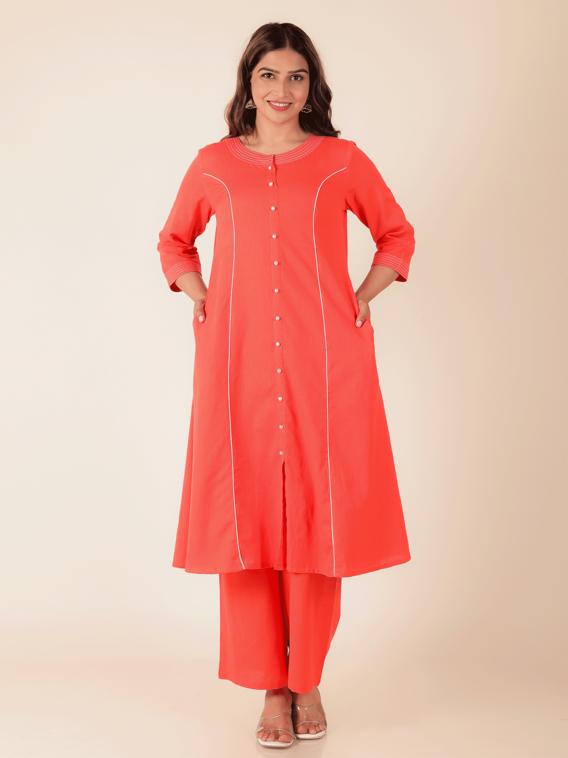 Elevate your ethnic wardrobe with this Linen Cotton kurta in a stunning Orange hue. Featuring an elegant A-line fit and striking Solid accents, it’s perfect for festive celebrations or family gatherings. The Round neckline and 3/4 Sleeve provide all-day comfort. Team with gold-toned accessories for an effortlessly chic vibe. Maintain its charm by following proper care instructions.