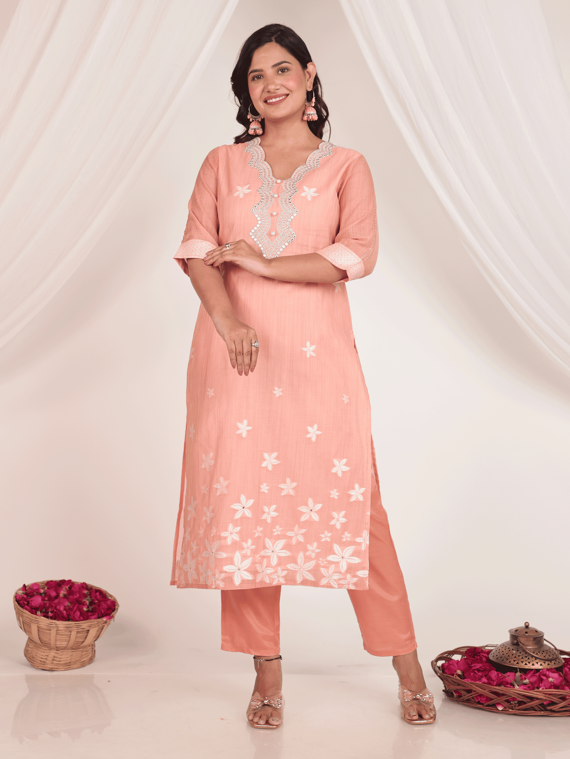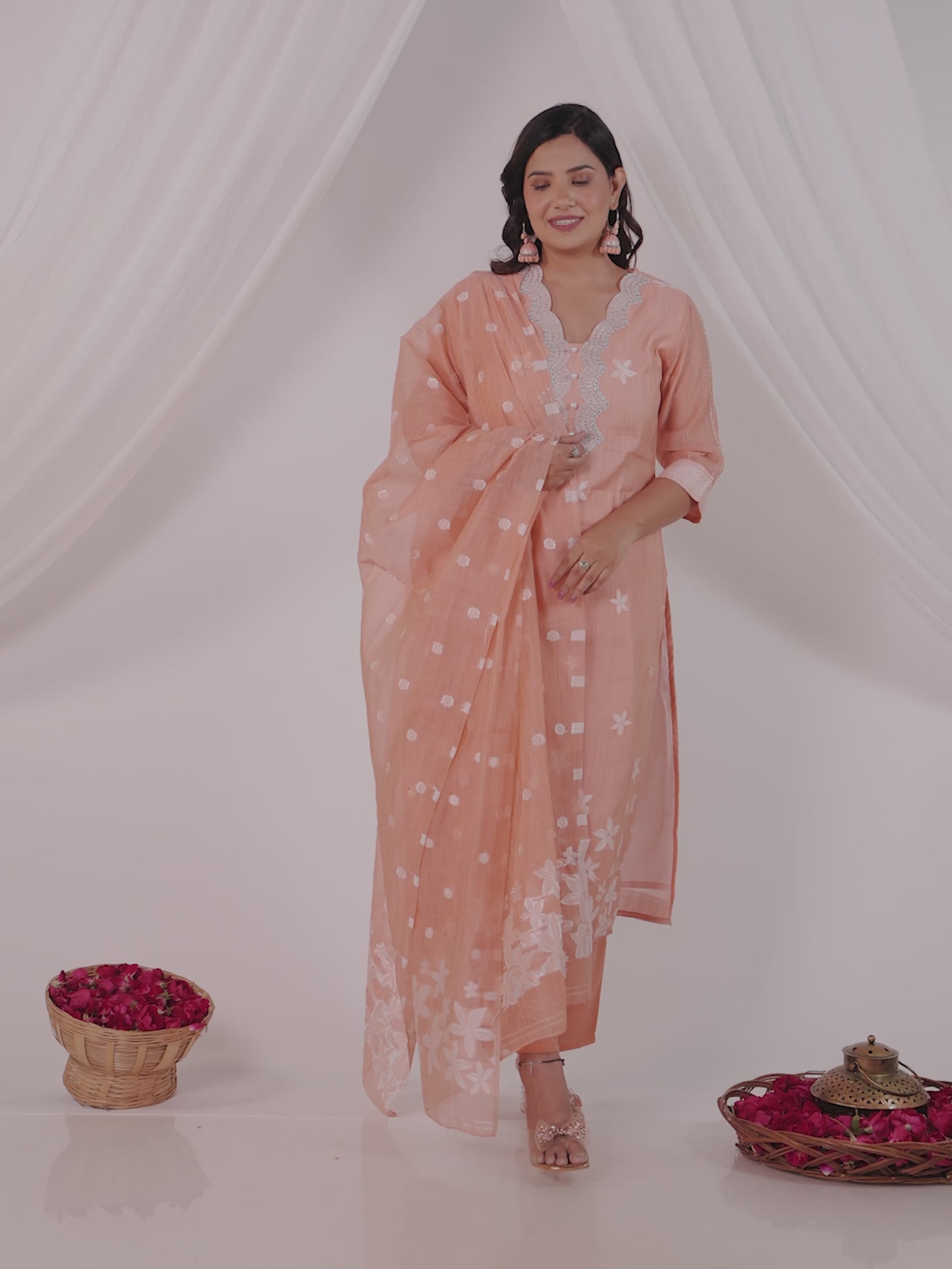 This Peach Chanderi kurta with a Straight flare is designed for comfort and style. Featuring a V neckline, 3/4 Sleeve sleeves, and a graceful Calf Length hemline, it’s perfect for festive wear or semi-formal gatherings. The Floral highlights add depth and texture, making it a standout piece. Accessorise with a contrasting dupatta and keep it pristine by following proper care instructions.