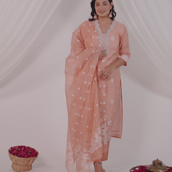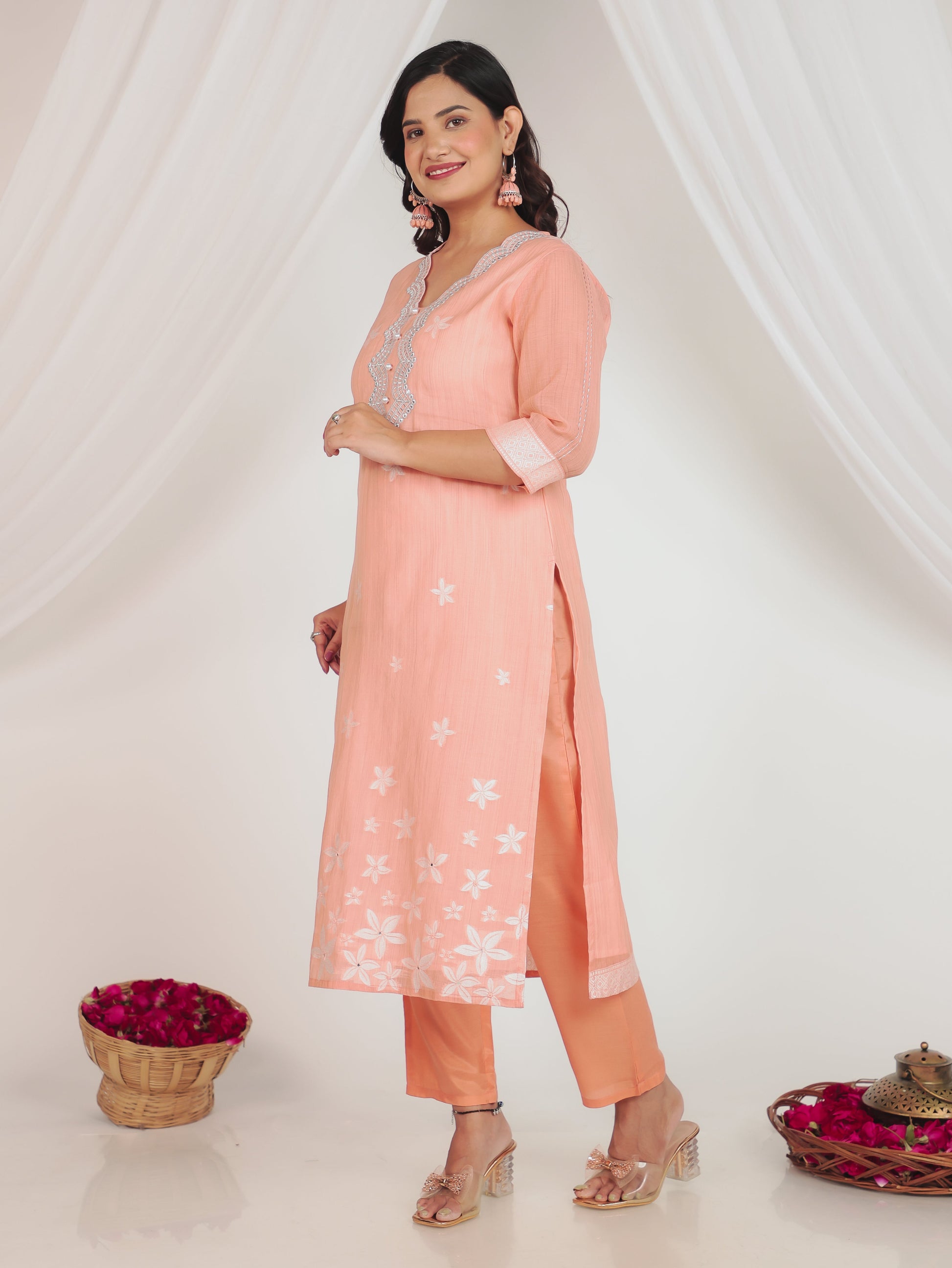 Elevate your ethnic wardrobe with this Chanderi kurta in a stunning Peach hue. Featuring an elegant Straight fit and striking Floral accents, it’s perfect for festive celebrations or family gatherings. The V neckline and 3/4 Sleeve provide all-day comfort. Team with gold-toned accessories for an effortlessly chic vibe. Maintain its charm by following proper care instructions.