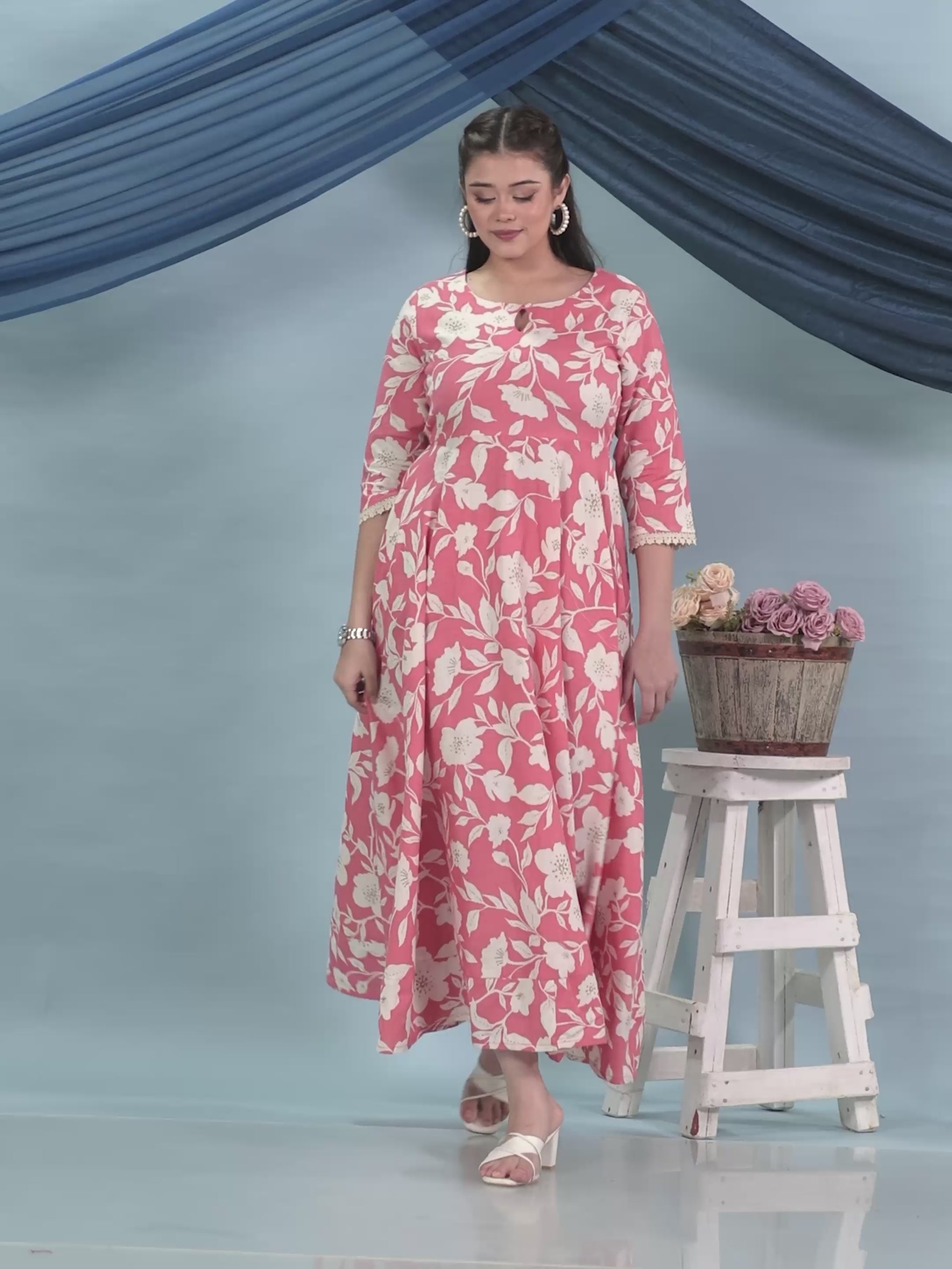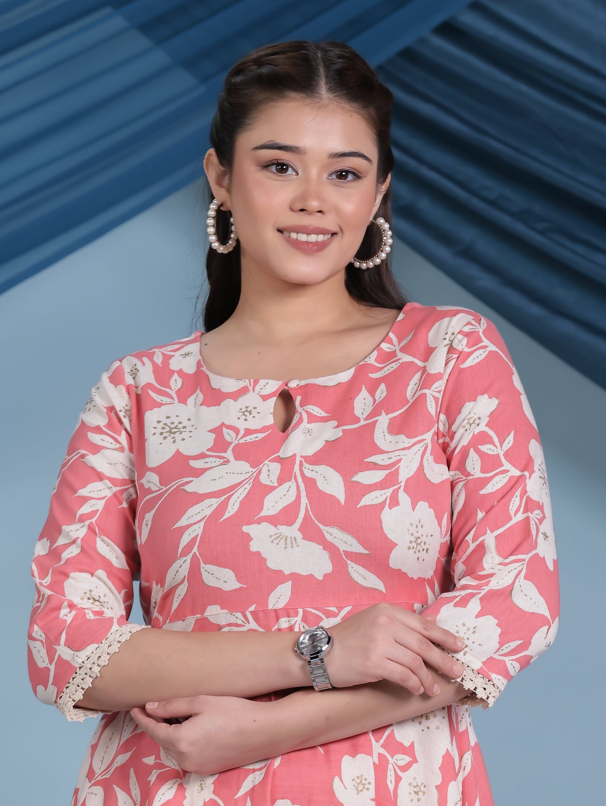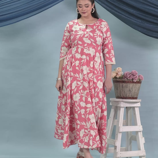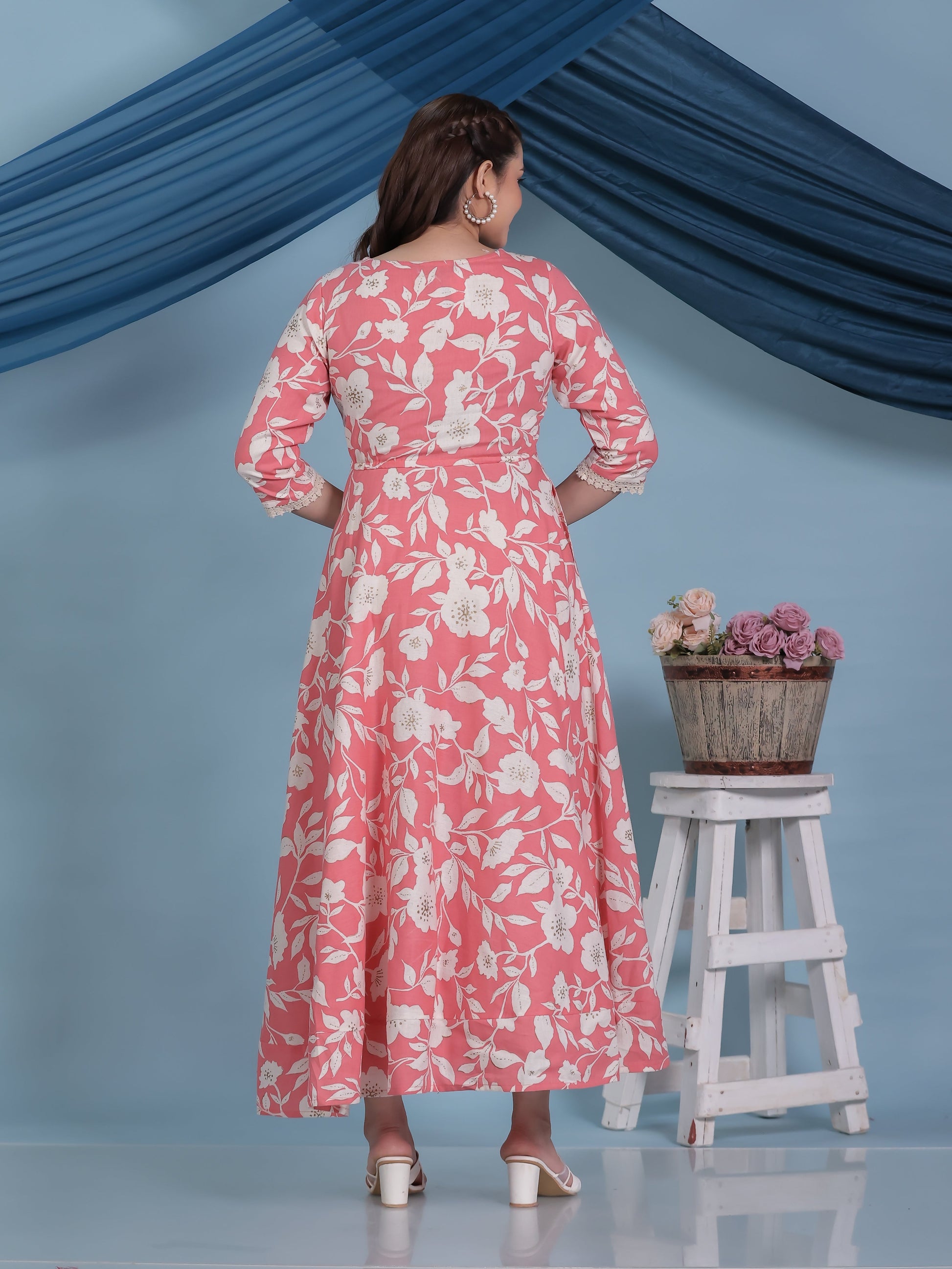 Linen Cotton Floral Anarkali Peach Dress (With Bag)