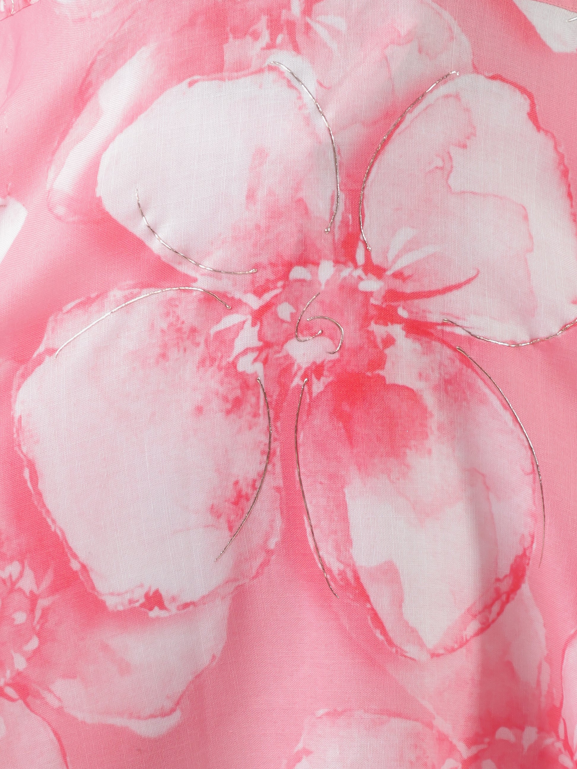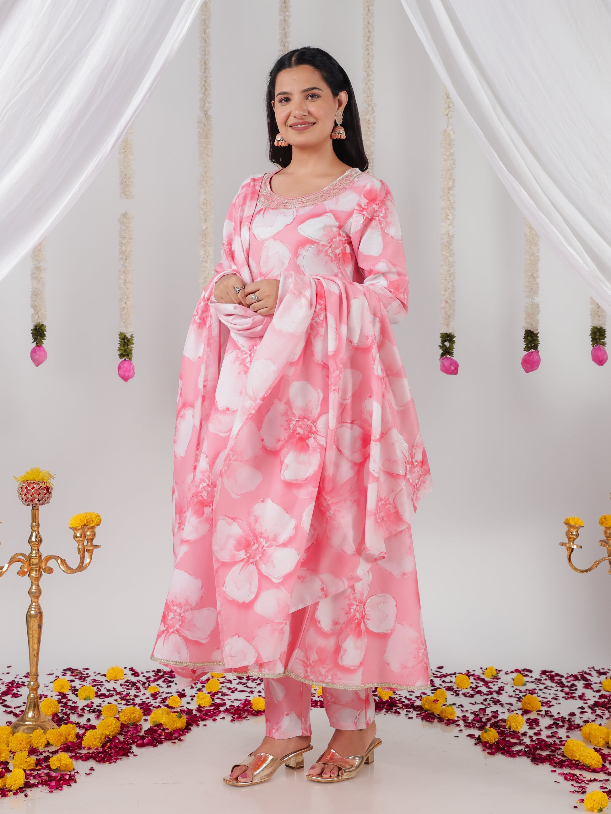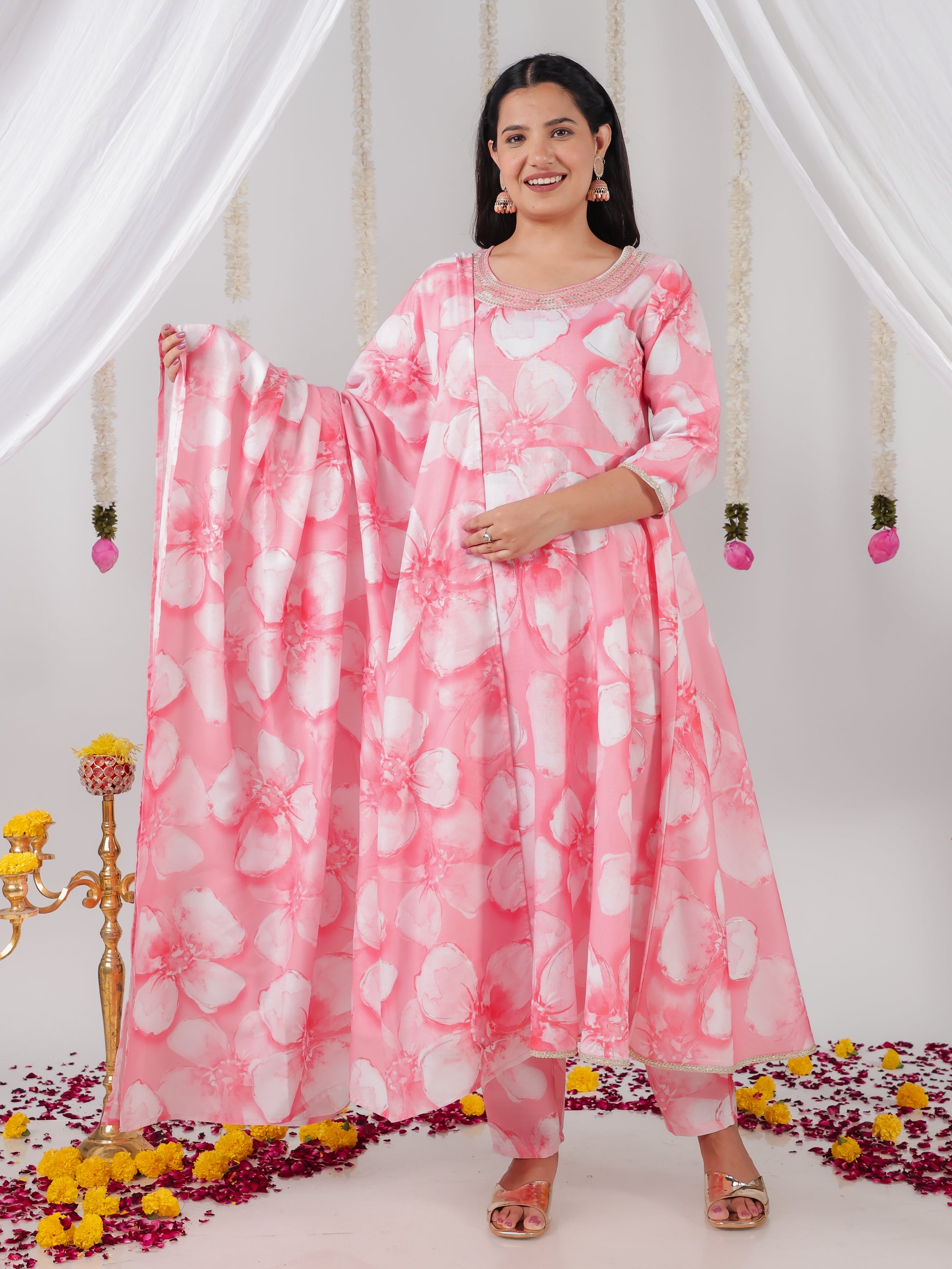 Embroidered Roman silk Floral Anarkali Pink Kurta