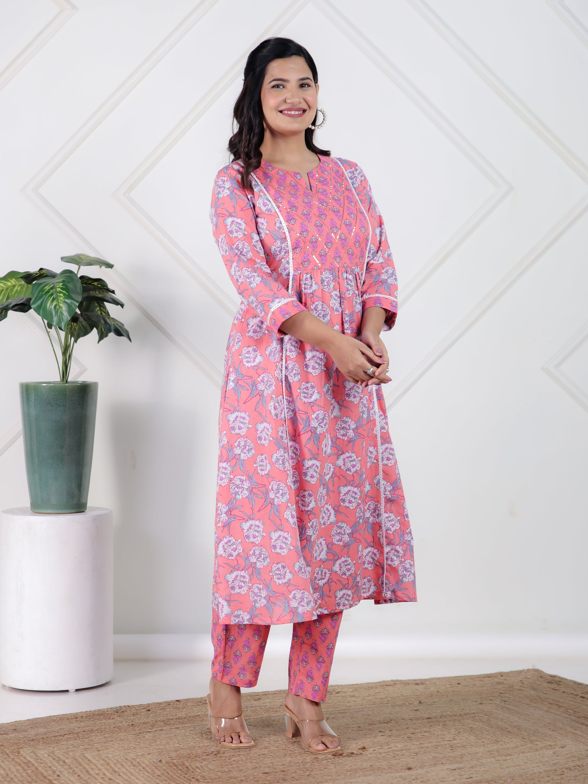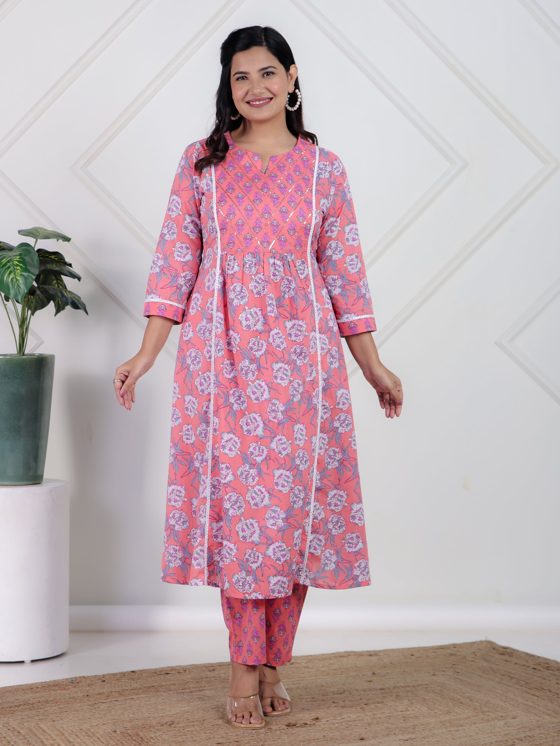 Embroidered Soft Cotton Floral Panelled Peach Kurta