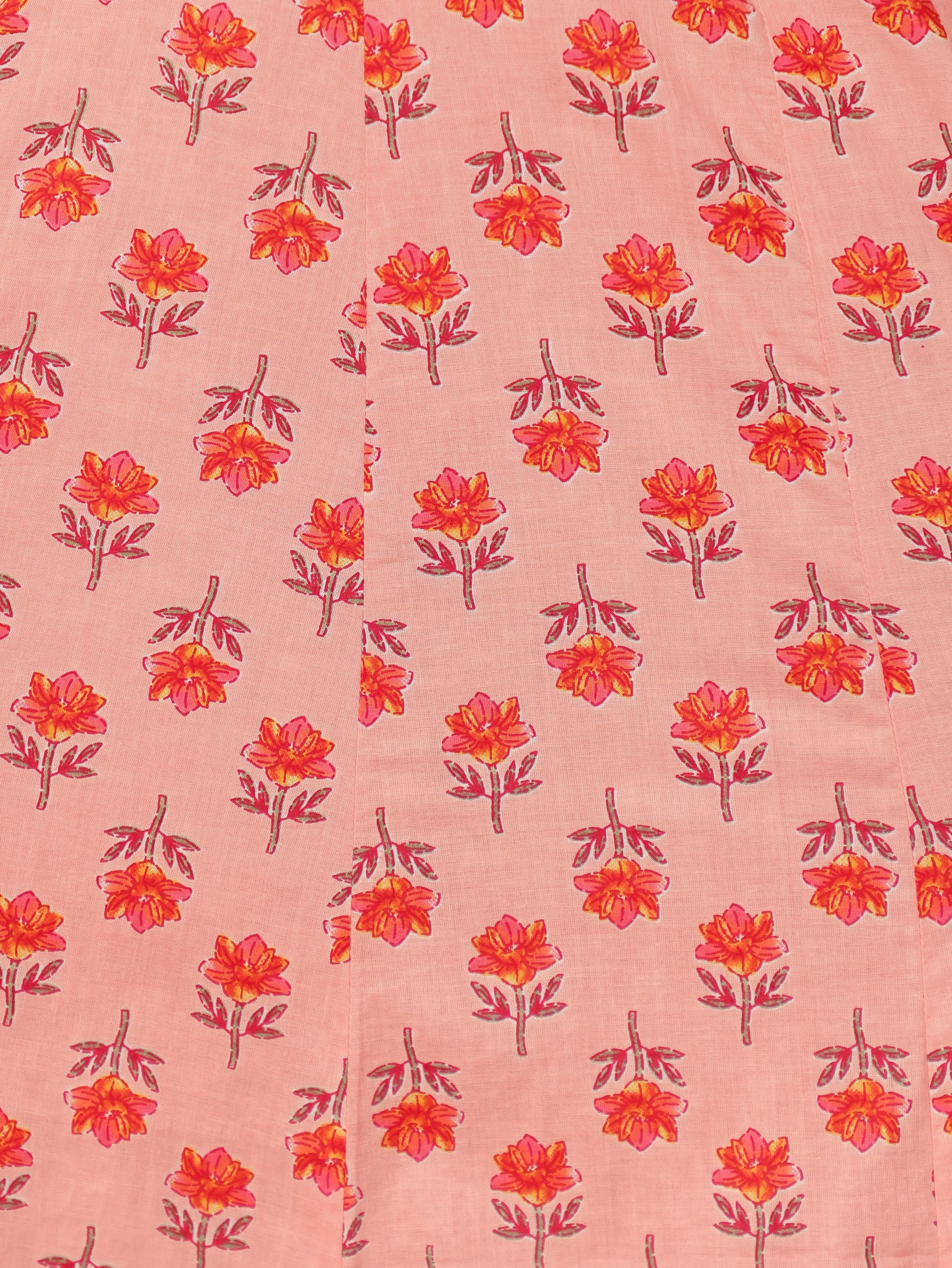 This Peach Flared kurta in soft Soft Cotton is a timeless pick for festive and casual wear. Designed with a V neckline and 3/4 Sleeve sleeves, its graceful Calf Length cut flatters all body types. The delicate Floral detailing adds a touch of sophistication. Pair it with statement earrings and juttis for a polished look. Maintain its pristine look by following proper care instructions.