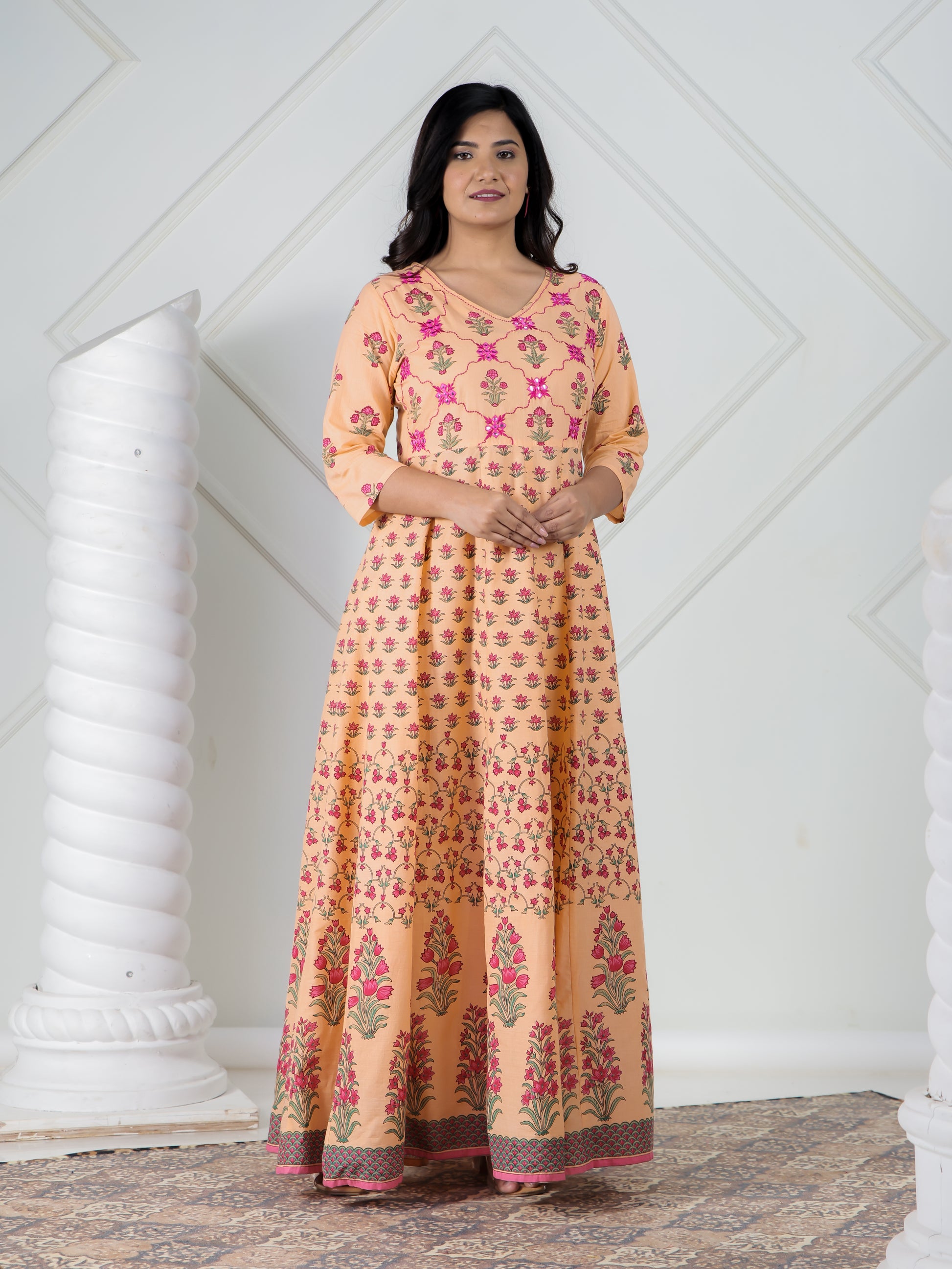 This Peach A-line kurta in soft Soft Cotton is a timeless pick for festive and casual wear. Designed with a V neckline and Elbow Length Sleeve sleeves, its graceful Calf Length cut flatters all body types. The delicate Floral detailing adds a touch of sophistication. Pair it with statement earrings and juttis for a polished look. Maintain its pristine look by following proper care instructions.